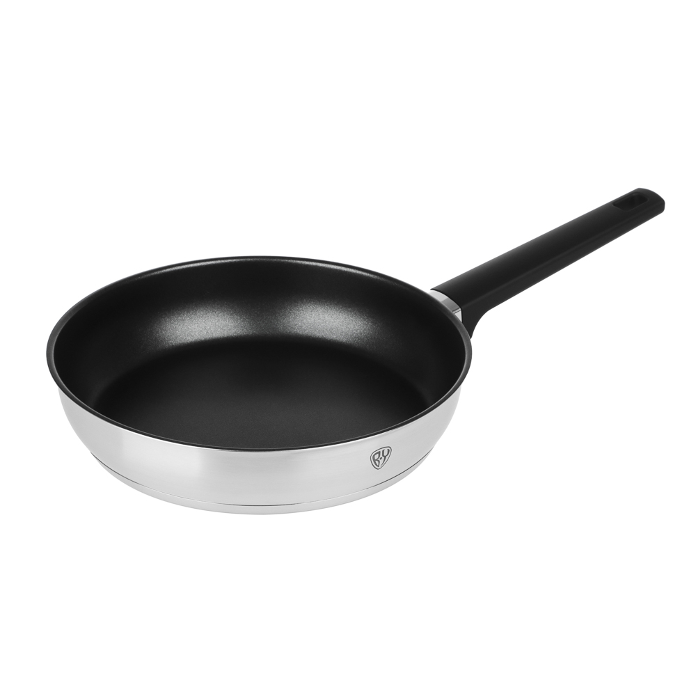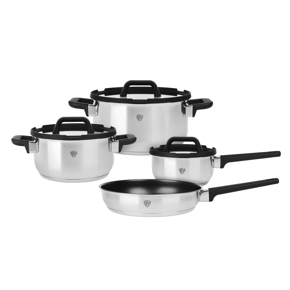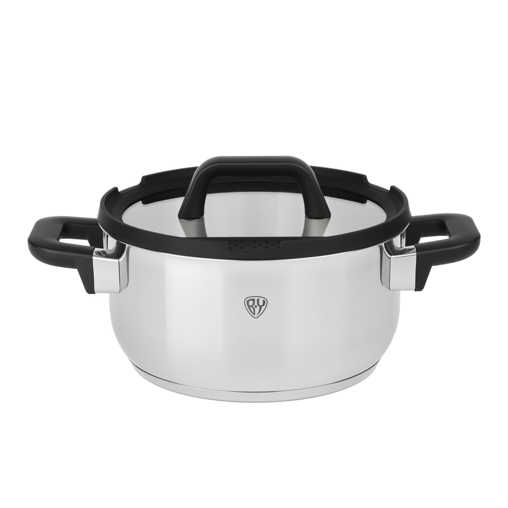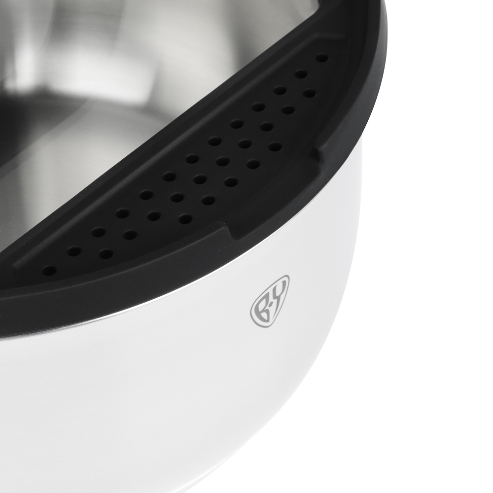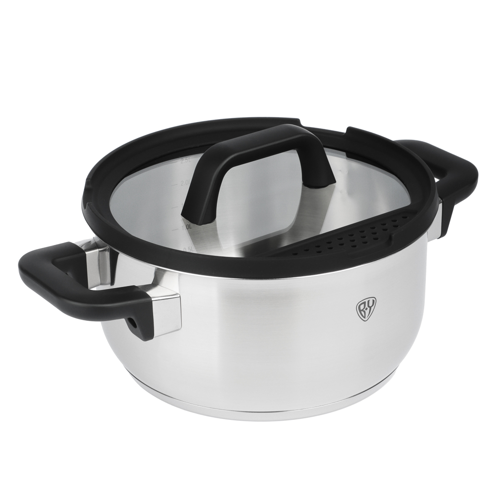 Набор кухонной посуды BY COLLECTION «Inta» из 7 предметов включает все необходимое для приготовления первых и вторых блюд, а также каш и соусов на домашней кухне. Состав комплекта: кастрюли 5 л; 3 л; ковш 1,5 л; сковорода 24 см и 3 крышки. Все предметы изготовлены из высококачественной нержавеющей стали марки AISI-304, обладающей высокой коррозионной стойкостью и прочностью. Кастрюли и сковорода имеют толстое капсульное дно для быстрого нагрева и равномерного приготовления пищи. Бакелитовые ручки не нагреваются, а крышки оснащены сливными отверстиями для удаления жидкостей при варке гарниров и овощей. Шкала объема на внутренних стенках позволяет точно дозировать количество ингредиентов. Сковорода с безопасным антипригарным покрытием позволяет готовить полезные блюда с минимальным количеством масла, а продукты не пригорают и не прилипают. Современный дизайн с хромированной отделкой и эргономичными ручками выигрышно смотрится в любом интерьерном стиле.