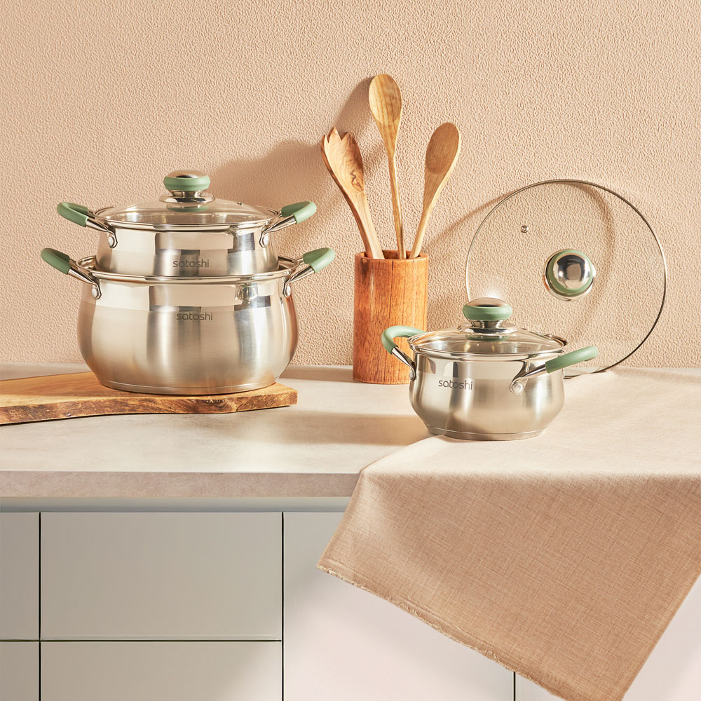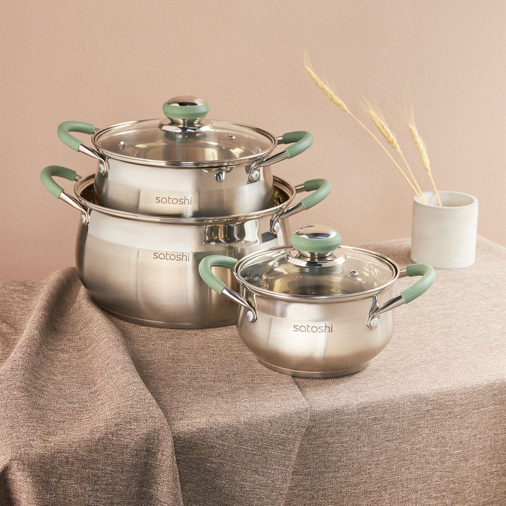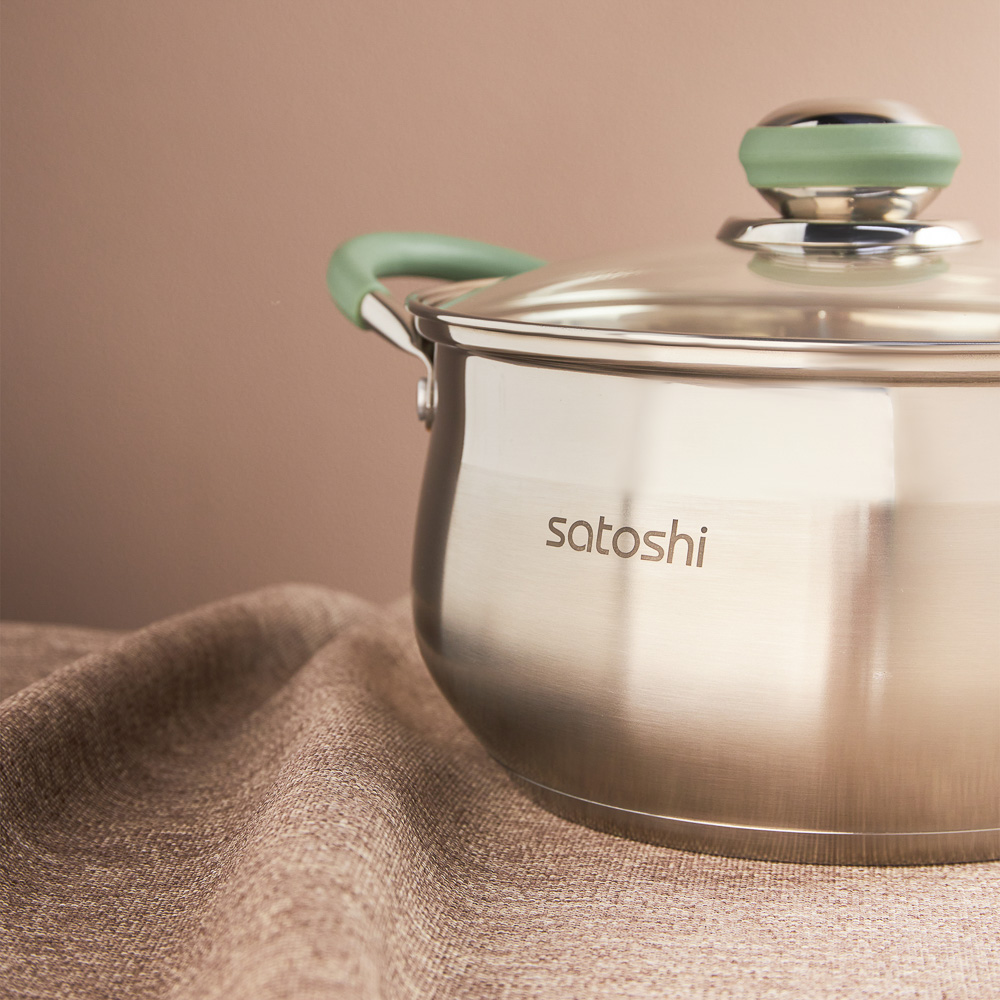 Набор кастрюль Satoshi Марли создан для тех, кто думает о качестве питания, но не забывает про экономию. Посмотрите, какой ансамбль — 3 емкости разного объема — 1,9, 3,6 и 6 литров. Обратите внимание — единый дизайн и все необходимые на кухне размеры. Готовьте первые и вторые блюда, соусы, десерты и сезонные заготовки. Кастрюля на 6 л — идеальное решение для приготовления супа на всю семью. 3,6 л — отличный выбор на каждый день для макарон и каш. Изделие 1,9 л — подходит для приготовления маленьких порций. 4 причины купить кастрюли из нержавеющей стали:• многослойное капсульное дно быстрее нагревается, равномерно распределяет энергию, ускоряет приготовление пищи• силиконовые ручки не плавятся под воздействием высоких температур• крышки из термостойкого стекла• подходит для всех типов плит, включая индукционные *объем кастрюли указан при наливании жидкости до краёв.