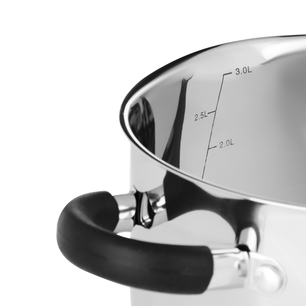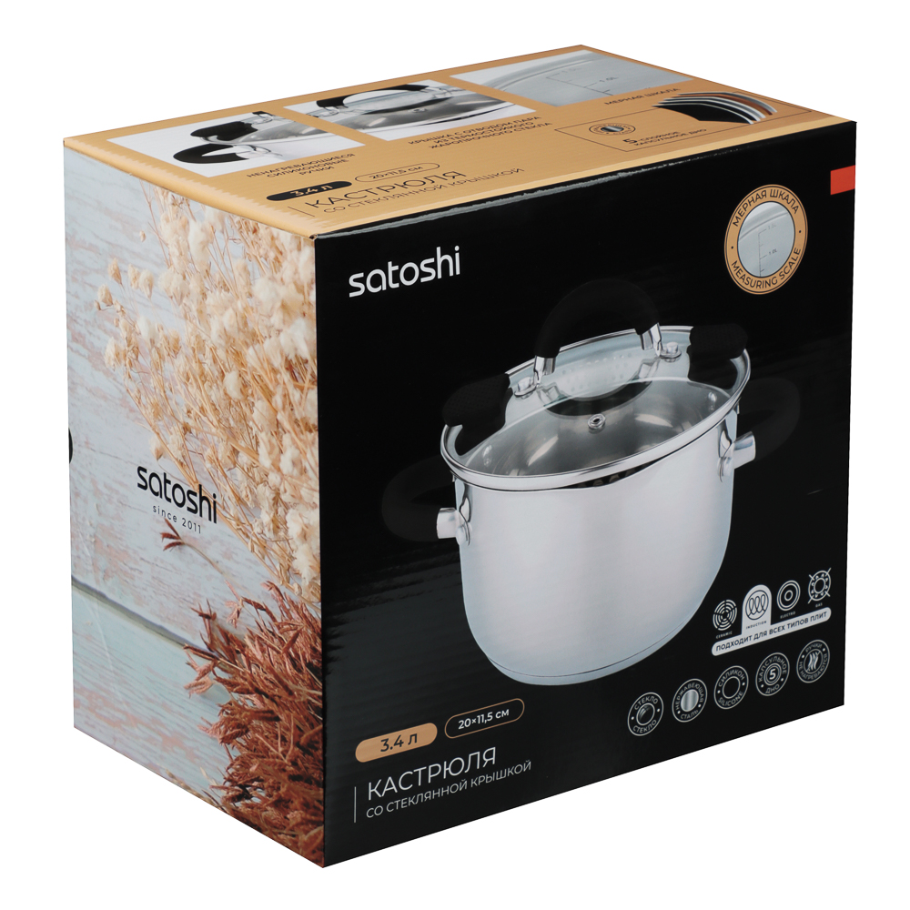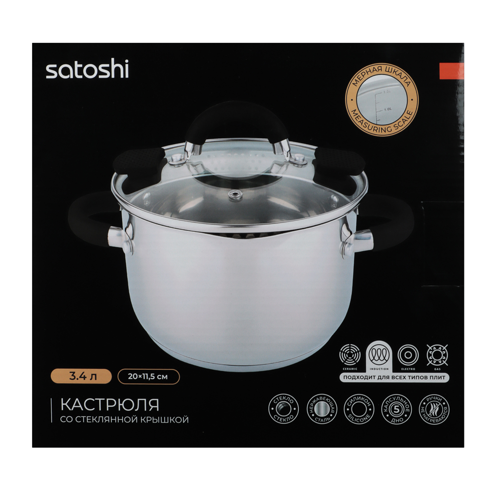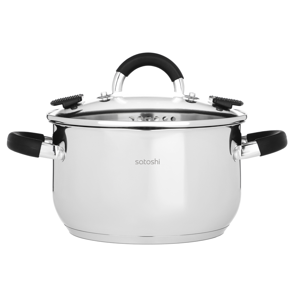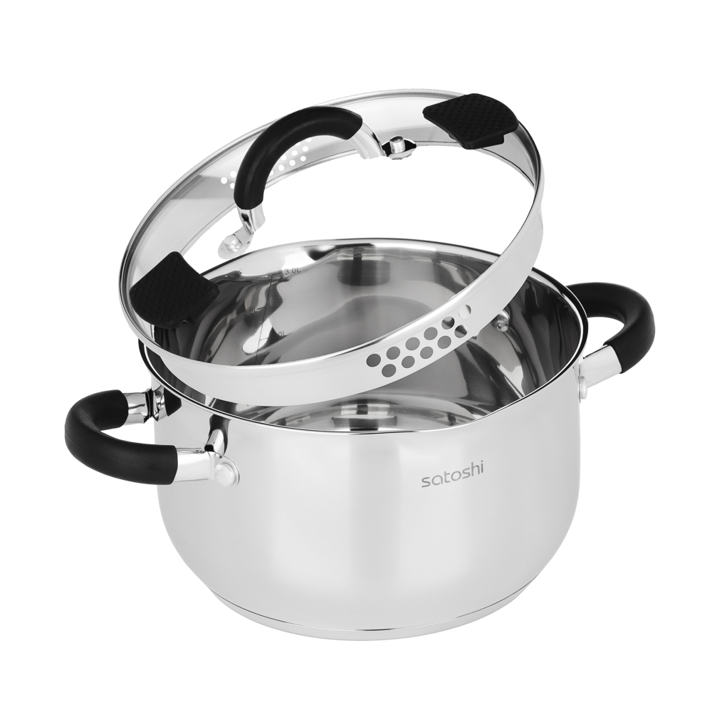 Кастрюля SATOSHI «Арбон» размером 20х11,5 см и объемом 3,4 л, со стеклянной крышкой с паровыпуском – это прекрасная помощница для приготовления первых блюд, варки гарниров и компотов. Изготовлена из высококачественной нержавеющей стали, имеет толстые стенки, устойчивые к деформации. Пятислойное капсульное дно обеспечивает равномерное распределение тепла, быстро нагревается и долго сохраняет температуру. Предусмотрена мерная шкала для замера точных объемов. Силиконовые протекторы ручек защищают руки от ожогов. Держатели на крышке для удобства слива жидкости и специальные отверстия для слива делают процесс использования максимально комфортным и эффективным, позволяя сливать лишнюю жидкость без попадания продуктов в раковину.