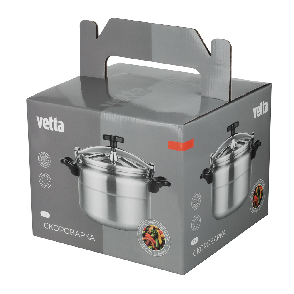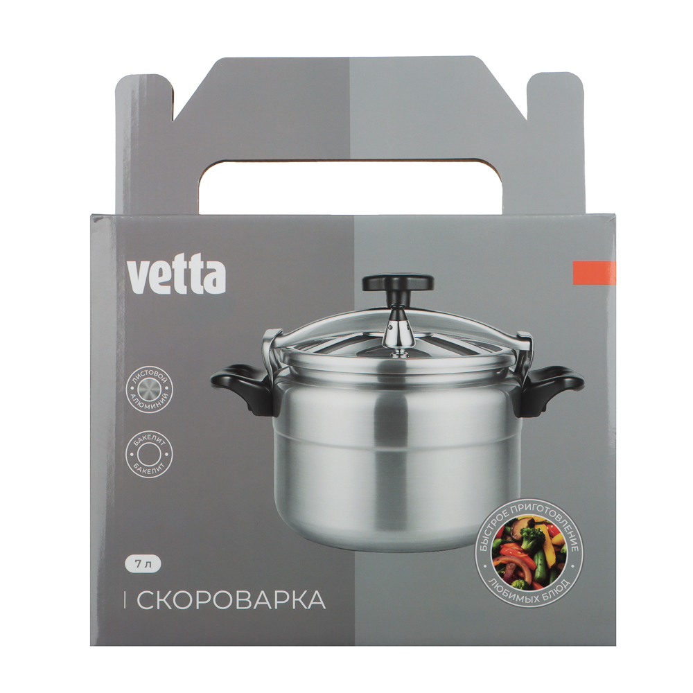 Скороварка VETTA, объем 7 л с корпусом из листового алюминия обеспечит быстрое приготовление любимых блюд с сохранением вкуса и насыщенного аромата каждого ингредиента. Незаменима для приготовления холодца, наваристых супов, каш, заготовок на зиму и других блюд. Высокая температура внутри скороварки способствует ускоренному приготовлению, при этом продукты сохраняют витамины и все полезные свойства. Кастрюля позволяет готовить блюда в собственном соку без добавления дополнительного жира и масла. Объем 7 л подходит для большой семьи. Значительно экономит время, проведенное на кухне, а также помогает экономить расход газа или электроэнергии. Ручки из бакелита не нагреваются. Скороварка легко моется, устойчива к деформации, рассчитана на долгие годы эксплуатации.