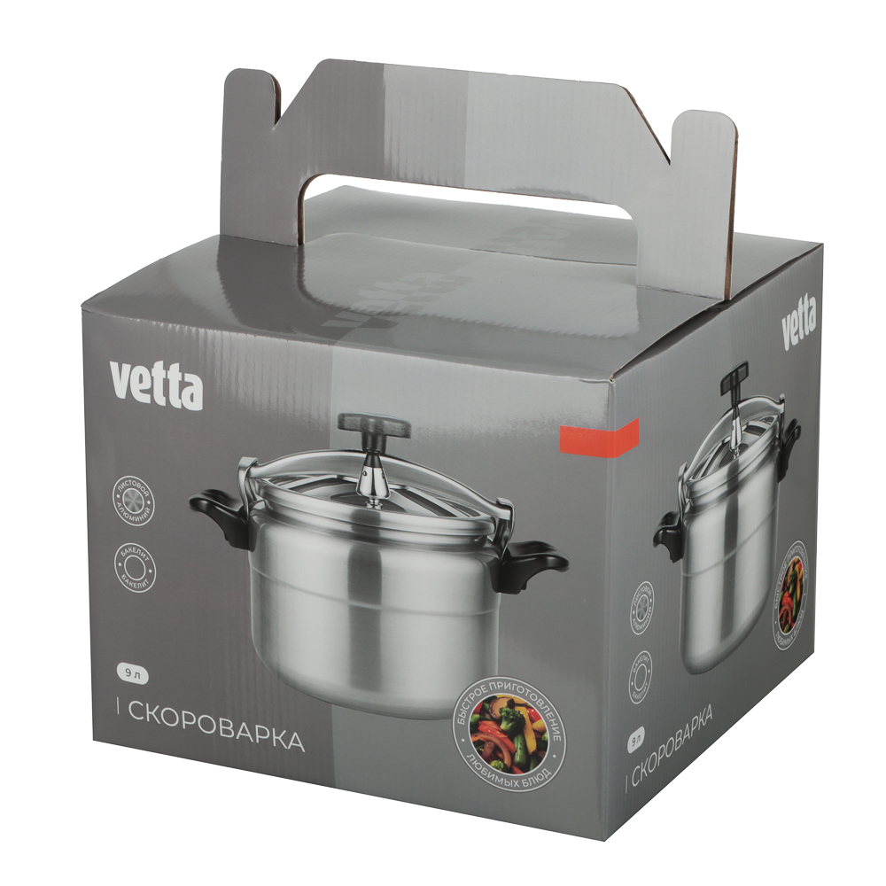Скороварка VETTA, объем 9 л с корпусом из листового алюминия и с ненагревающимися бакелитовыми ручками – это незаменимая помощница на домашней кухне, которая позволит готовить полезные блюда максимально быстро. Благодаря герметичности и высокому давлению, которое образуется во время нагрева, она готовит в несколько раз быстрее обычной кастрюли, экономя ваше время и до 70% электроэнергии. Алюминиевый корпус обеспечивает мгновенный и равномерный нагрев, а объем 9 л идеально подходит для приготовления больших порций первых и вторых блюд, тушения мяса до идеальной мягкости и создания кулинарных шедевров без лишних хлопот при этом сохраняя все витамины, аромат, вкус и полезные свойства продуктов. Идеальна для приготовления супов и тушеных блюд. Нетребовательна в уходе: легко моется, не подвержена коррозии и устойчива к деформации.