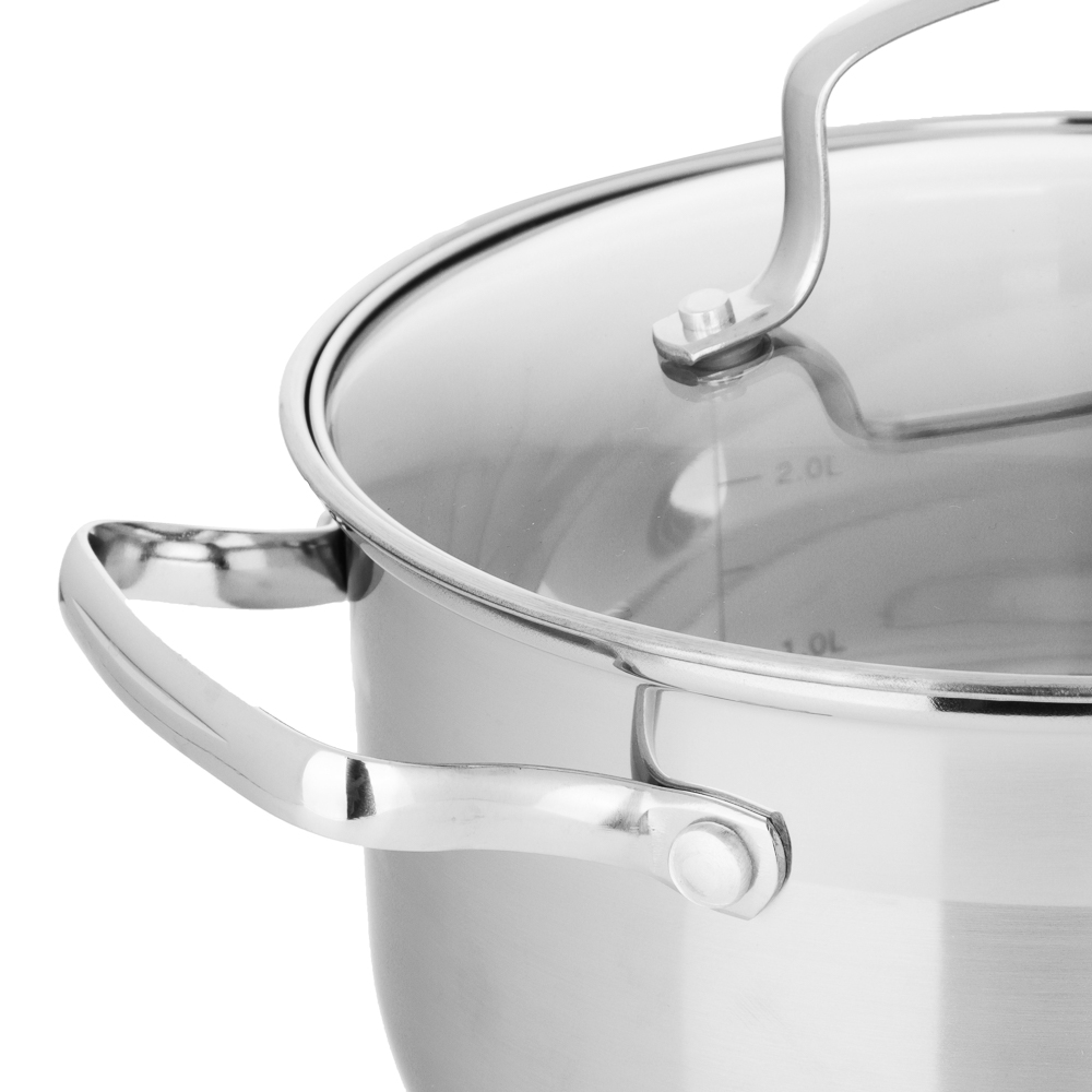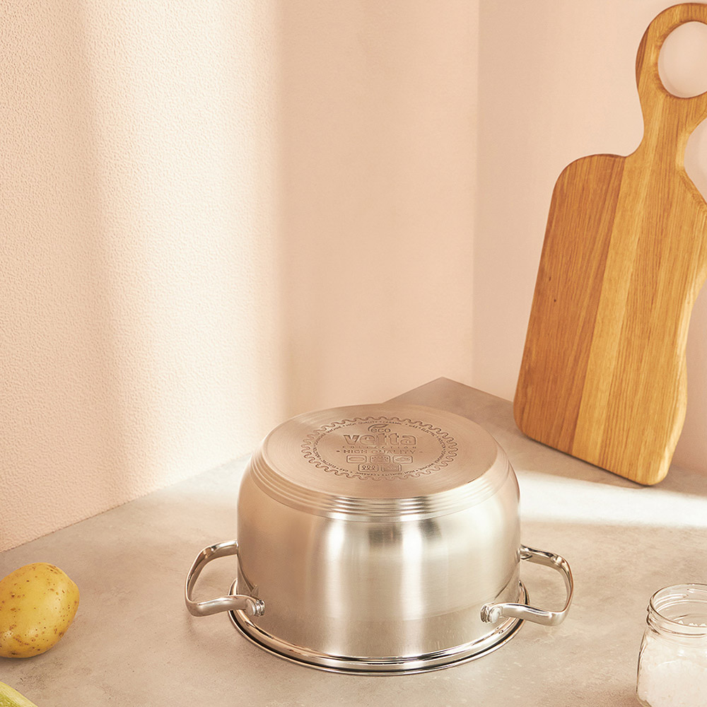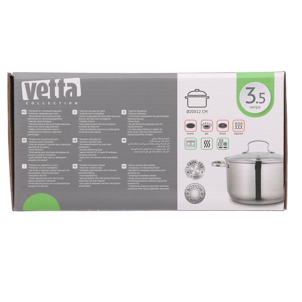 Серия посуды «Берн» — это элегантные кастрюли со стеклянными крышками. Капсульное дно равномерно распределяет тепло и предотвращает пригорание пищи. Посуда из нержавеющей стали не окисляется, материал не впитывает и не выделяет запахи, что положительно влияет на вкус пищи. Идеально подходит для готовки и длительного хранения в холодильнике. Посуда из нержавеющей стали имеет высокую прочность и экологически безопасна. Кастрюли VETTA — это новое поколение кухонной утвари, с которой готовка проходит быстрее и качественнее. Размер 20х12 см, объем 3,5 л. 6 причин купить кастрюлю нержавеющей стали торговой марки VETTA:• капсульное дно ускоряет процесс приготовления,• стеклянная крышка с отводом для пара,• подходит для всех типов плит,• можно мыть в посудомоечной машине,• можно хранить пищу в холодильной камере,• мерная шкала на внутренней стенке. *объем кастрюли указан при наливании жидкости до краёв.