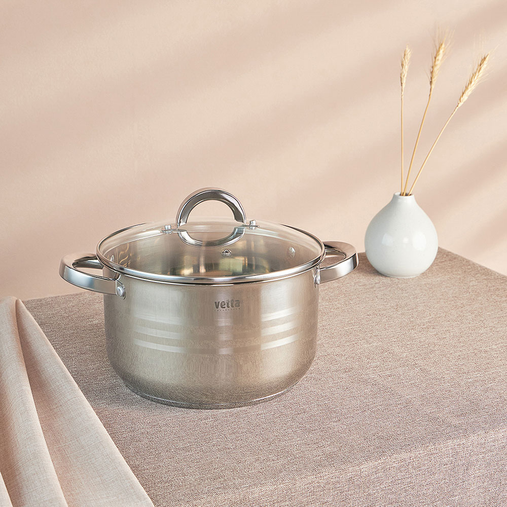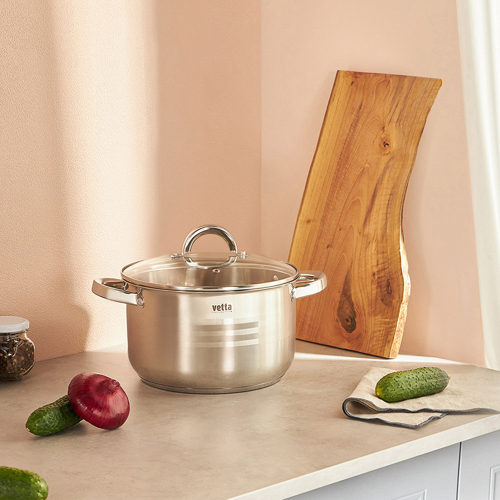 Кастрюля VETTA Фултон объемом 5,4 л и размером 24х14 см станет вашим надежным помощником на кухне. Изготовленная из нержавеющей стали, она устойчива к коррозии, долговечна и легко очищается. Капсульное дно с теплораспределительным слоем обеспечивает равномерный нагрев и позволяет использовать кастрюлю на всех типах плит, включая индукционные. Стеклянная крышка с регулируемым пароотводом помогает контролировать влажность внутри посуды, что особенно важно при приготовлении изысканных блюд. Прозрачная крышка также позволяет наблюдать за процессом готовки, сохраняя аромат блюд. Удобные ручки надежно закреплены, однако они нагреваются во время готовки — рекомендуется использовать прихватки для безопасности.Кастрюля легко моется вручную или в посудомоечной машине, что делает уход за ней максимально простым. Стильная, практичная и функциональная, посуда VETTA Фултон идеально подходит как для ежедневного использования, так и для особых кулинарных экспериментов!
