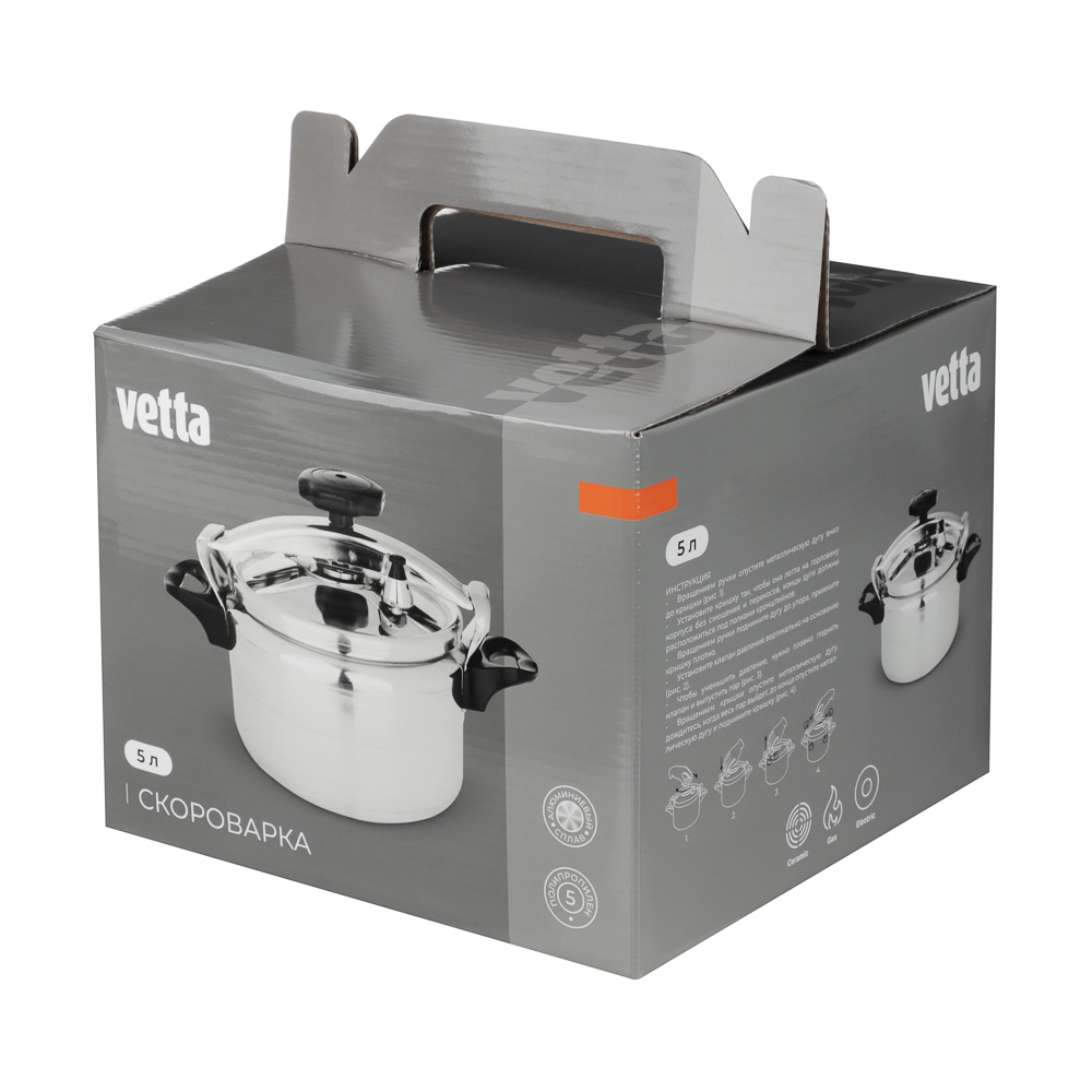 Скороварку Vetta очень легко использовать. Даже на медленном огне блюда тушатся быстрее, чем в обычной кастрюле. Теперь вы можете готовить вкусные и полезные обеды для всей семьи быстрее, а сэкономленное время посвящать досугу. В скороварке картофель варится всего 15 минут, когда в классической посуде целых 30. Если хотите дольше сохранять блюдо теплым, закройте емкость крышкой и оставьте на плите. Благодаря 100% герметичности тепло не испарится. 7 причин купить скороварки Vetta:• сверхпрочный алюминий• оптимальное распределение тепла• герметичная крышка• готовка без выкипания• сохранение природного вкуса ингредиентов• даже если семья опоздала на ужин, еда долгое время остается теплой• экономия времени и ресурсов за счет готовки в герметичном пространстве.