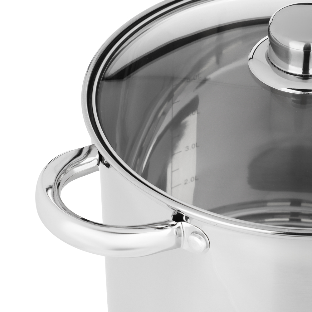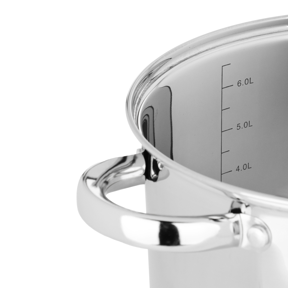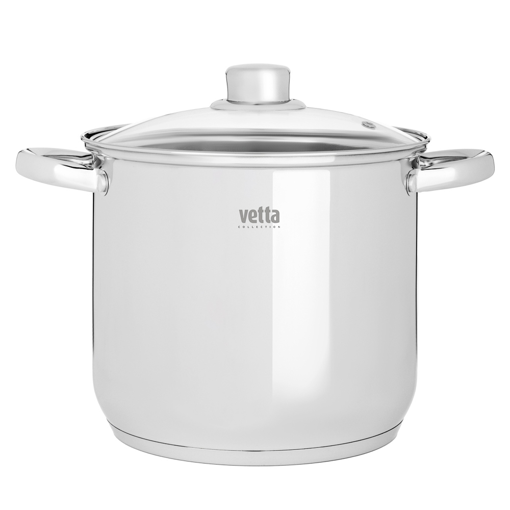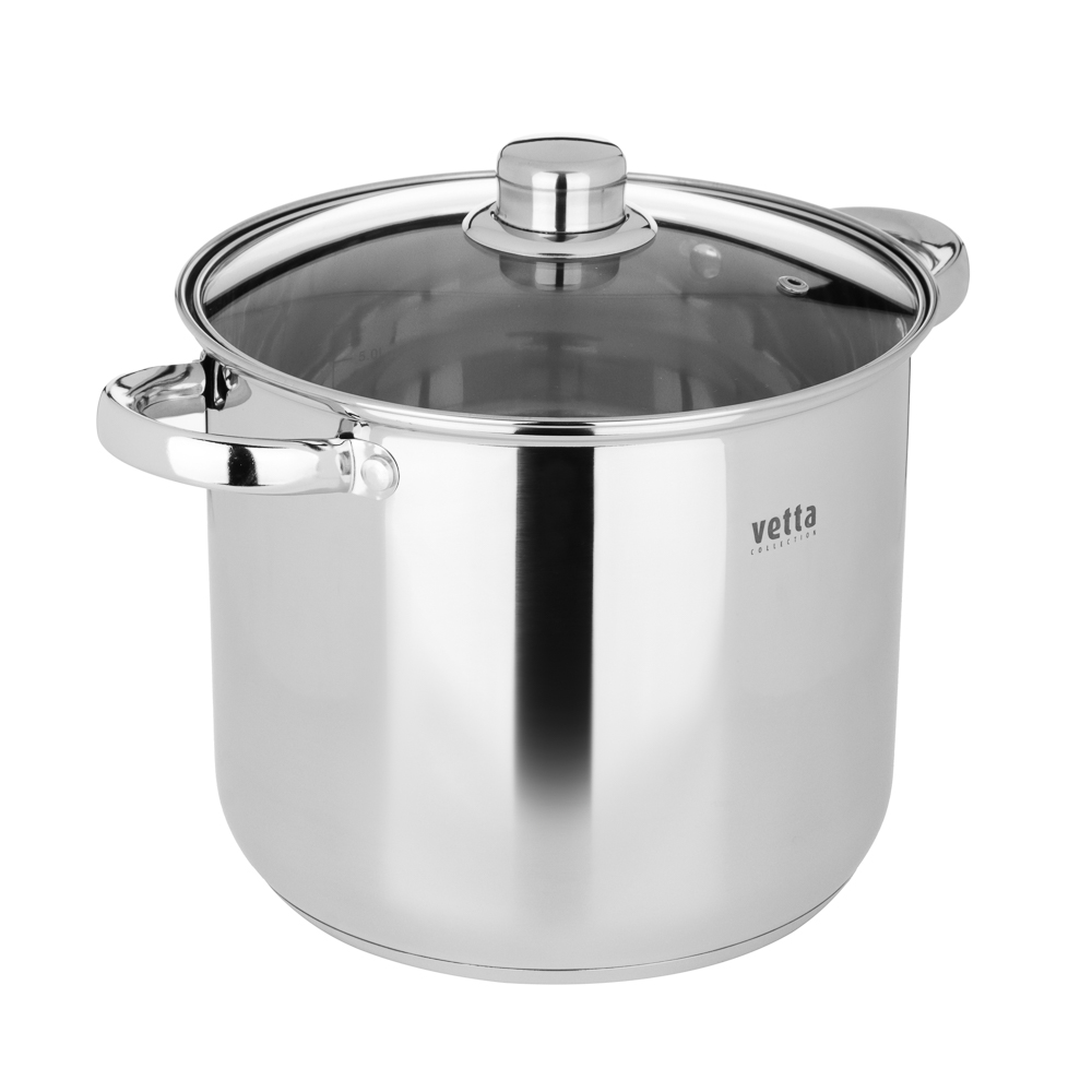 Кастрюля VETTA Орландо размером 22х19 см и объемом 7 л, со стеклянной крышкой с паровыпуском – это прекрасная помощница для приготовления первых блюд, варки гарниров и компотов. Изготовлена из высококачественной нержавеющей стали, имеет толстые стенки, устойчивые к деформации. Пятислойное капсульное дно обеспечивает равномерное распределение тепла, быстро нагревается и долго сохраняет температуру. Предусмотрена мерная шкала для замера точных объемов. Подходит для всех типов плит, включая индукционные. Легко моется, можно использовать в посудомоечной машине.
