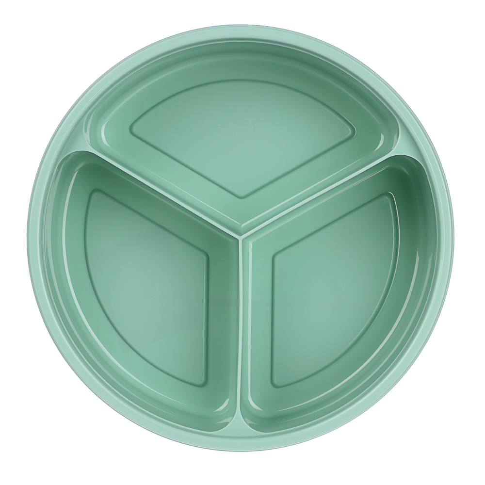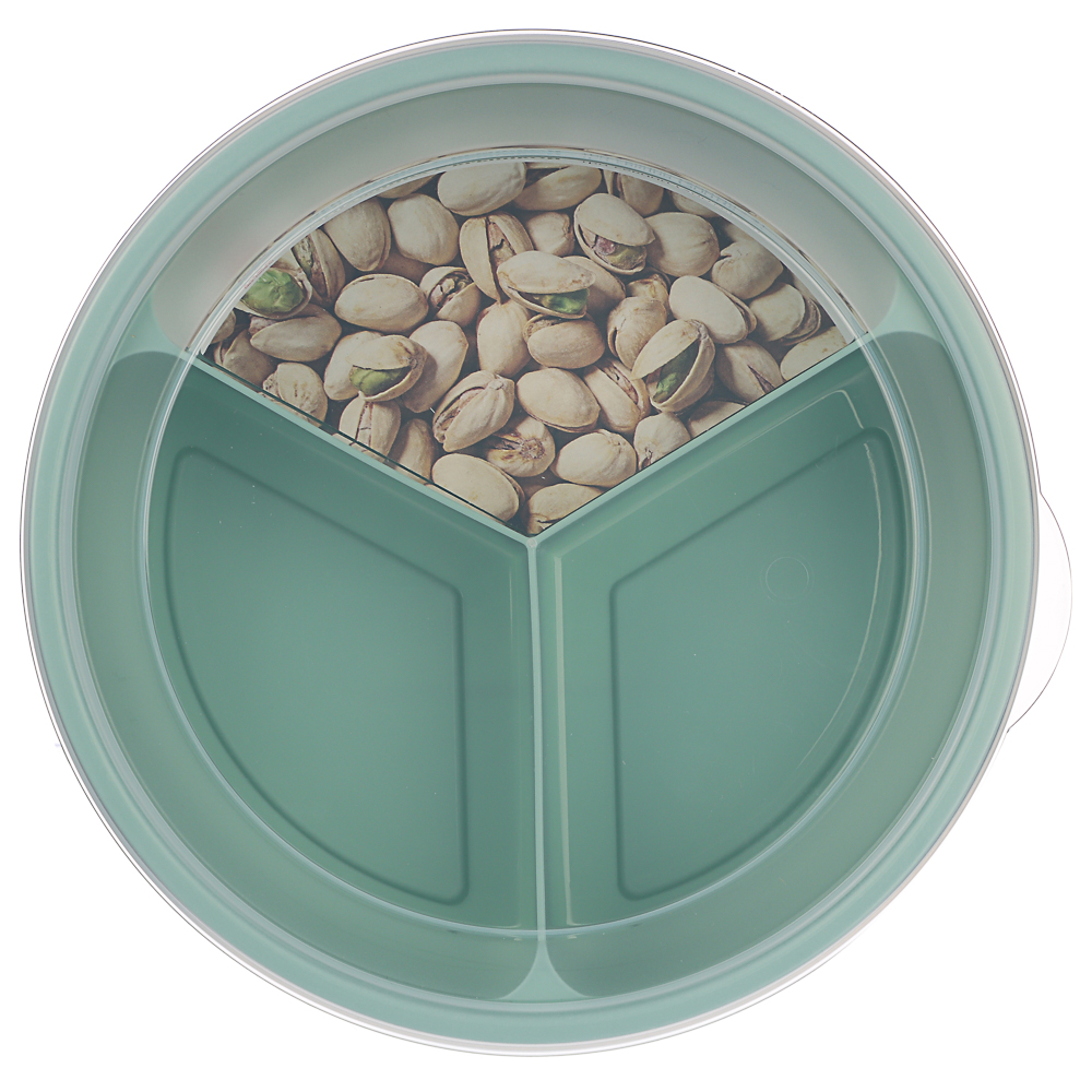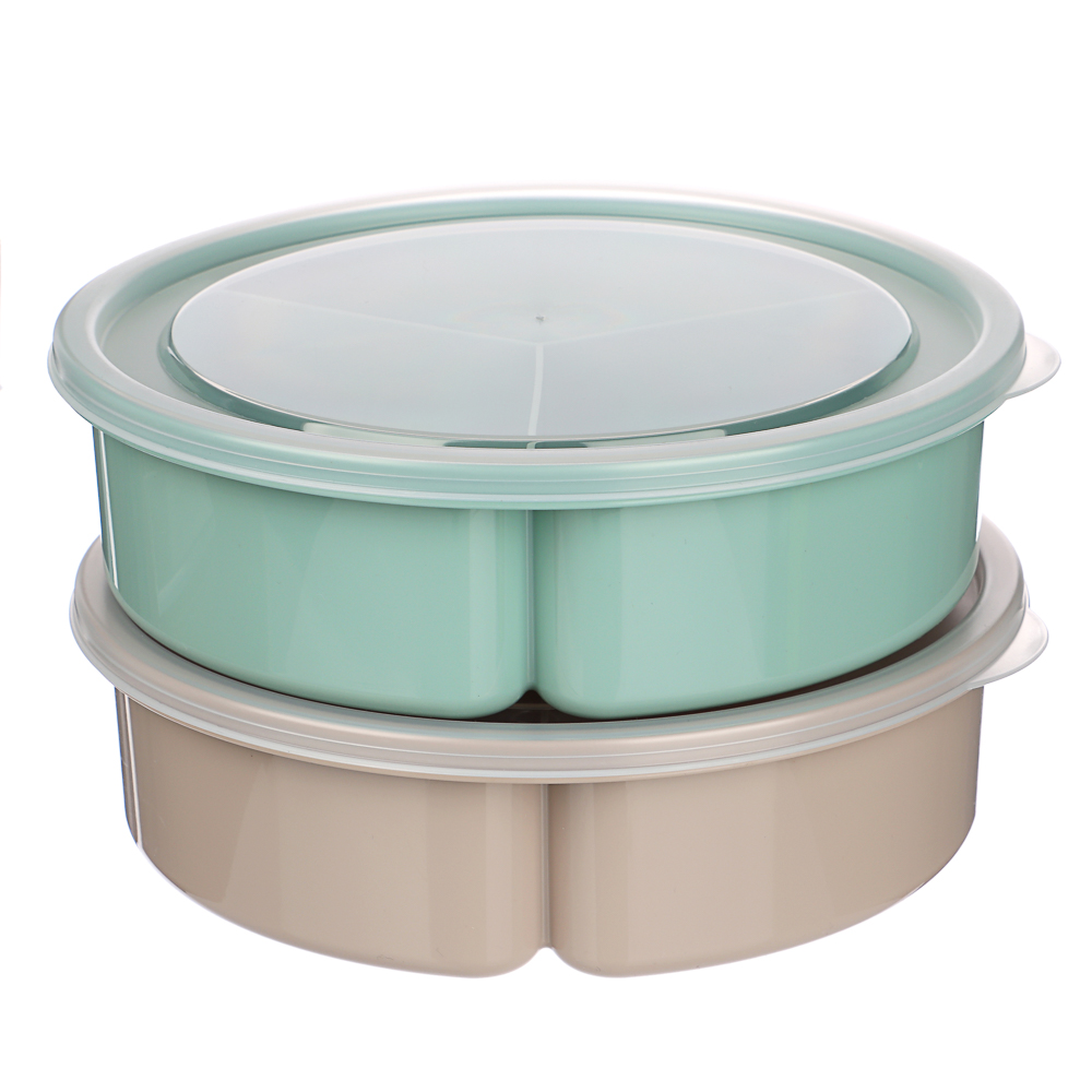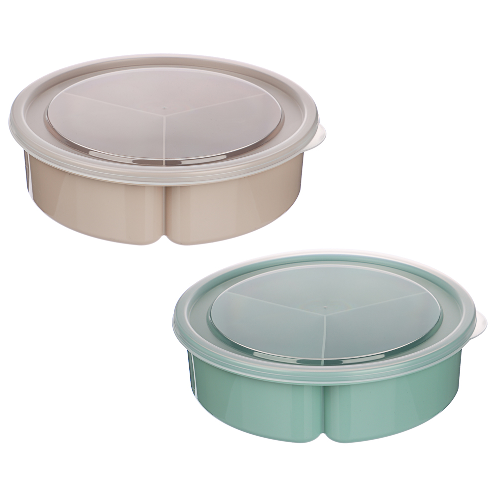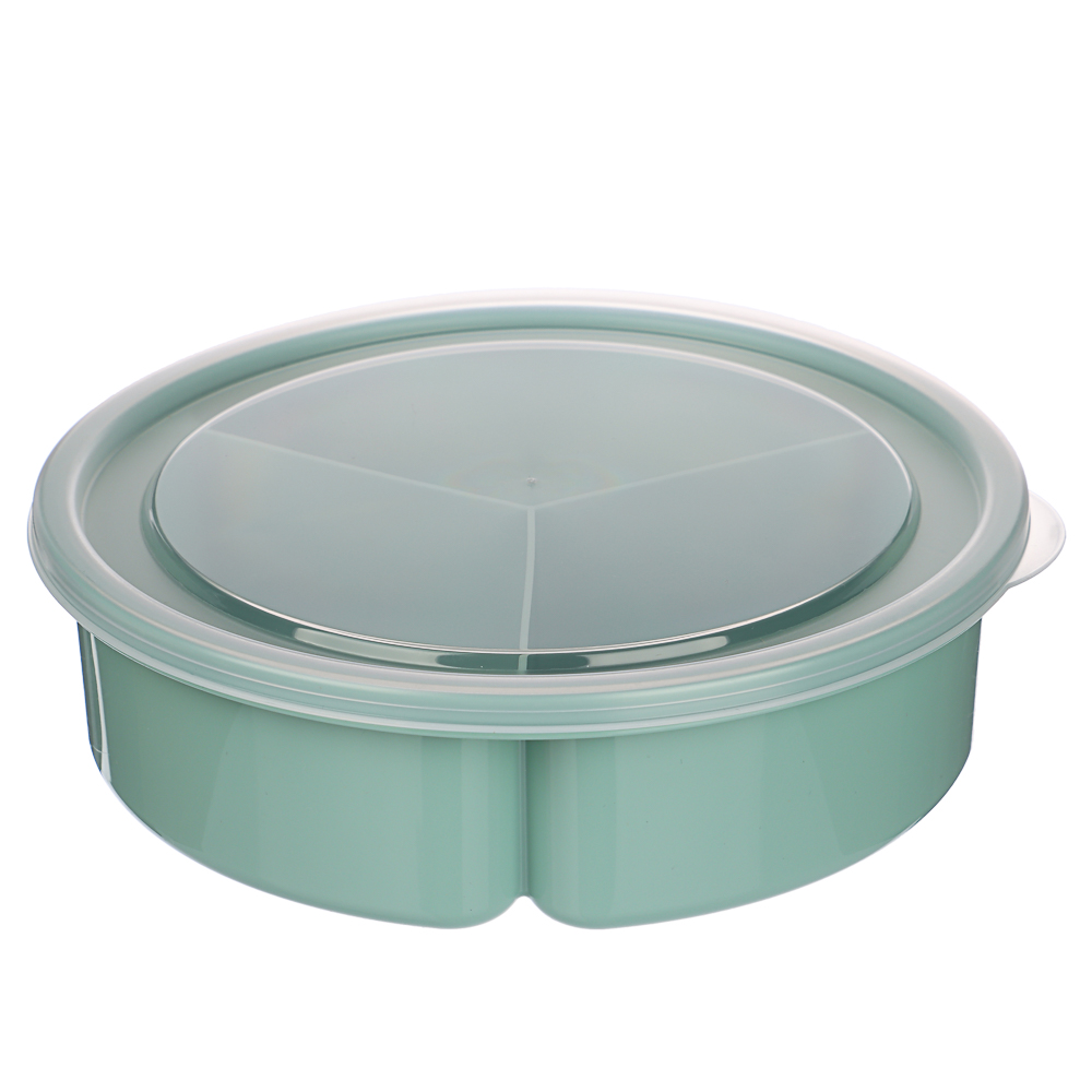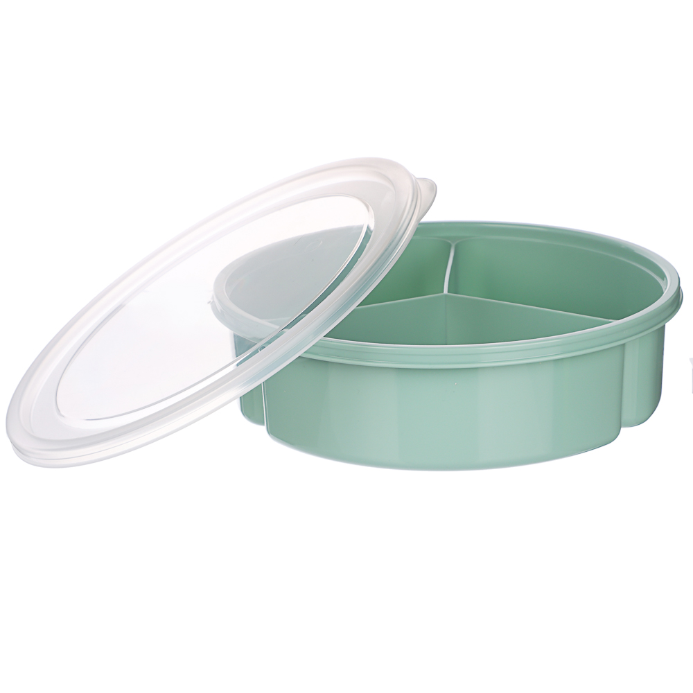 Контейнер-менажница с крышкой – идеальное решение для хранения и подачи различных блюд. Объём контейнера составляет 0,9 л, диаметр – 20 см. Он состоит из трёх секций по 300 мл каждая, что позволяет удобно разместить разные закуски или салаты, не смешивая их между собой. Крышка надёжно сохраняет содержимое ячеек в закрытом положении. Контейнер изготовлен из качественного пластика, который безопасен для здоровья и прост в уходе.