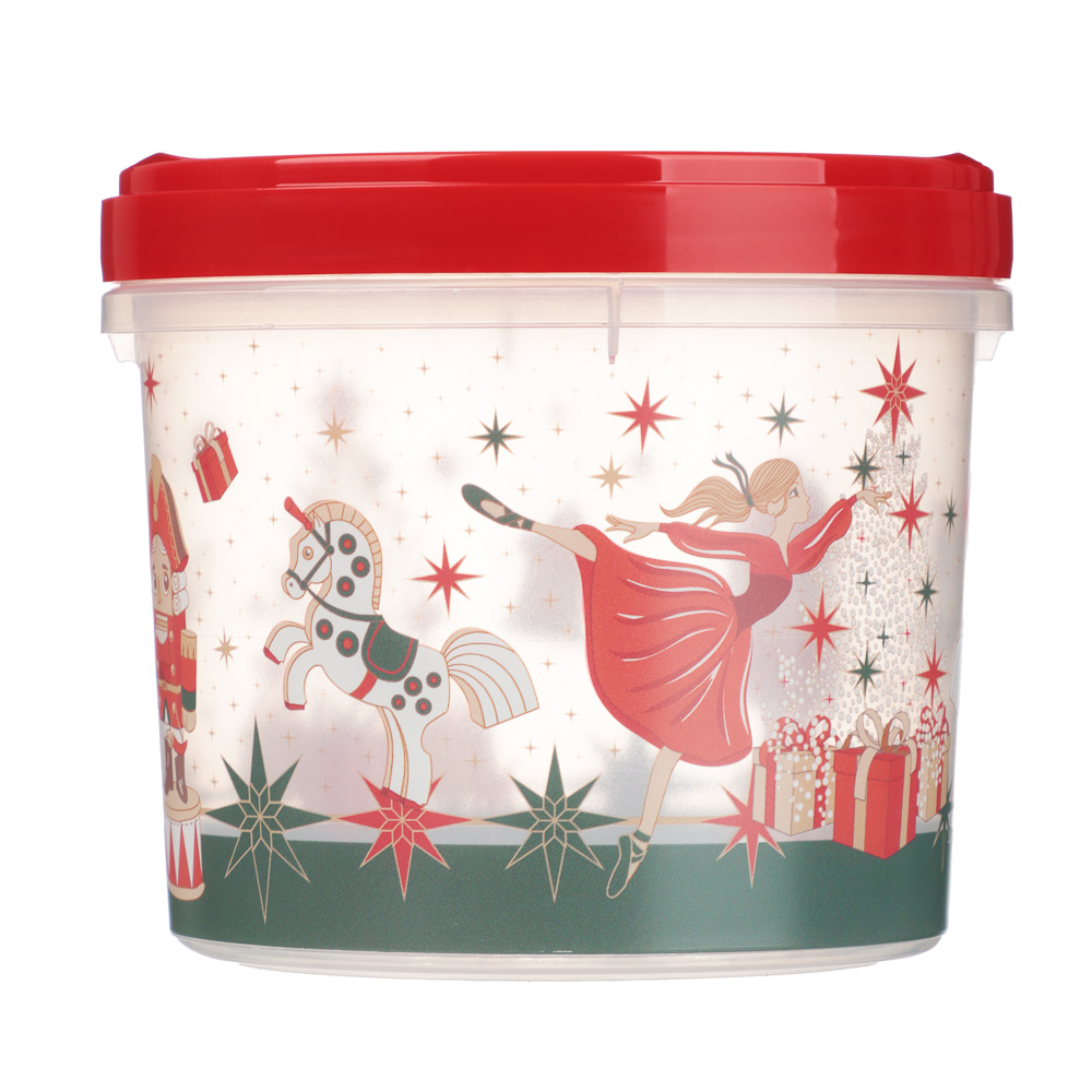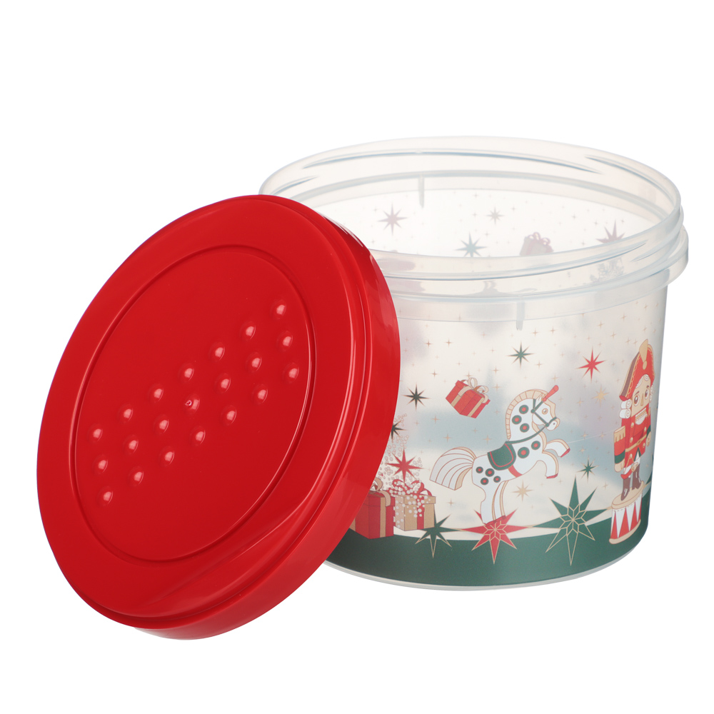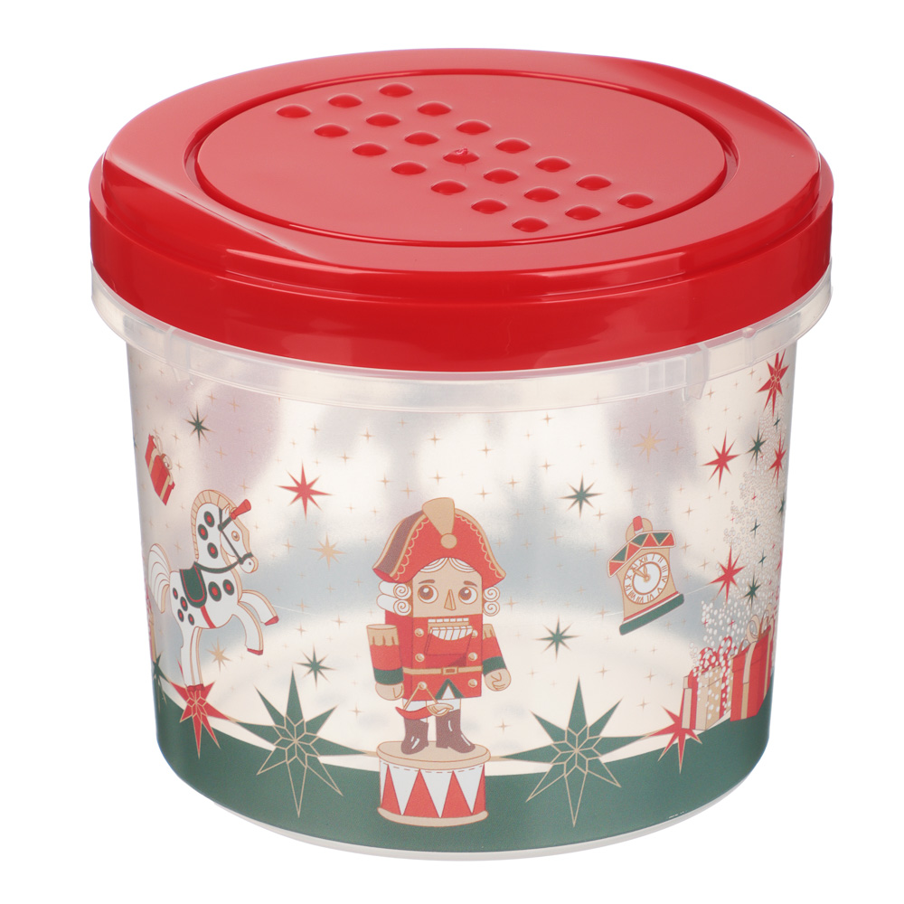 Яркая и удобная банка из новогодней коллекции Щелкунчик объёмом 0,7 л — идеальное решение для хранения печенья, орехов, сухофруктов, конфет или других продуктов. Изготовлена из прочного, безопасного пластика, легко моется. Прозрачные стенки позволяют видеть содержимое, а красная завинчивающаяся крышка надёжно защищает продукты от влаги, запахов и насекомых. Весёлый новогодний рисунок создаёт тёплое и волшебное настроение. Идеальный выбор как для себя, так и в качестве подарка!