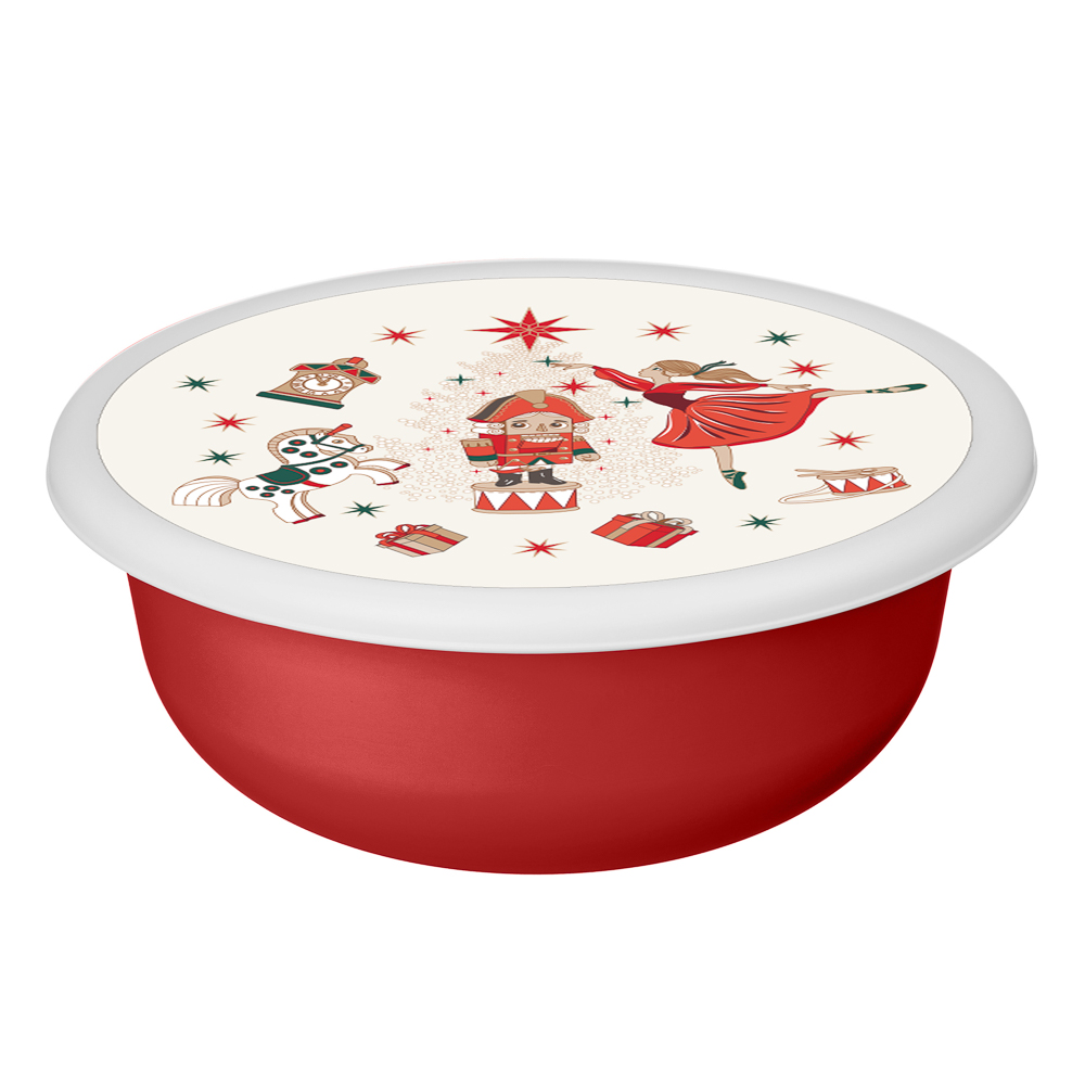 Яркая и удобная миска из новогодней коллекции Щелкунчик объёмом 1,2 л станет настоящим украшением кухни в праздничные дни. Изготовлена из прочного, безопасного пластика. Красный корпус сочетается с белой крышкой, на которой изображен тематический рождественский рисунок — всё это создаёт тёплое и волшебное настроение. Плотная крышка надёжно закрывается, защищая содержимое от запахов, влаги и насекомых. Подходит для хранения фруктов, овощей, салатов, выпечки или приготовленных блюд. Также может использоваться как декоративный элемент на столе. Идеальный выбор как для себя, так и в качестве подарка.