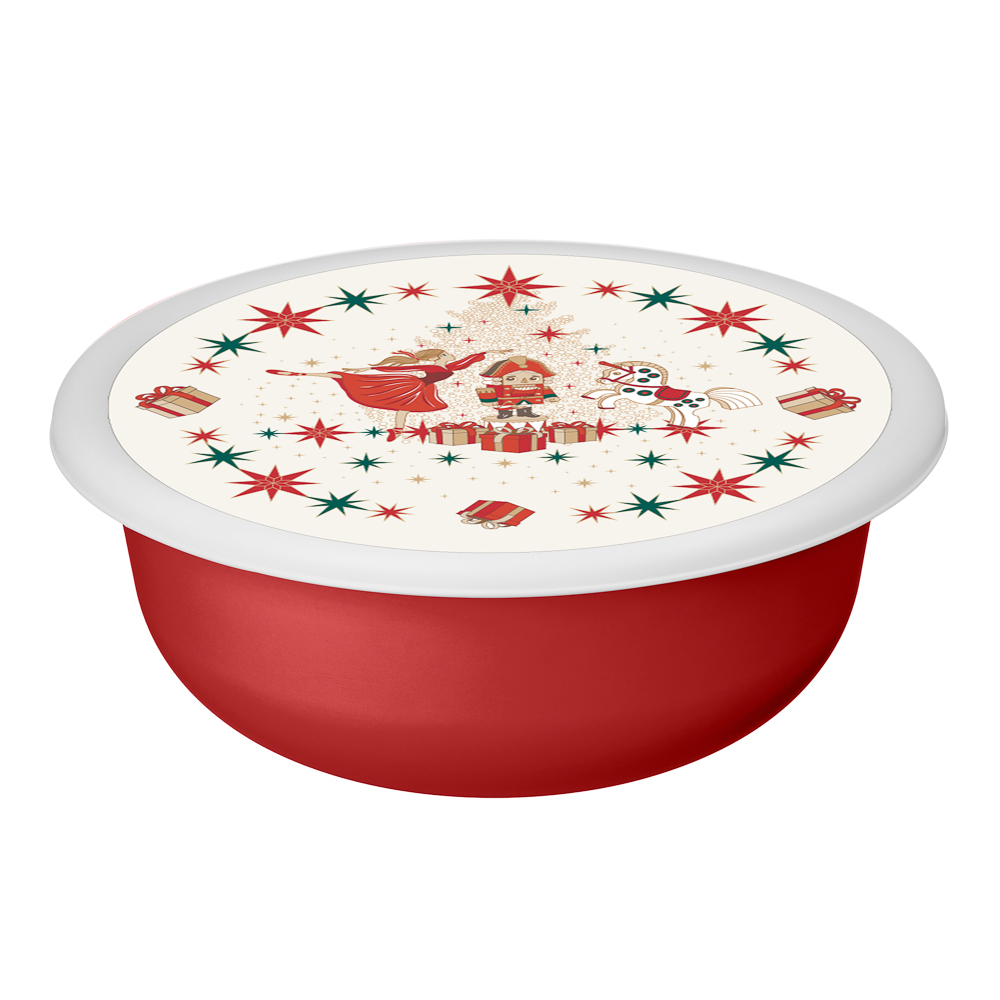 Яркая и удобная миска из новогодней коллекции Щелкунчик объёмом 2,1 л станет настоящим украшением кухни в праздничные дни. Изготовлена из прочного, безопасного пластика. Красный корпус сочетается с белой крышкой, на которой изображен тематический рождественский рисунок — всё это создаёт тёплое и волшебное настроение. Плотная крышка надёжно закрывается, защищая содержимое от запахов, влаги и насекомых. Подходит для хранения фруктов, овощей, салатов, выпечки или приготовленных блюд. Также может использоваться как декоративный элемент на столе. Идеальный выбор как для себя, так и в качестве подарка.