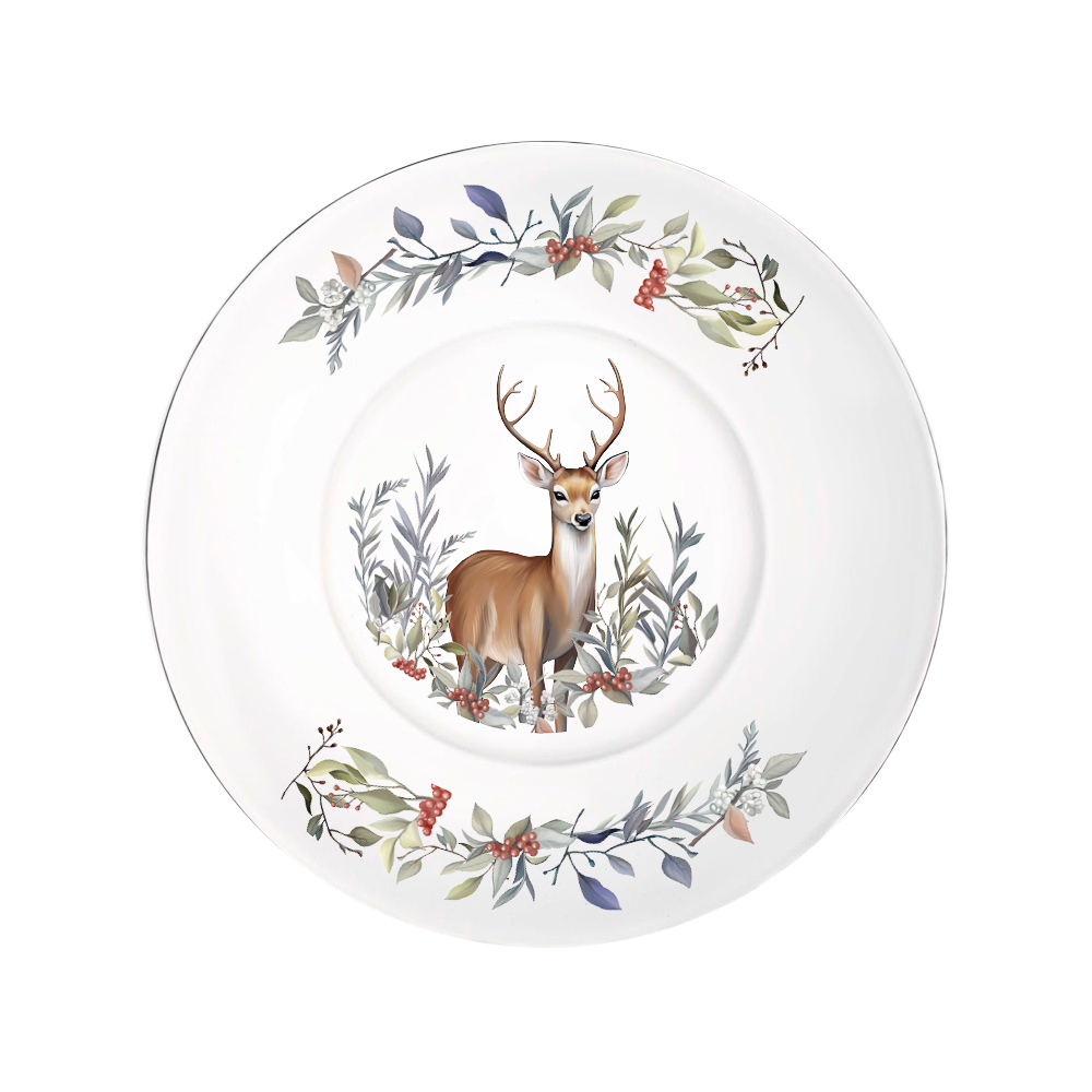 Тарелка обеденная ОСЗ Олень 25 см – это изысканный и уютный предмет посуды, выполненный из прочного стекла. Идеальна для подачи основных блюд, гарниров, десертов. Центральное место на тарелке занимает живописное изображение благородного оленя с ветвистыми рогами, стоящего среди зимнего леса, что создает атмосферу природной гармонии и тепла. Такой дизайн особенно актуален в новогодний и рождественский период, но отлично смотрится и в повседневной обстановке. Стекло устойчиво к перепадам температур, легко моется.