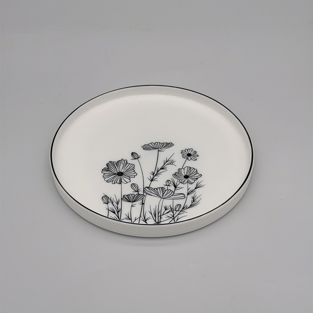 Тарелка десертная MILLIMI «Адриа» 20x2,1 см из опалового стекла подходит для фуршетов, банкетов и семейных обедов. Стильная тарелка белого цвета с контрастной черной отводкой и с монохромным лаконичным цветочным орнаментом добавляет выразительности и художественной эстетики в сервировку стола. Размер оптимален для порционной подачи торта, пирожных, печенья, фруктовых нарезок и других десертов. Опаловое стекло отличается высокой степенью гигиеничности и практичностью: не впитывает запахи, легко моется и устойчиво к механическим повреждениям при аккуратном использовании.