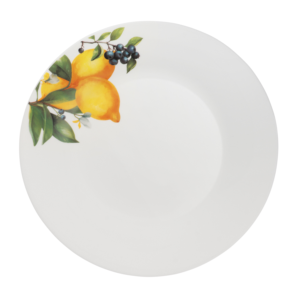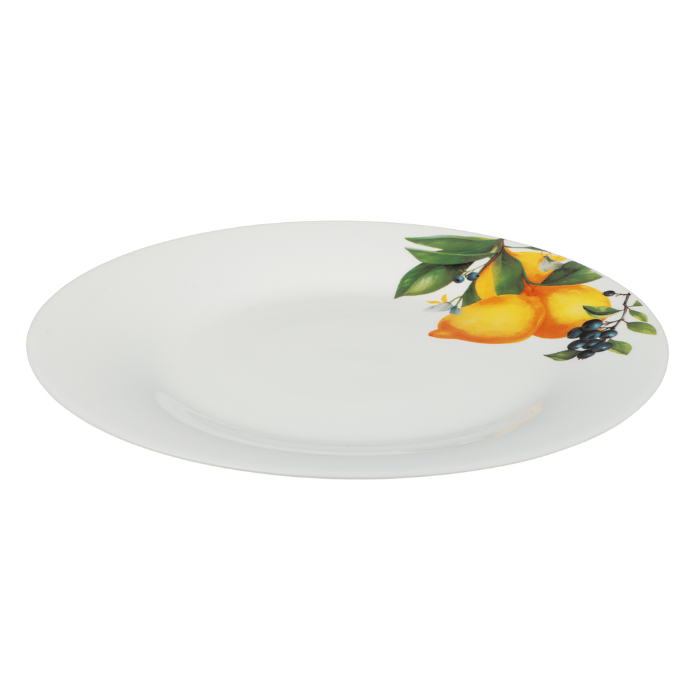 Тарелка подстановочная MILLIMI Лимоны — стильное решение для вашей сервировки. Тарелка диаметром 25 см изготовлена из качественного опалового стекла и украшена сочным рисунком лимонов на белом фоне. Такой дизайн наполнит стол летним настроением и средиземноморским шармом. Тарелка-подставка идеально подходит для создания многоуровневой сервировки: используйте её как основу для десертных тарелок, пиал или даже для подачи закусок и сыров. Яркий рисунок с лимонами эффектно контрастирует с любой однотонной посудой, делая сервировку интересной и завершённой.
