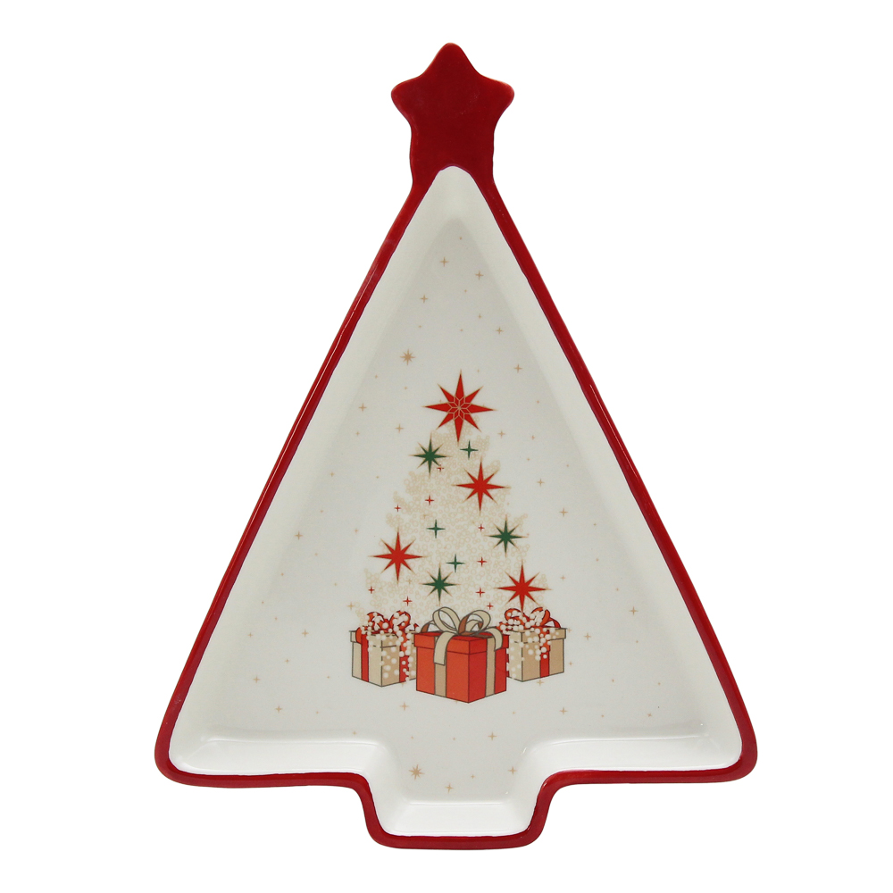 Блюдо в форме ёлки MILLIMI «Щелкунчик», 21х16х2,5 см из новогодней коллекции создаст атмосферу волшебного праздника на вашем столе, а также может стать трогательным подарком для близких. Блюдо из белой керамики с принтом в традиционных новогодних оттенках красного и зеленого гармонично впишется в тематический интерьер и добавит яркого акцента в оформление стола. Прекрасно сочетается с белой и цветной посудой, а также со столовым текстилем различных расцветок. Может использоваться для подачи рождественских десертов, а также закусок и канапе.