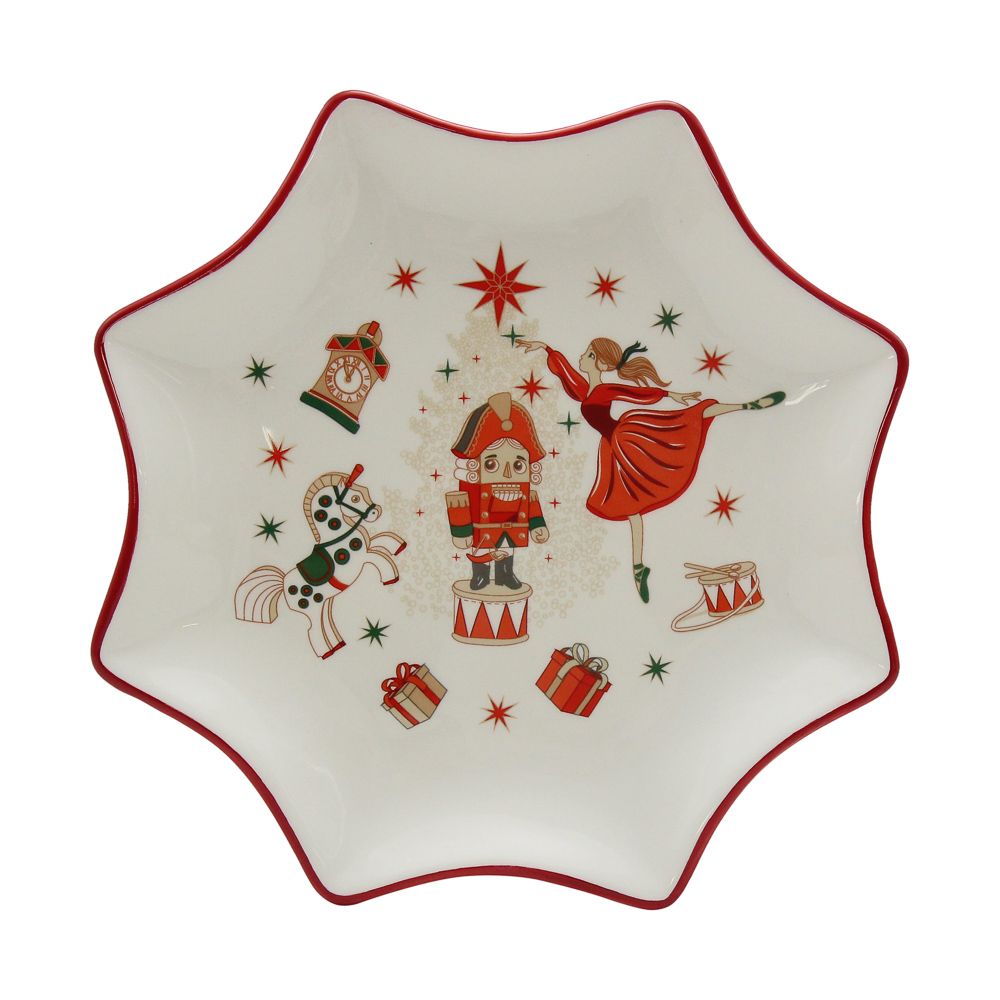 Блюдо в форме звезды MILLIMI «Щелкунчик», 20х20х2 см из керамики – это посуда, разработанная специально для новогодней сервировки. Ярко-красная отводка по периметру и красочный тематический принт создают эстетичный контраст с белой керамикой, делая сервировку выразительной и торжественной. Блюдо сочетается как с белой, так и с цветной посудой. Подходит для подачи закусок и сладостей на общий стол. Легко моется без образования сколов, царапин и трещин. Хорошая идея для подарка на Новый год.