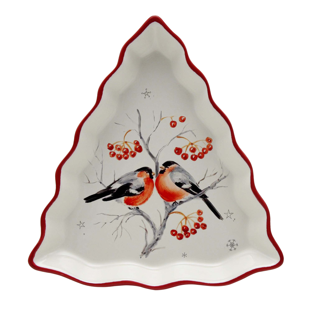 Блюдо в форме елки MILLIMI «Снегири» 21х16х3 см из керамики – это посуда из новогодней коллекции для создания тематической сервировки. Блюдо с принтом с красной отводкой и изображением снегирей на белом фоне смотрится выразительно и интересно, создавая яркий акцент и гармонично вписываясь в сервировку праздничного стола, образуя единый стиль вместе с другой посудой, столовыми приборами и текстильными элементами оформления стола. Подходит для подачи закусок, сладостей и фруктов. Качественная керамика устойчива к образованию царапин и трещин, легко моется и не окрашивается от продуктов.