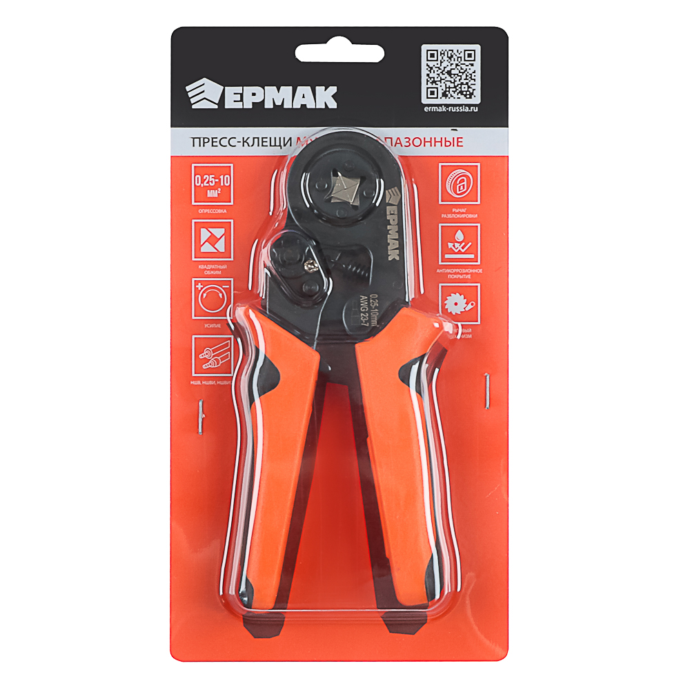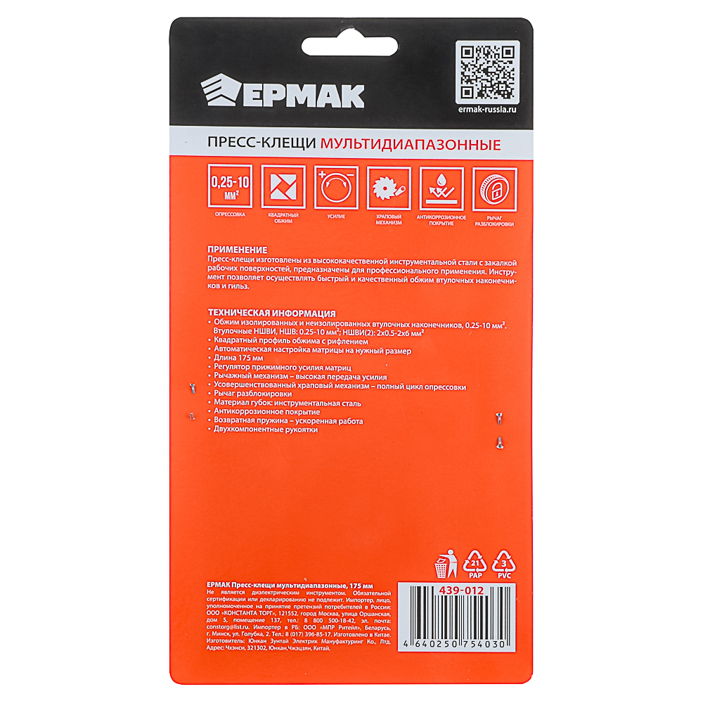 Пресс-клещи мультидиапазонные ЕРМАК длиной 175 мм — это универсальный инструмент для профессионального и бытового использования, предназначенный для опрессовки проводов с наконечниками НШВ, НШВИ и НШВИ (2). Клещи оснащены квадратным обжимом, который обеспечивает равномерное распределение давления и создает надежное соединение, устойчивое к механическим нагрузкам. Пресс-клещи покрыты антикоррозийным покрытием, что защищает их от ржавчины и продлевает срок службы даже при работе в сложных условиях. Инструмент поддерживает опрессовку проводов сечением от 0,25 до 10 мм², что делает его универсальным для широкого спектра задач. Эргономичные рукоятки с удобным хватом снижают усталость рук при длительной работе, а компактная длина 175 мм позволяет использовать клещи в труднодоступных местах. Пресс-клещи оснащены рычагом разблокировки, который позволяет быстро сбросить храповой механизм в случае необходимости.