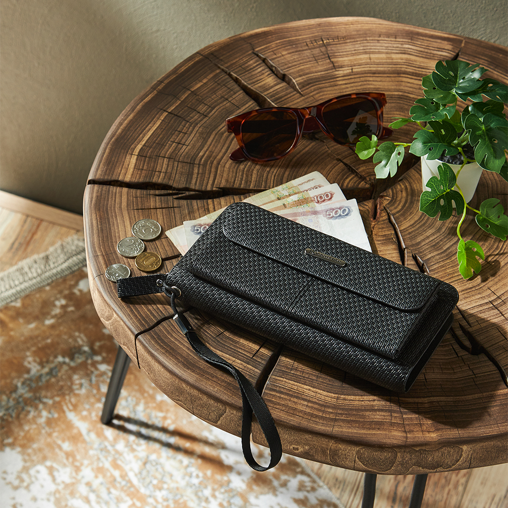 Сумка-бумажник ЮL с отделением для смартфона – ультрамодный повседневный аксессуар для мужчин. Имеет классический строгий дизайн. Бумажник вместительный и вместе с тем не громоздкий – имеет наружное отделение и четыре внутренних, одно из которых оснащено замком-молнией. Отделения удобны для хранения банковских и дисконтных карт, купюр и мелочи, ручек и ключей. Вмещает смартфон с большой диагональю. Бумажник удобен для путешествий – помещается в сумку или чемодан. Кроме того, аксессуар можно носить в руках или повесить на крючок – для этого предусмотрена ручка-петля.
