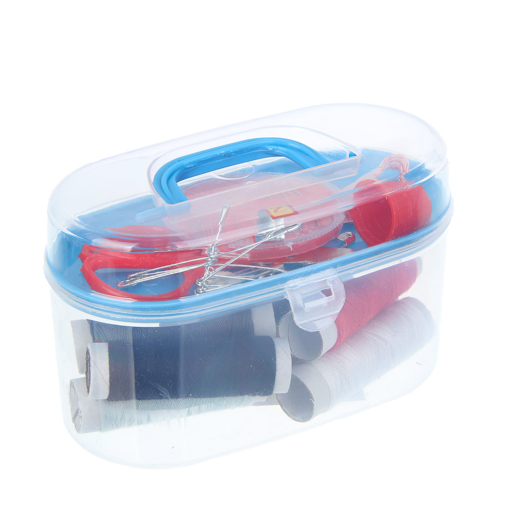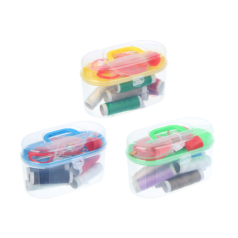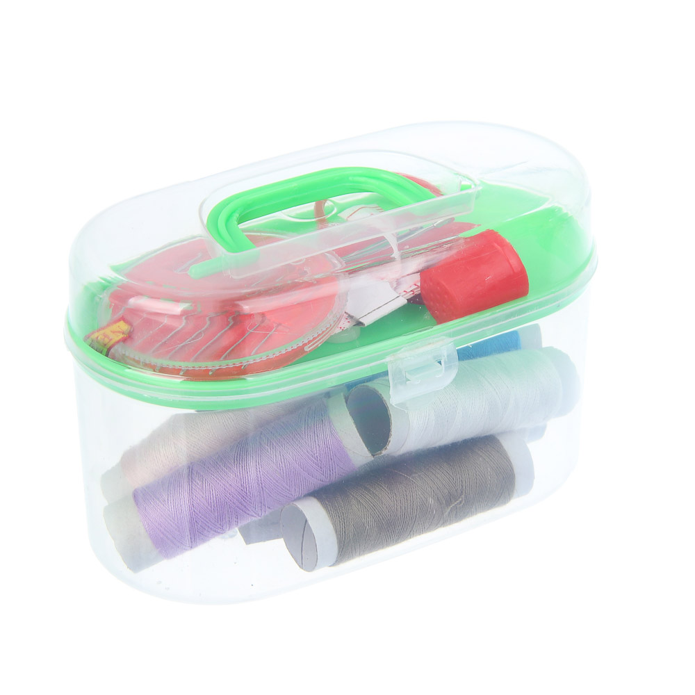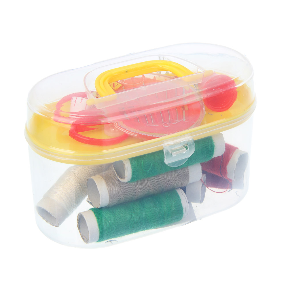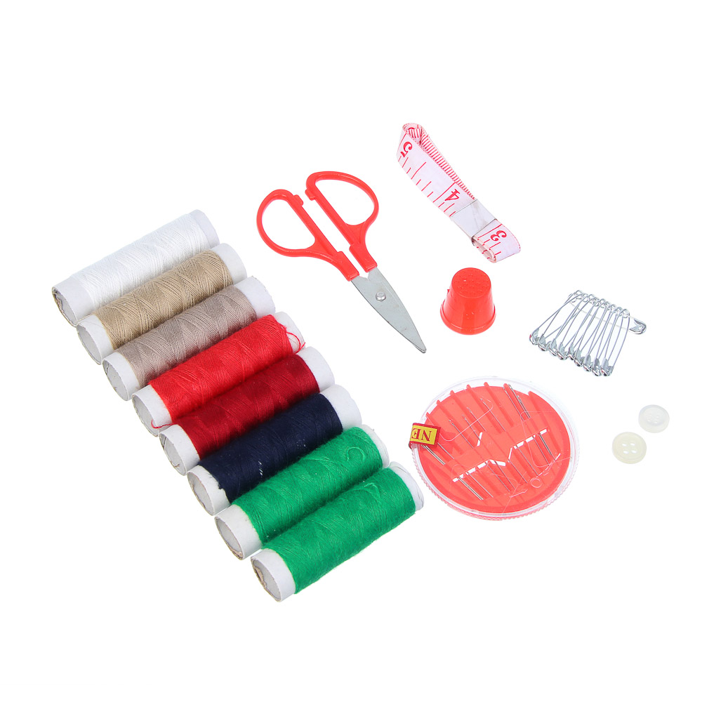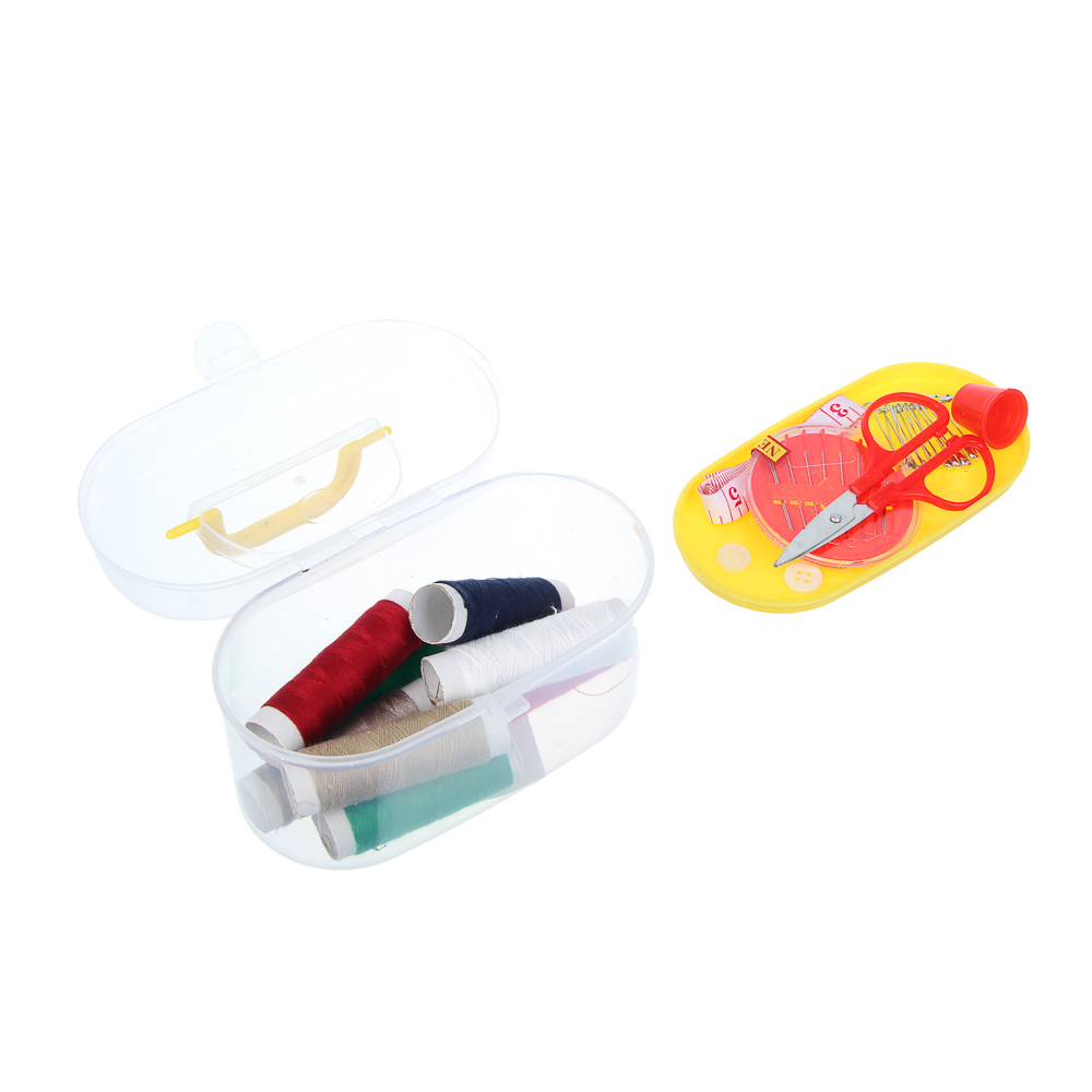 Компактный набор швейных принадлежностей включает всё необходимое для небольших ремонтов и ручных работ. В наборе 8 катушек ниток разных цветов, иголки в удобной игольнице, ножницы для точной резки, сантиметровая лента, булавки, пуговицы и наперсток. Все предметы аккуратно упакованы в пластиковый бокс, который легко хранить и брать с собой. Идеально подходит для домашнего использования или в качестве дорожного комплекта для мелких починок одежды.