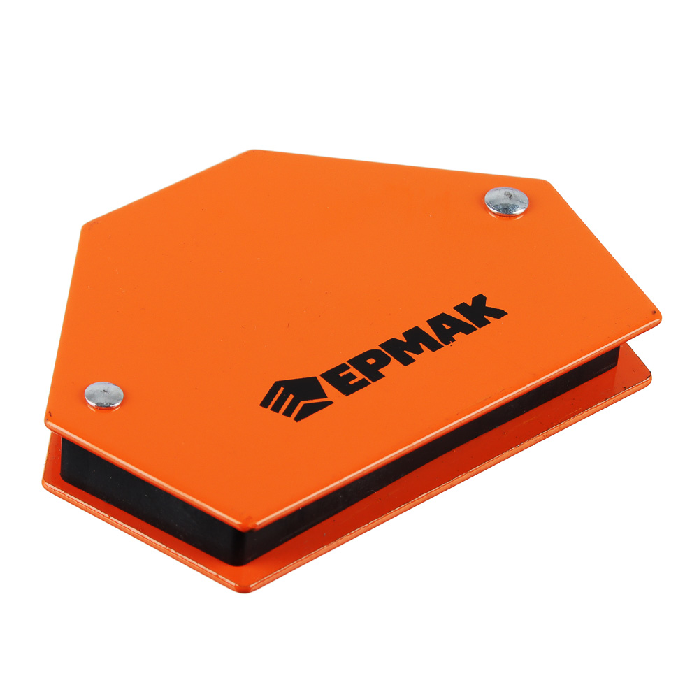 Угольник магнитный для сварки ЕРМАК – это удобный фиксатор, который позволяет выставить заготовку под нужным углом. Работать с инструментом проще, чем со сварочным зажимом или струбцинами, ведь зафиксировать деталь можно одному рабочему без дополнительной помощи. Имеет прочный усиленный корпус из стали A3 и высокий коэффициент максимального усиления на отрыв – 11 кг. Выставляемые углы в градусах: 30, 45, 60, 75, 90 и 135.