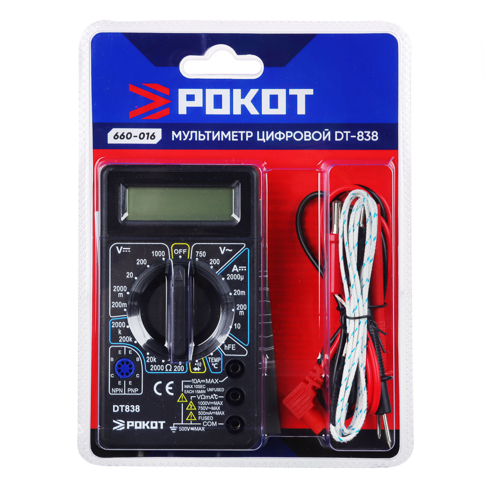 Цифровой мультиметр РОКОТ DT-838 – необходимый инструмент в арсенале электрика, а также домашнего мастера, который поможет в процессе монтажа и ремонта электрических сетей. Измерительный прибор включает в себя функции вольтметра, амперметра и омметра. Легкое переносное устройство можно носить с собой. Мультиметр поможет проверить работу диодов и транзисторов, а также измерить сопротивление, напряжение и силу тока. Для смены режима предусмотрен позиционный переключатель на корпусе, а результаты измерений отображаются на дисплее. Прибор точно фиксирует измерения, надежен и безопасен, имеет защиту от перегрузки. Оснащен аккумулятором емкостью 200 мАч. Измерительные щупы входят в комплект.