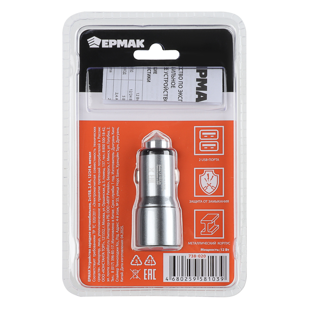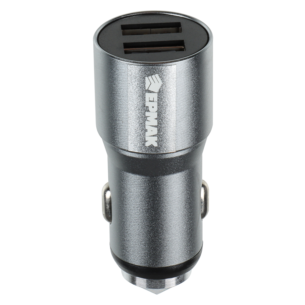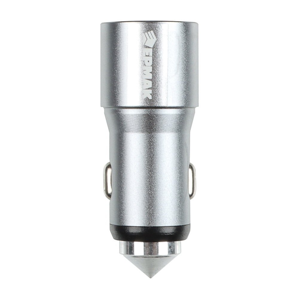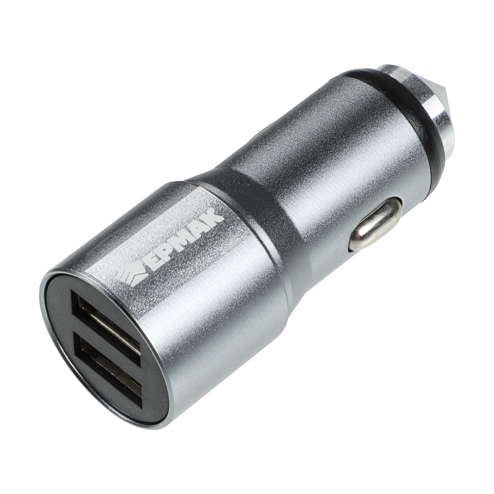 Автомобильное зарядное устройство совместимо с любыми транспортными средствами с напряжением в бортовой сети 12/24 В. Вставляется в гнездо прикуривателя. Имеет надежный и прочный металлический корпус, который может применяться для аварийного разбития стекла. Предусмотрена защита от короткого замыкания. Оснащено двумя USB-портами. Подходит для зарядки мобильных устройств с выходным током 2 А.