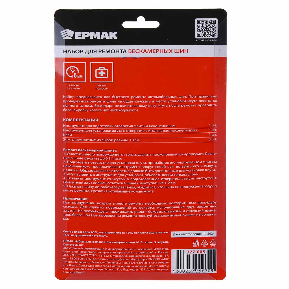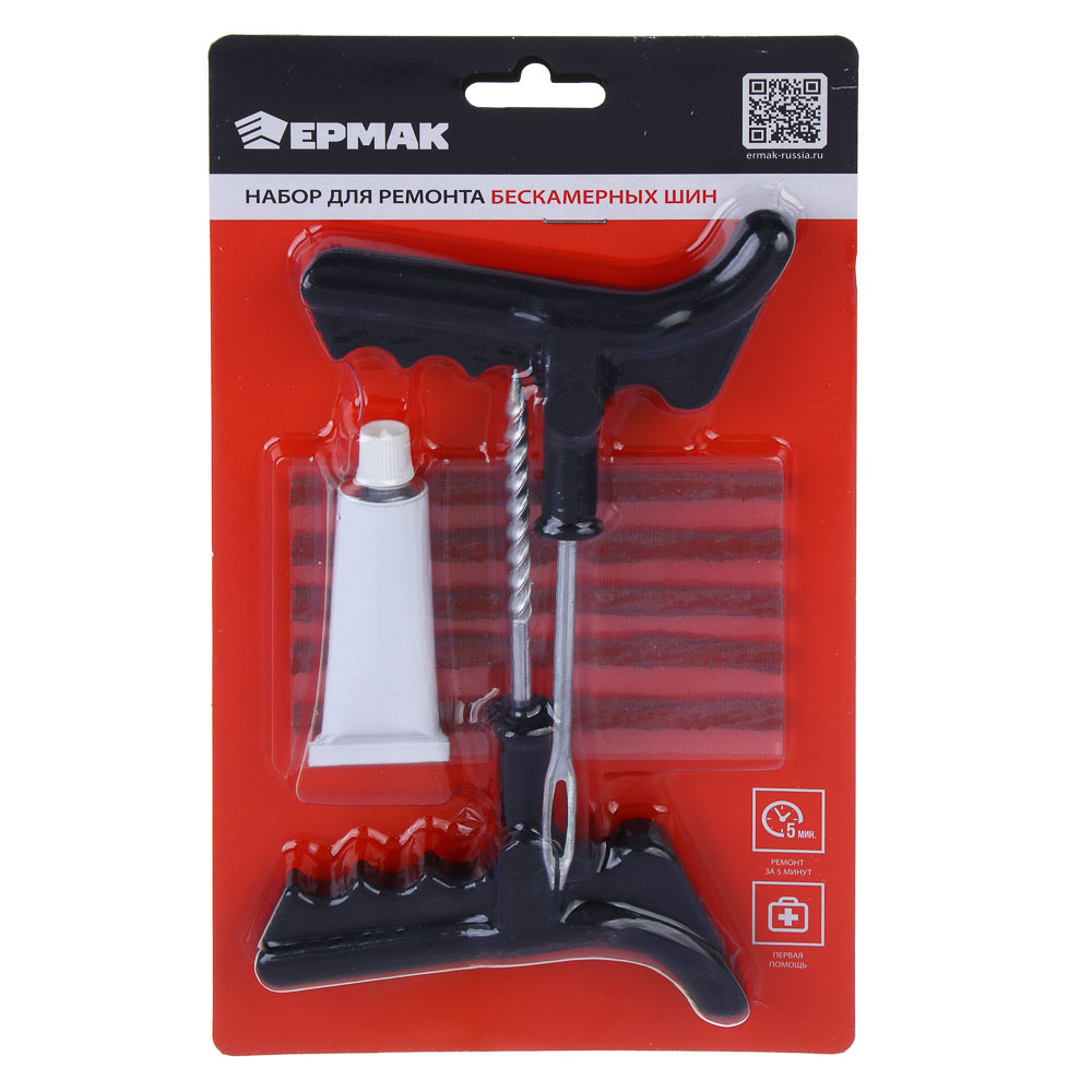 ЕРМАК Набор для ремонта бескамерных шин №2: клей, 5 жгутов, T-инструмент