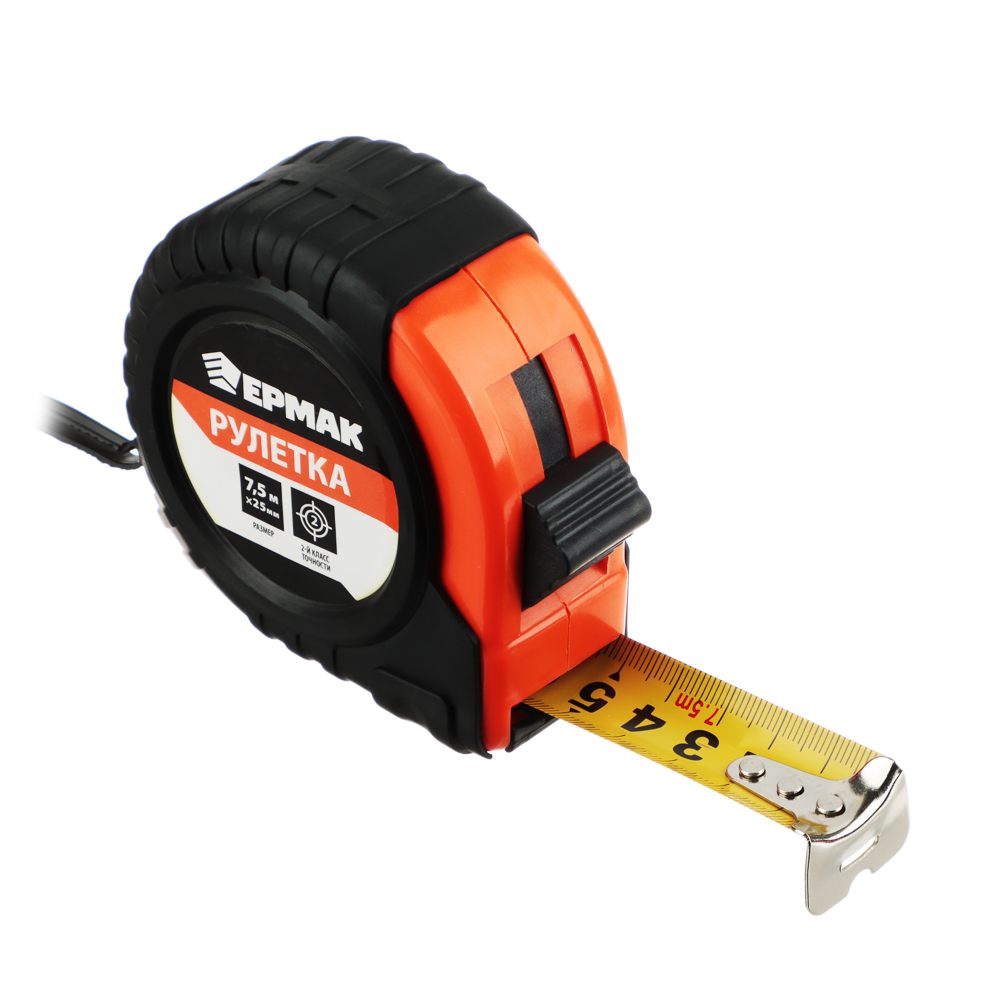 Рулетки ЕРМАК предназначены для проведения измерительных работ. Надежный сматывающий механизм и корпус из ударопрочного пластика - обеспечат долгий срок службы инструмента. Комфорт в работе придают противоскользящие резиновые вставки, а для ношения - наручная петля и зацеп на ремень! Инструмент применяется в быту и строительстве!