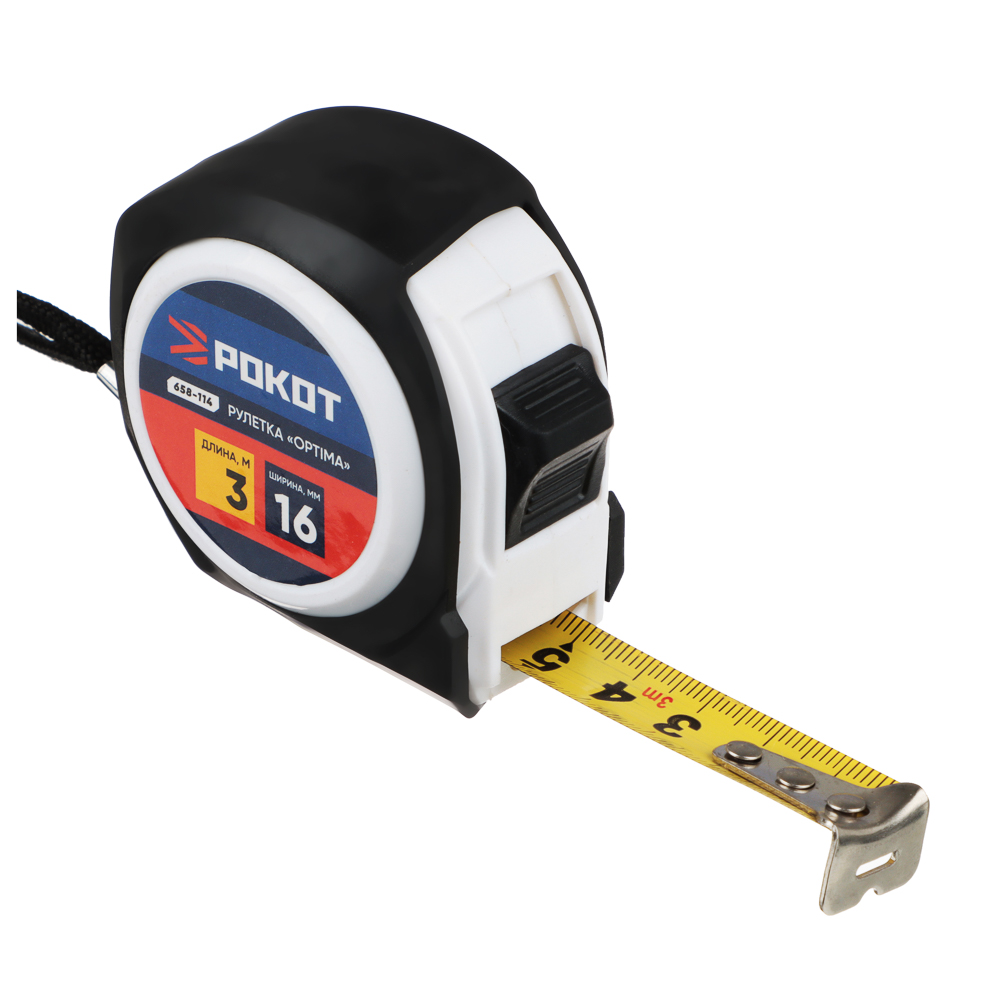 Рулетка РОКОТ «Оптима» длиной 3 метра – это компактный аксессуар для проведения измерений в процессе строительных, монтажных, ремонтных и отделочных работ. Имеет прочный корпус из ABS-пластика и удобный шнурок для переноски и хранения. Тонкая измерительная лента шириной 16 мм выполнена из инструментальной стали и имеет защитное покрытие, которое исключает образование ржавчины, а также имеет яркий желтый цвет, который контрастирует с числовой шкалой, благодаря чему измерения хорошо просматриваются. Механизм «автостоп» активируется нажатием на кнопку и позволяет зафиксировать ленту на нужной длине.
