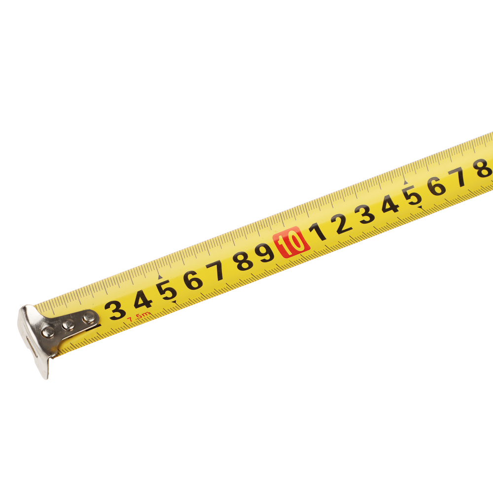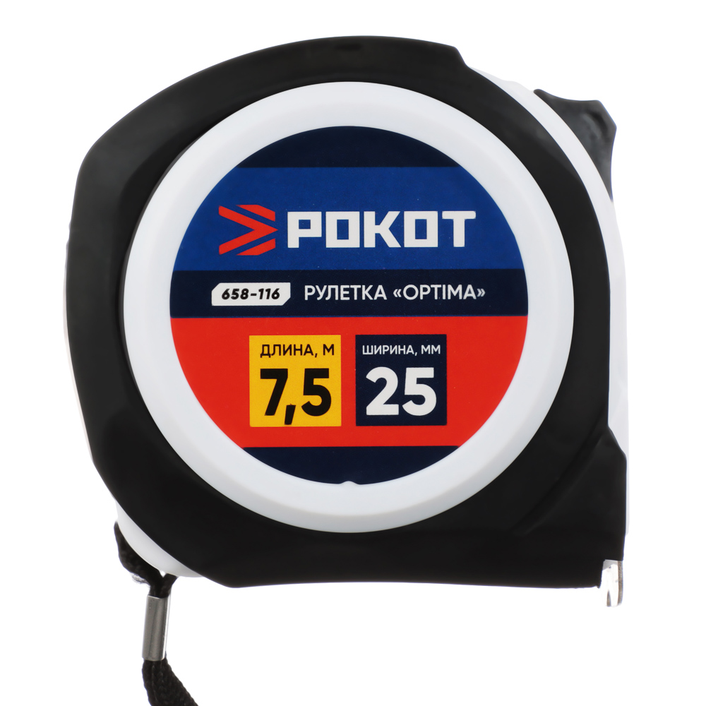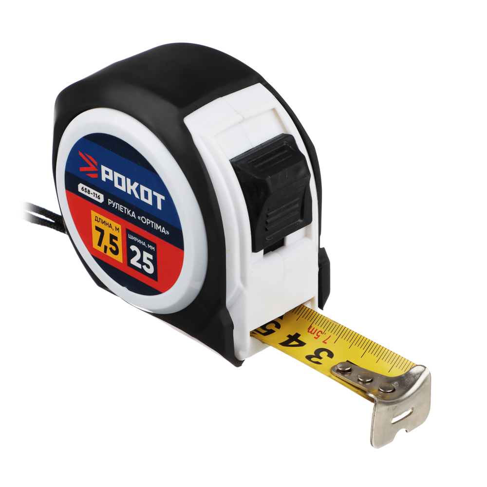 Рулетка РОКОТ «Оптима» длиной 7,5 метра – это компактный аксессуар для проведения измерений в процессе строительных, монтажных, ремонтных и отделочных работ. Имеет прочный корпус из ABS-пластика и удобный шнурок для переноски и хранения. Тонкая измерительная лента шириной 16 мм выполнена из инструментальной стали и имеет защитное покрытие, которое исключает образование ржавчины, а также имеет яркий желтый цвет, который контрастирует с числовой шкалой, благодаря чему измерения хорошо просматриваются. Механизм «автостоп» активируется нажатием на кнопку и позволяет зафиксировать ленту на нужной длине.