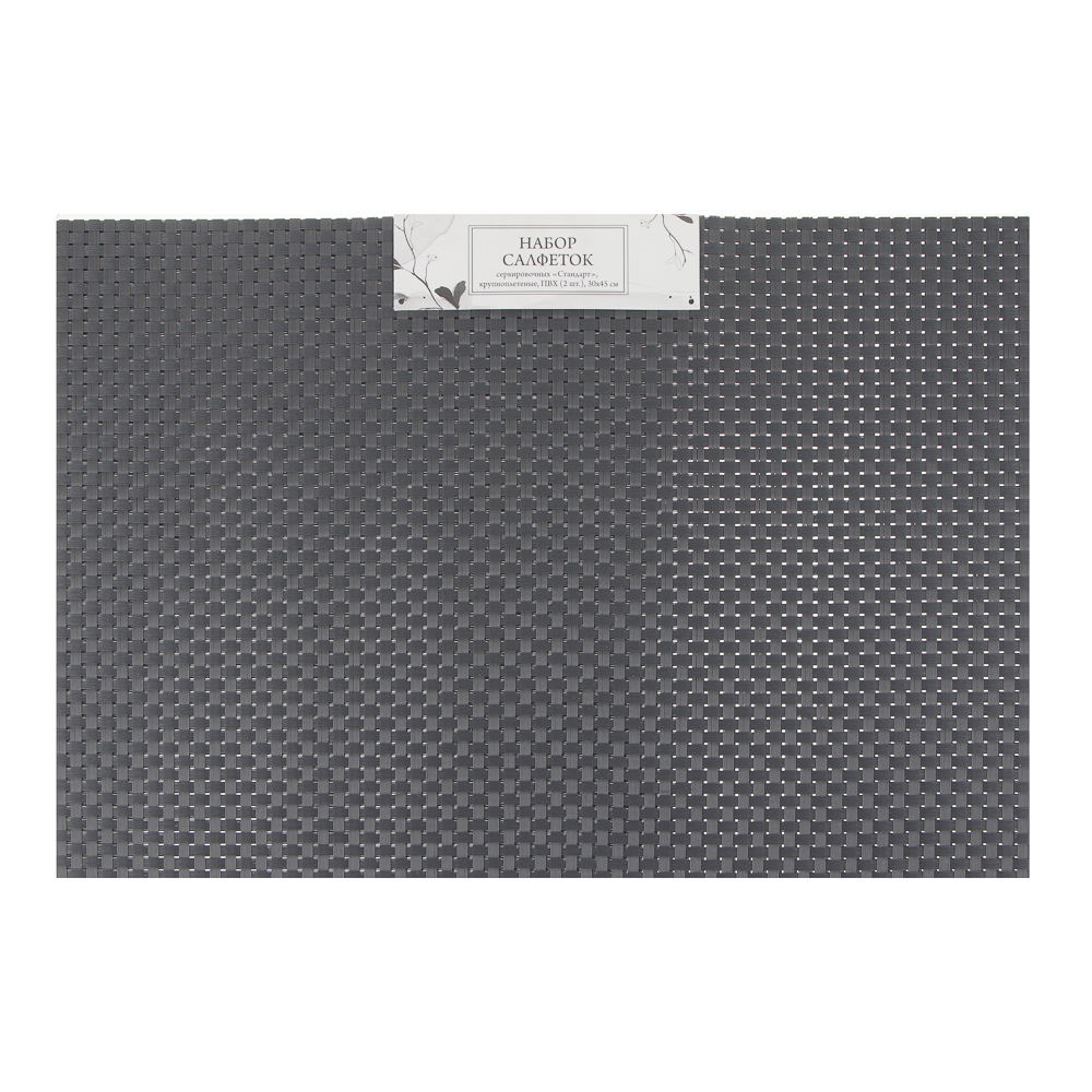 Набор сервировочных салфеток «Стандарт» эффектного и стильного дизайна предназначен для сервировки стола и украшения интерьера кухни, столовой, гостиной, придает праздничное настроение. Служит защитой от царапин и различных следов, а также используется в качестве подставки под горячее. Дизайн салфеток отвечает последним тенденциям европейской интерьерной моды. Салфетки изготовлены из высококачественного ПВХ, имеют отличную пластичность и большой срок службы. Отличное решение для повседневного использования, а также для праздничного стола. В наборе 2 салфетки. Размер 30х45 см. Материал: покрытие 100% ПВХ, основа 100% полиэстер.Особенности: крупноплетеные.