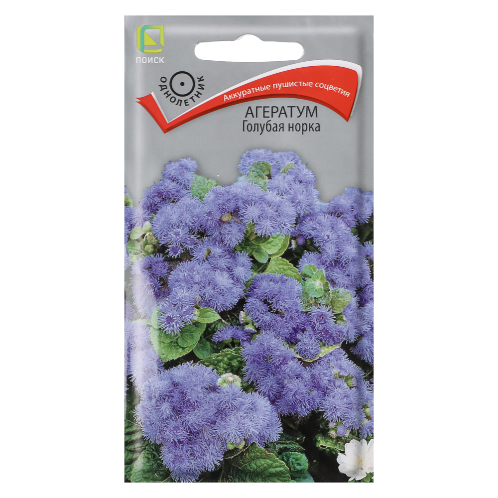 Семена агератума «Голубая норка» формируют аккуратные пушистые соцветия. Компактный кустик вырастает до 35 см в высоту. Листья образуются большие и опушённые. Соцветия формируются плотные и крупные (1,7?2,1 см в диаметре) и сиренево-голубого цвета. Сорт цветёт с середины июня до октября, хорошо переносит стрижку. Используйте его для оформления цветников различного назначения. Растение теплолюбивое и засухоустойчивое, растёт быстро. Оно хорошо развивается на лёгких питательных почвах. Предпочитает солнечное местоположение. Посев в рассадные ящики производите в конце марта — апреле, слегка присыпав их мелкозернистым песком. При температуре почвы +18…+21С всходы появятся на 10-14 день. Пикировку сеянцев проводите через три недели после посева. Рассада не выносит сырости. В открытый грунт высаживайте после окончания весенних заморозков, выдерживая расстояние между растениями в 15-20 см.