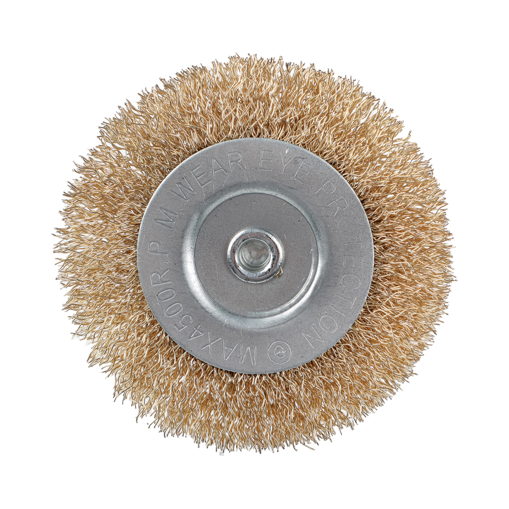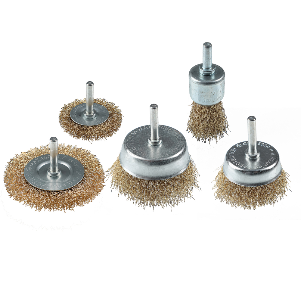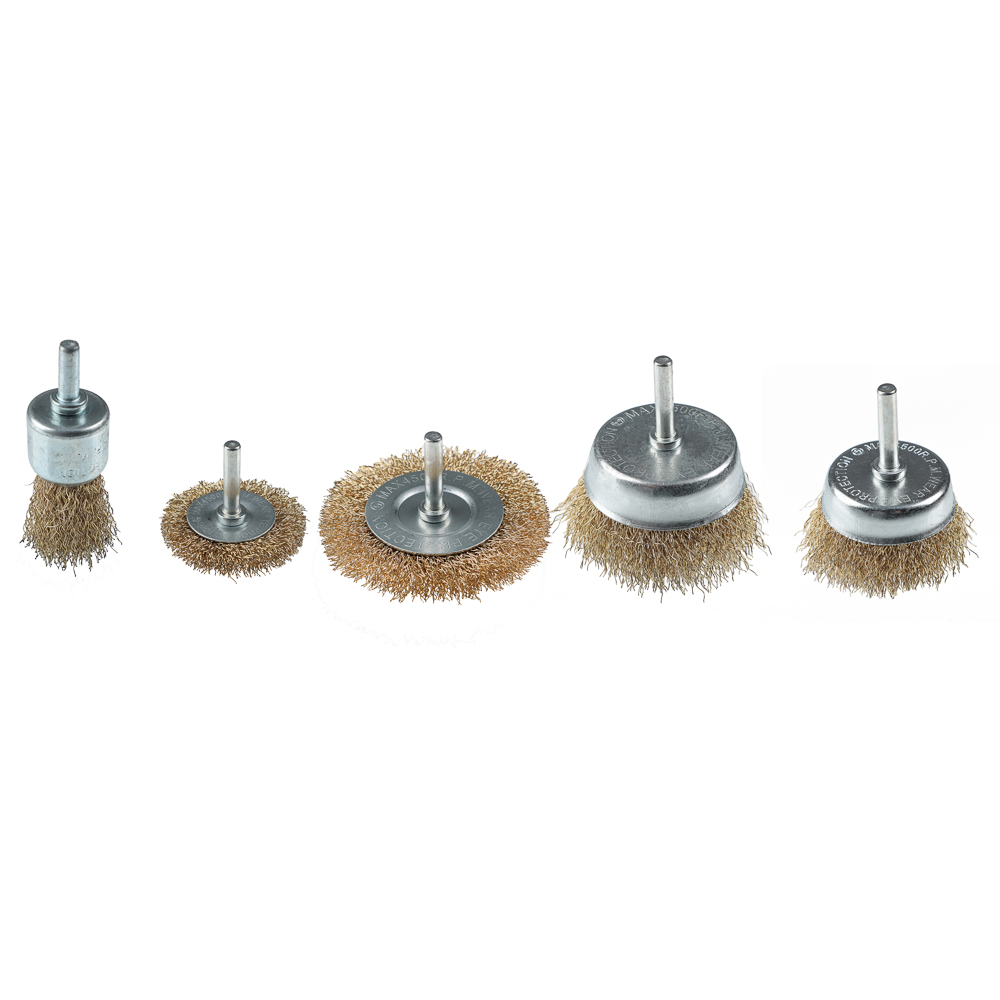 Набор металлических щеток со шпильками, 5 пр., включает плоские щетки диаметром 50 и 75 мм, а также чашечные 25, 50 и 75 мм, что делает его универсальным для обработки как больших поверхностей, так и труднодоступных мест. Щетки подходят для зачистки, очистки от ржавчины и подготовки поверхностей к обработке или окраске.