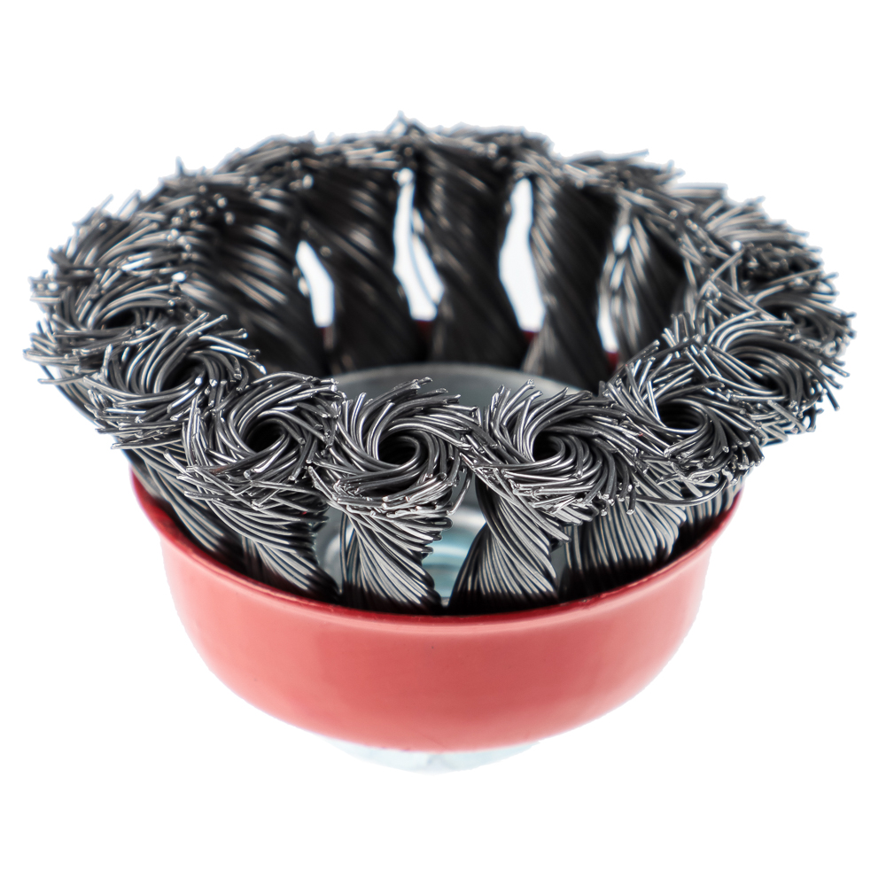 Изготовлена из стальной крученой проволоки. Такая щетка имеет высокую износостойкость и применяется при грубых зачистных работах по металлическим поверхностям, удалении окалины, ржавчины и заусенцев, сглаживании сварных швов.