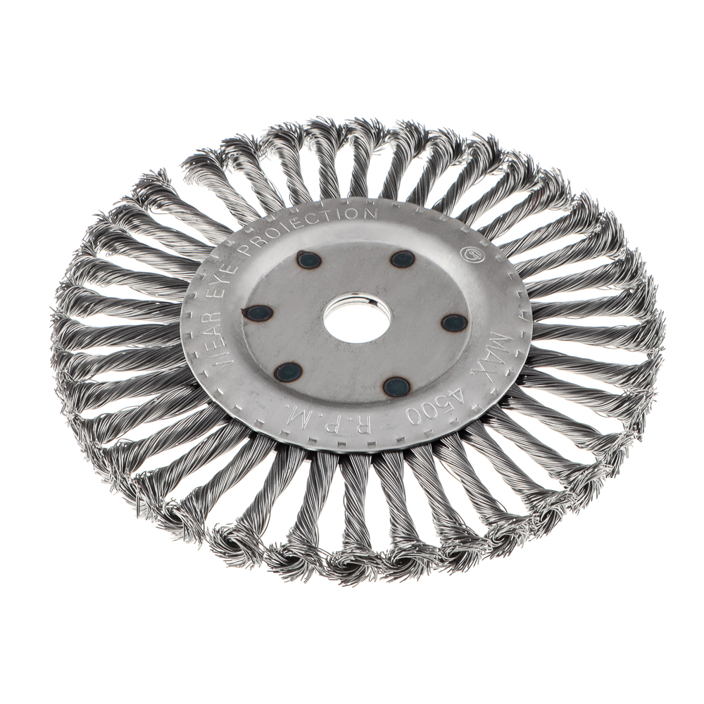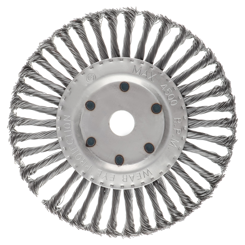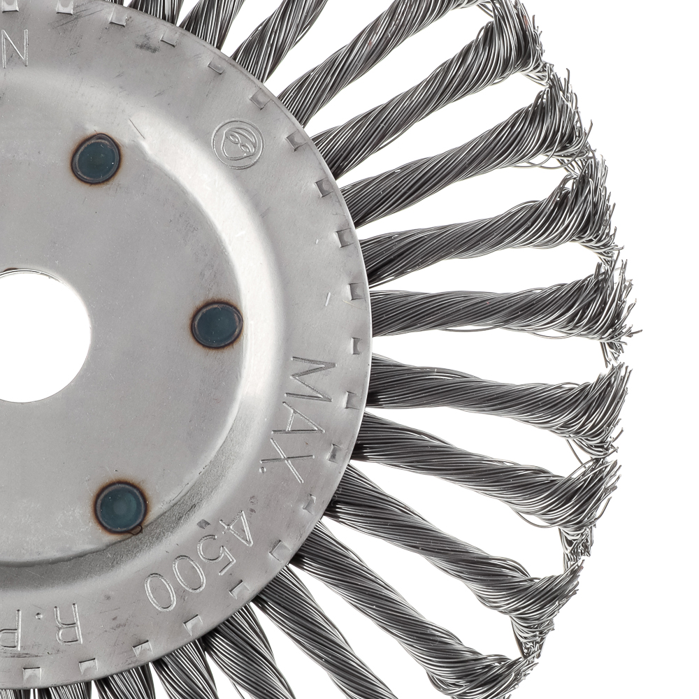 Изготовлена из стальной крученой проволоки. Такая щетка имеет высокую износостойкость и применяется при грубых зачистных работах по металлическим поверхностям, удалении окалины, ржавчины и заусенцев, сглаживании сварных швов.