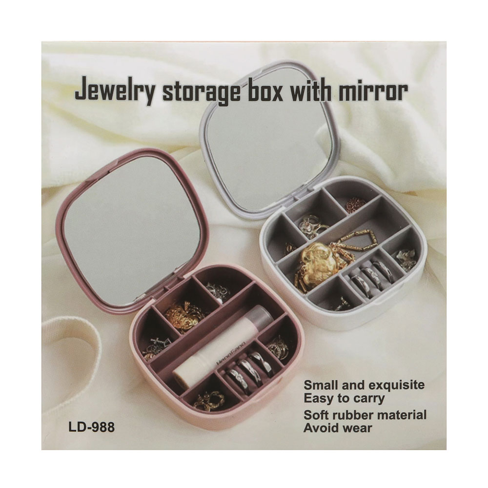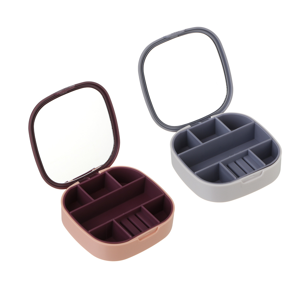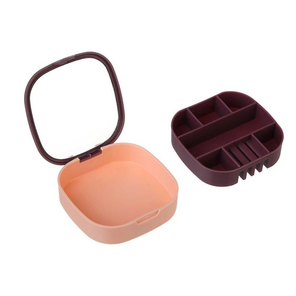 Шкатулка для украшений с зеркалом, 10x10x3 см, из пластика – это удобный органайзер, который позволит организовать компактное хранение ювелирных изделий и бижутерии. Шкатулка разделена на 7 отсеков разных размеров для разных типов изделий, в том числе предусмотрено место для фиксации колец. Мягкий материал защищает изделия от повреждений и царапин. Кейс с украшениями надежно закрывается, имеет компактный размер, что позволяет брать любимые украшения с собой в поездки. 2 цвета в ассортименте.