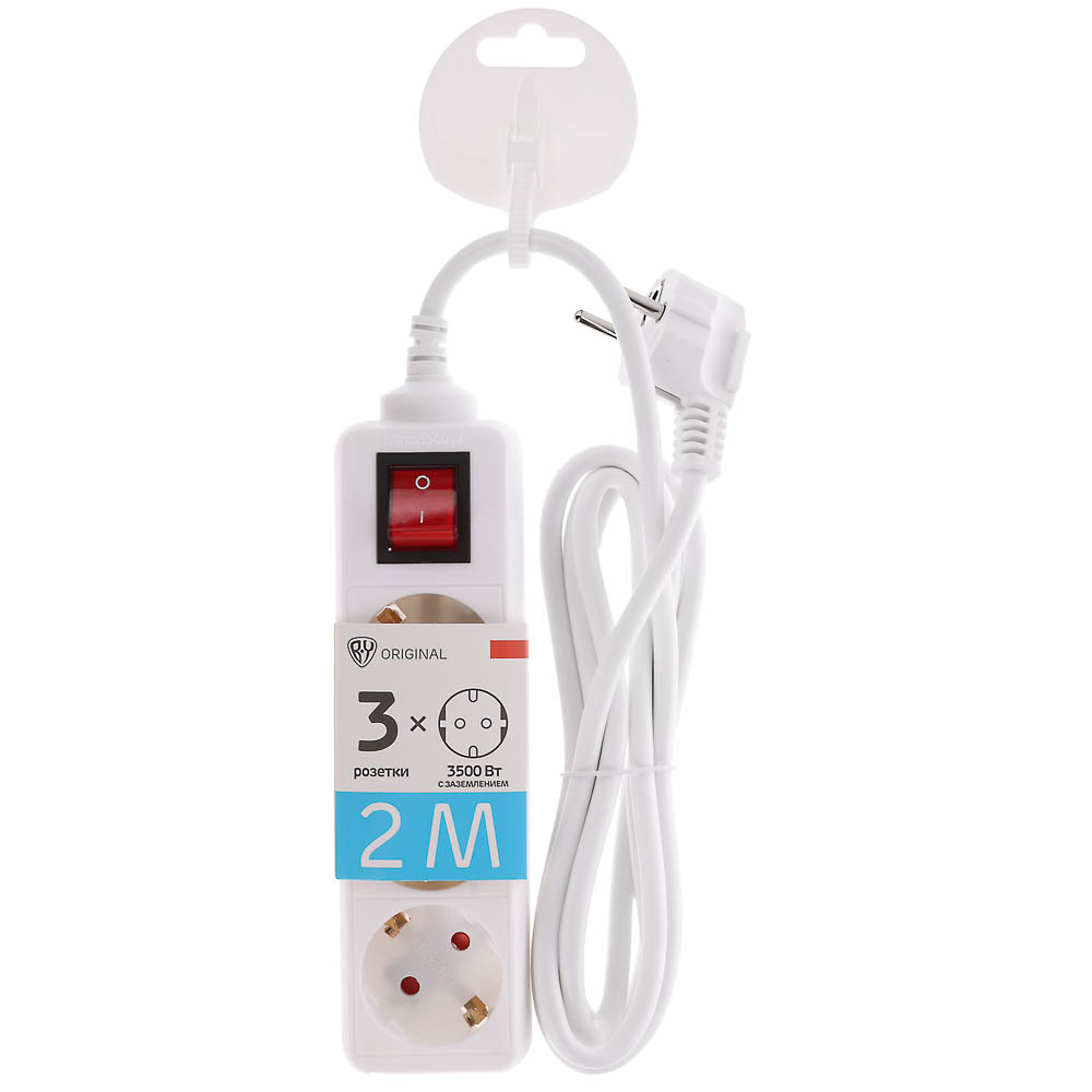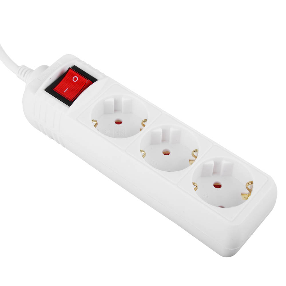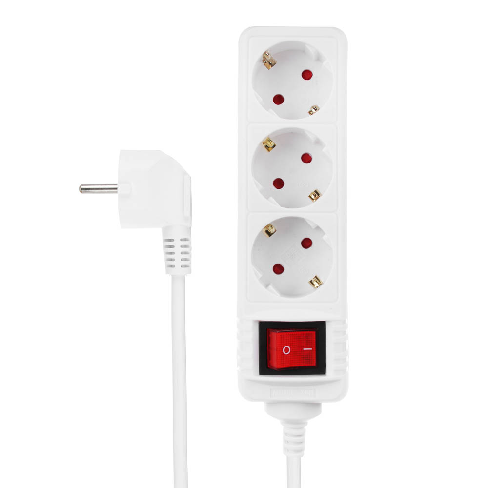 Универсальный электрический удлинитель с заземлением. Оснащен выключателем. Предназначен для нестационарного подключения потребителей к электрической сети переменного тока, на 3 евророзетки, с максимальной мощностью 3500Вт, длина шнура 2 метра.