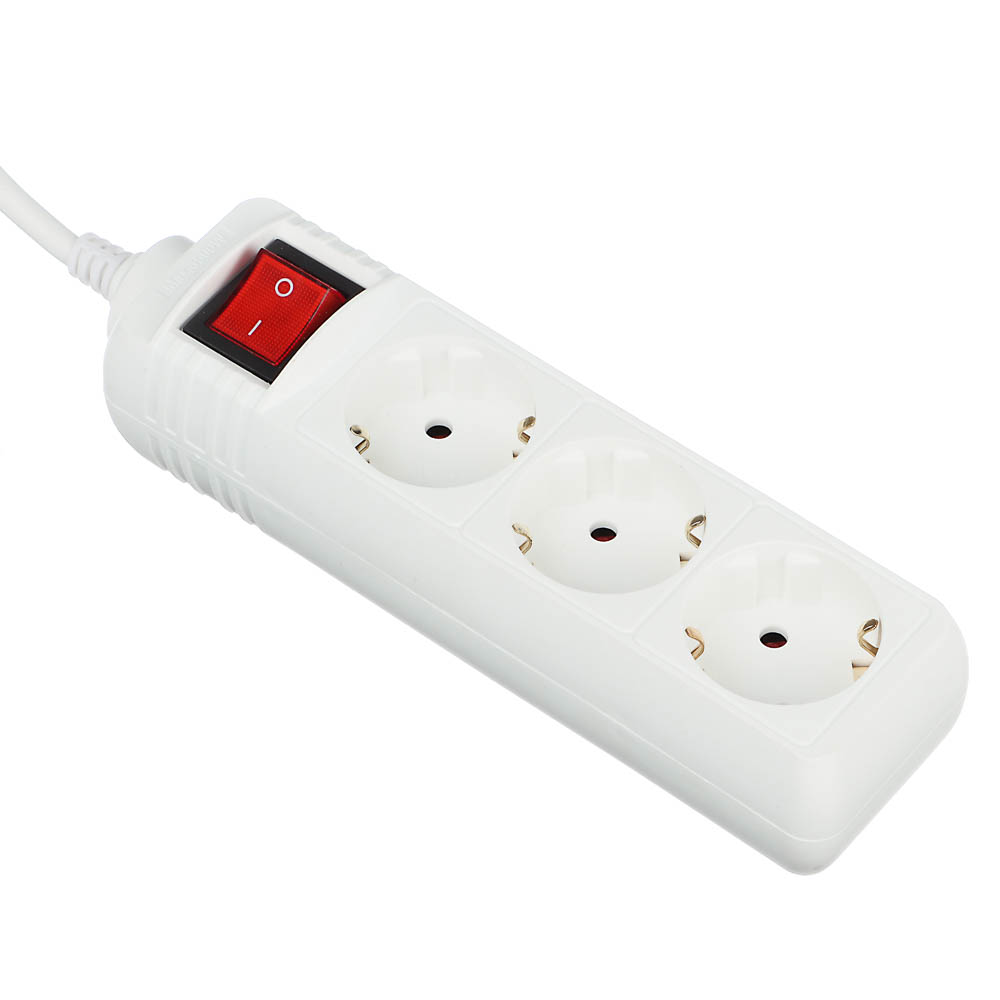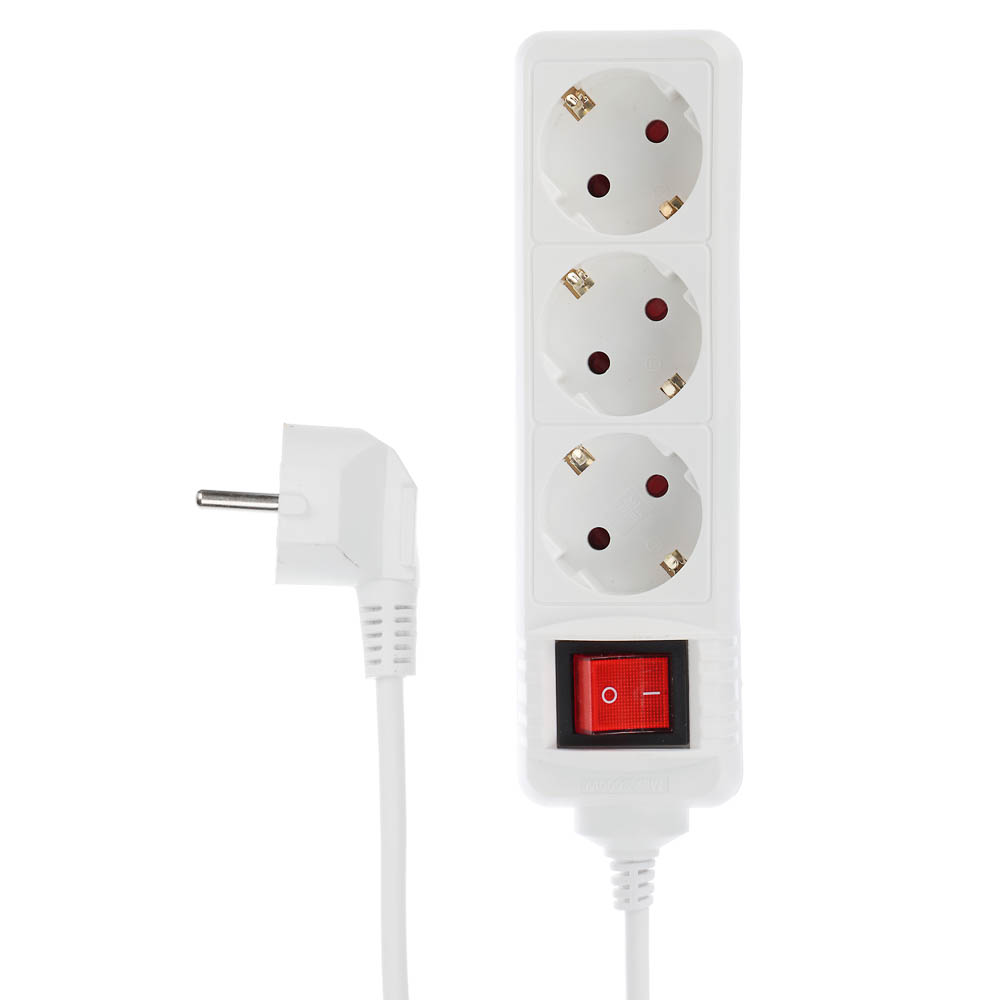Универсальный электрический удлинитель с заземлением. Оснащен выключателем. Предназначен для нестационарного подключения потребителей к электрической сети переменного тока, на 3 евророзетки, с максимальной мощностью 3500Вт, длина шнура 5 метров.