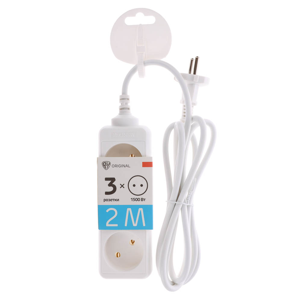 Удлинитель 3 гнезда 2м BY, сеч. провода 0,75 кв.мм, евророзетка, 6A, макс. мощность1500Вт