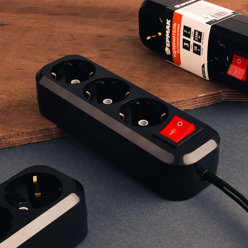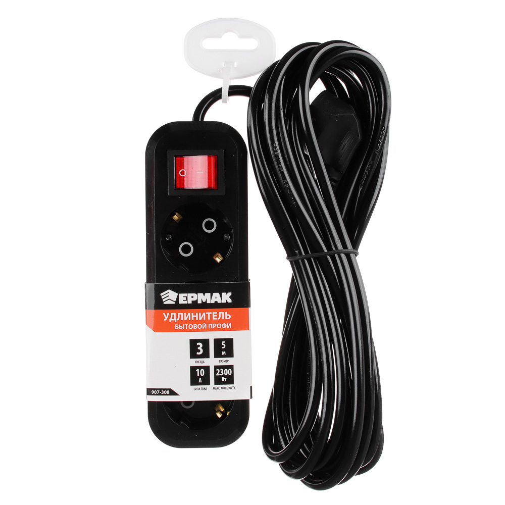 Удлинитель бытовой ЕРМАК «Профи» Евро с длиной кабеля 5 метров с кнопкой и тремя гнездами – необходимый предмет в быту для подключения гаджетов и электробытовых приборов в условиях удаленности стационарной розетки или нехватки розеток в помещении. Имеет компактный размер, высокий уровень электро- и противопожарной безопасности. Оснащен надежным кабелем с заземлением с сечением 1,5 мм.