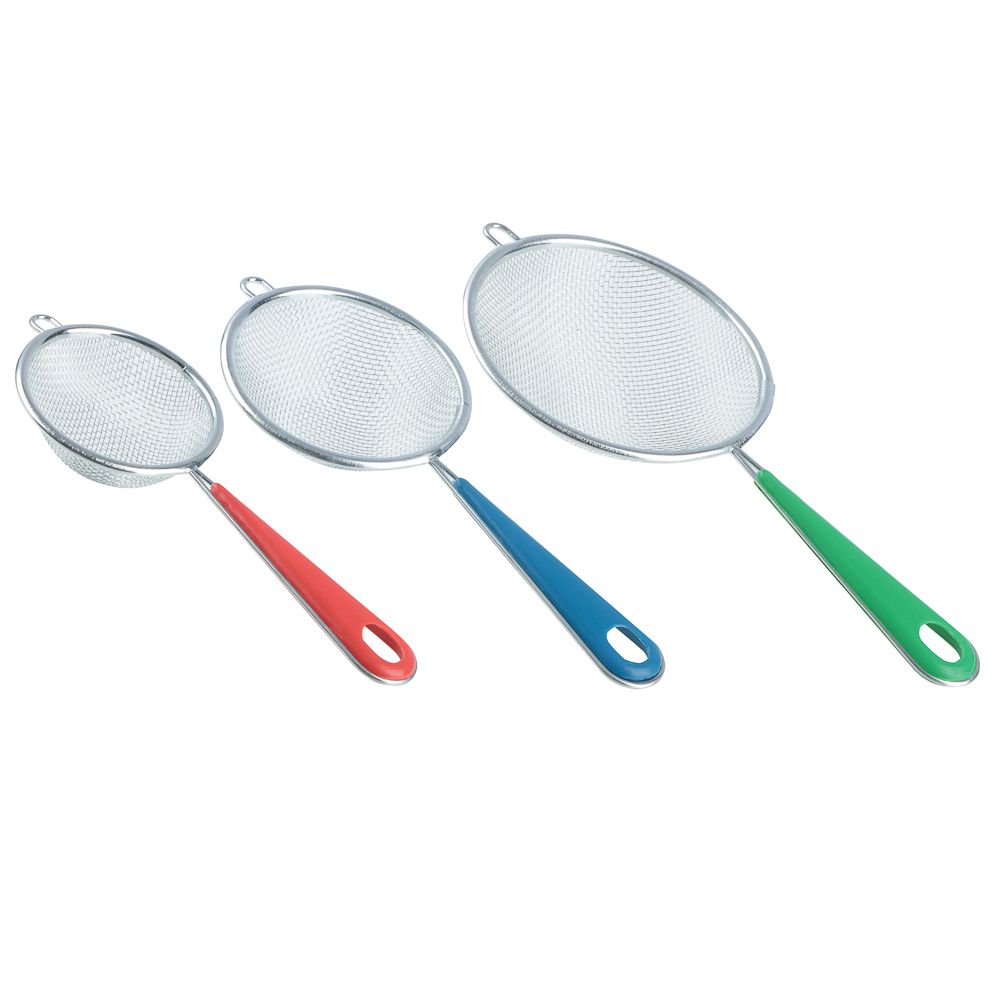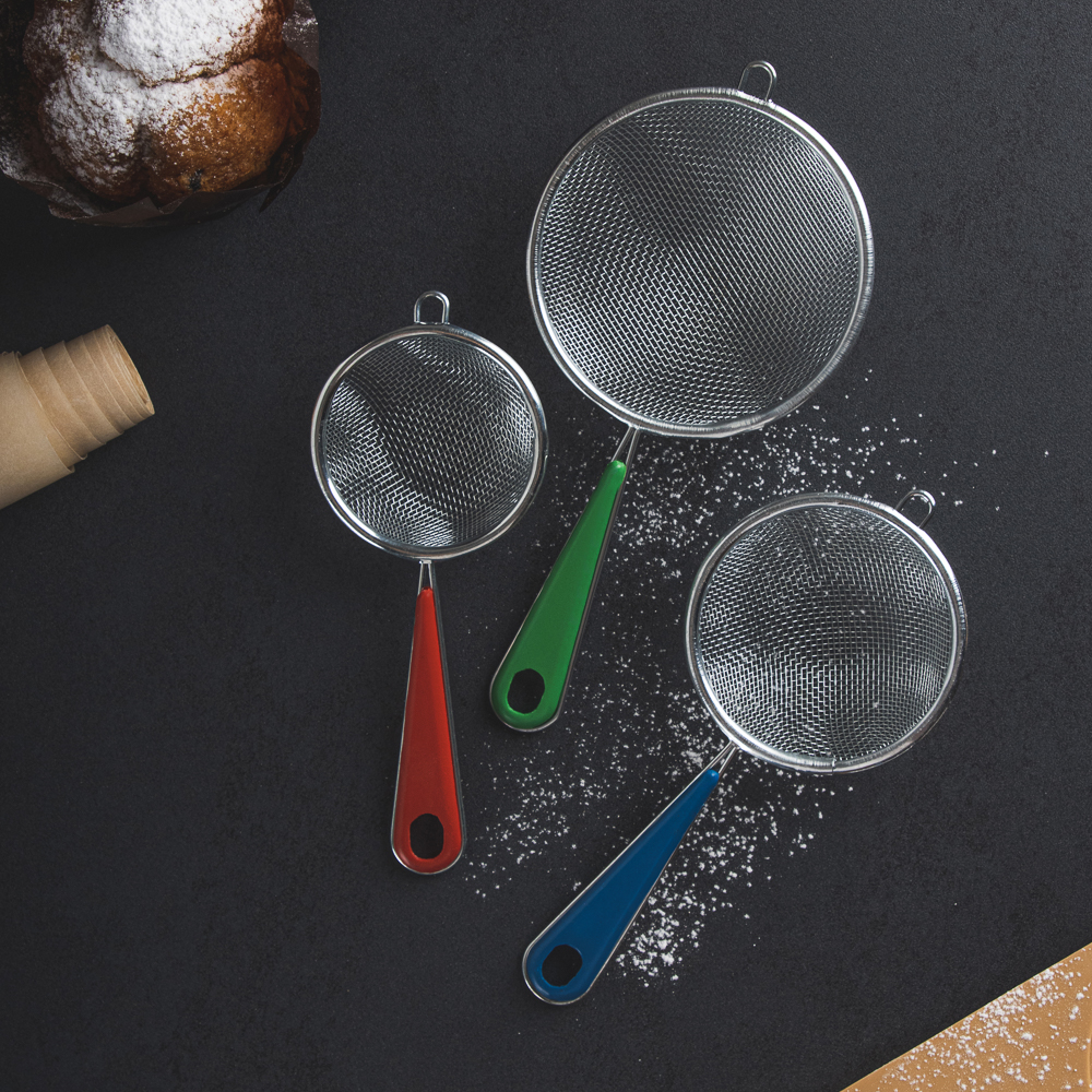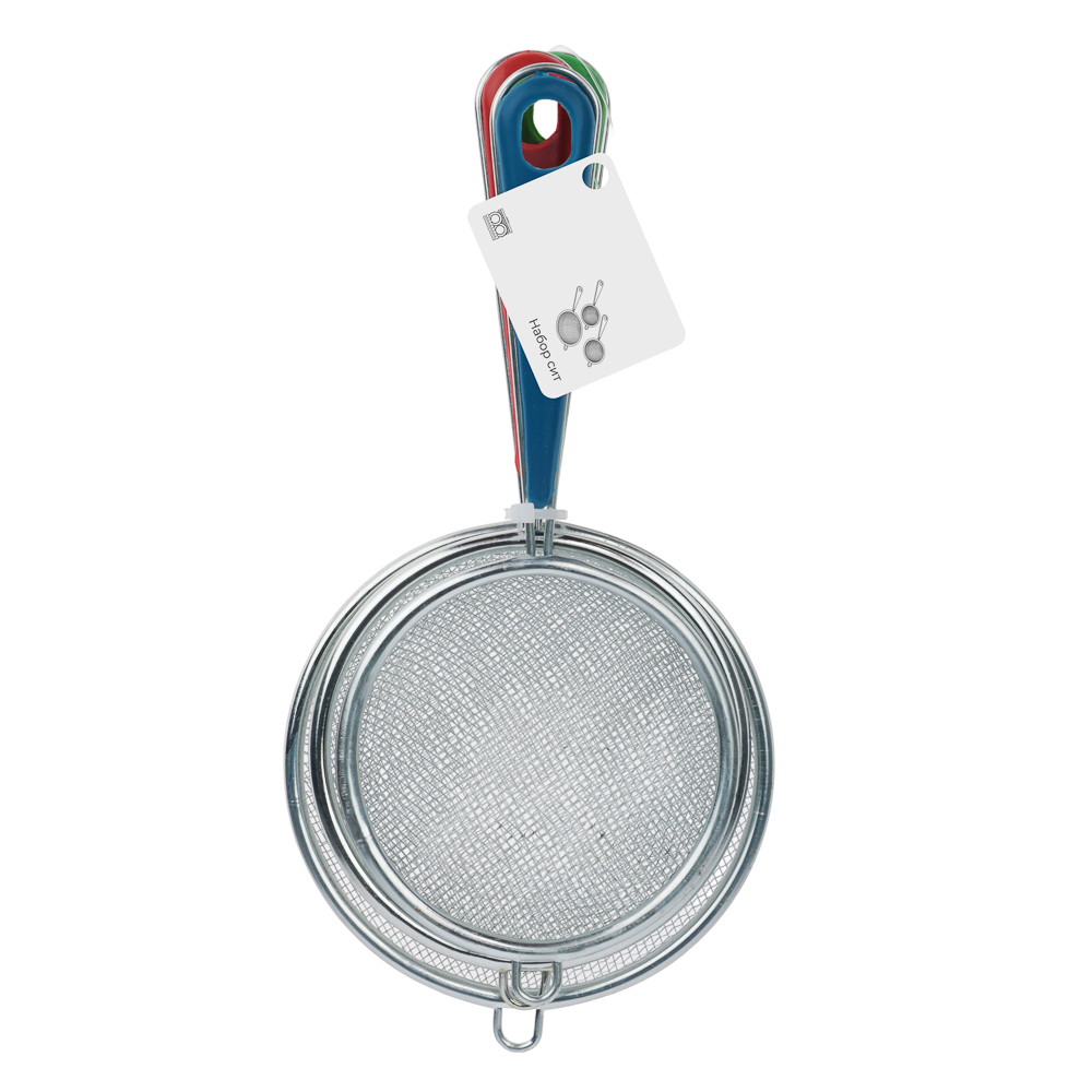 Набор сит из 3 штук — универсальный помощник на кухне. В набор входят сита разного диаметра: 6 см, 7 см и 9 см, выполненные из прочной луженой стали, которая обеспечивает посуде долгий срок службы и устойчивость к коррозии. Сита предназначены для самых разных целей: процеживания жидкостей, просеивания муки, какао и других сыпучих продуктов, заваривания чая и промывания ягод. Сито не засоряется и легко моется. Каждое сито оснащено удобной длинной ручкой в ярком цвете и петлей для подвешивания.