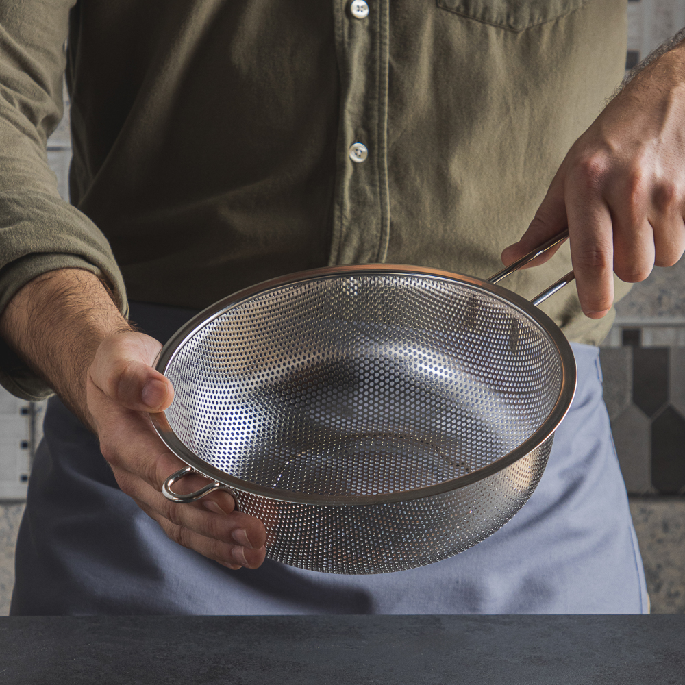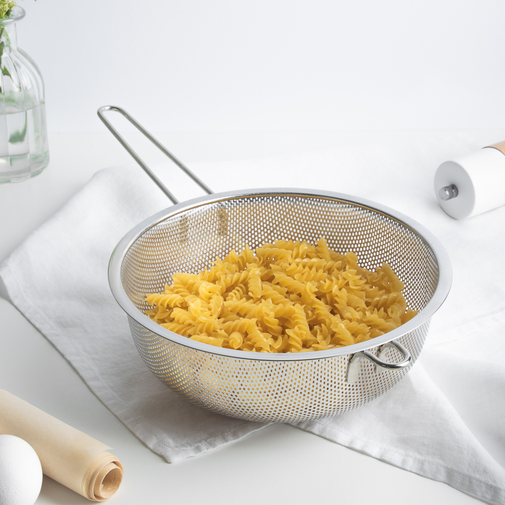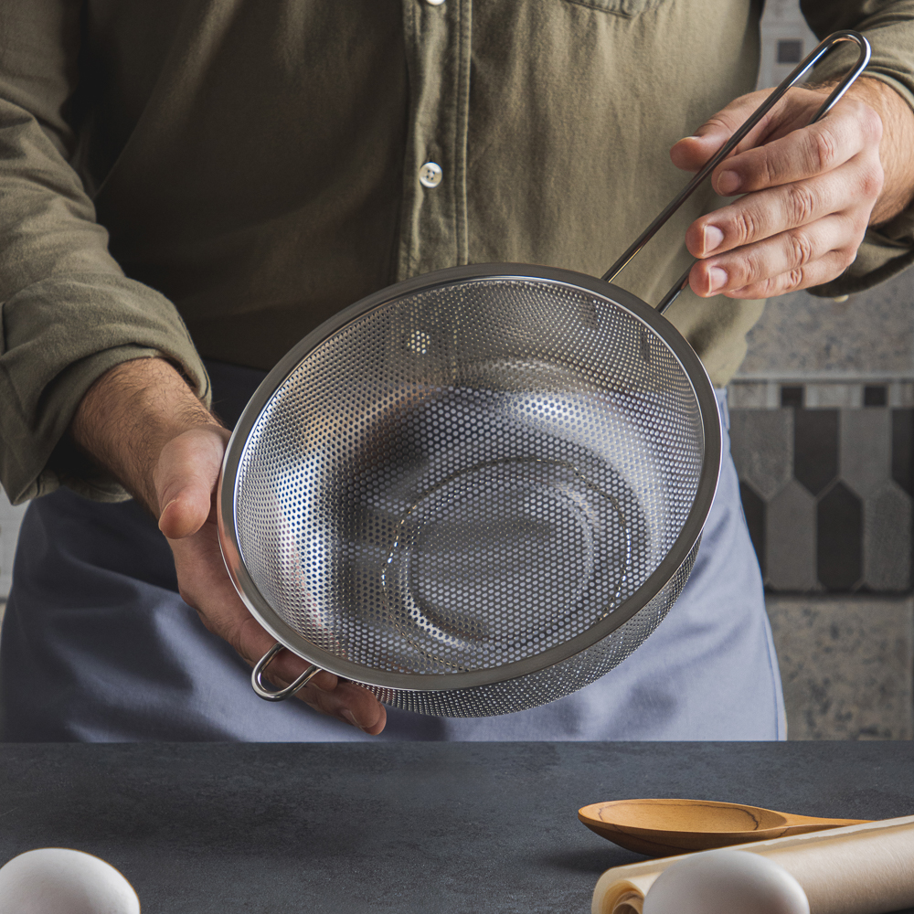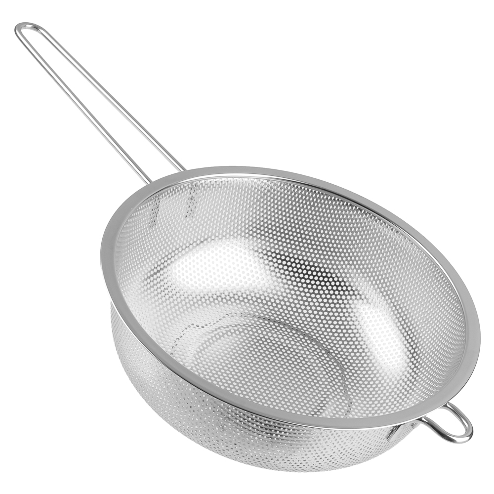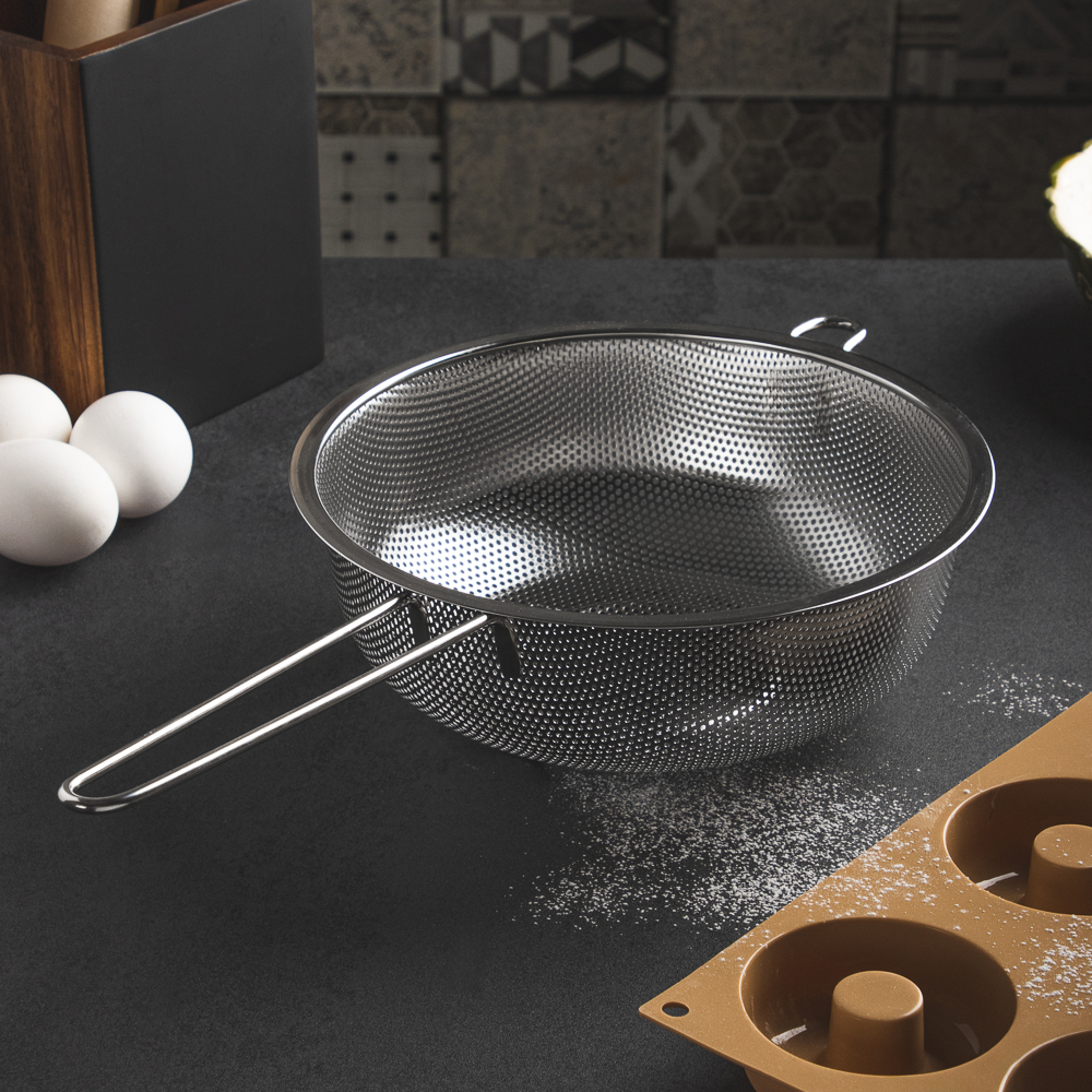Дуршлаг из нержавеющей стали с ручкой диаметром 22 см станет незаменимым аксессуаром на любой кухне. Ручка обеспечивает удобство при использовании, а ножка предотвращает опрокидывание дуршлага. Благодаря ножке изделие можно поставить прямо в раковину. Теперь вы можете легко и быстро промыть овощи, фрукты или крупы, а затем обсушить их перед использованием.
