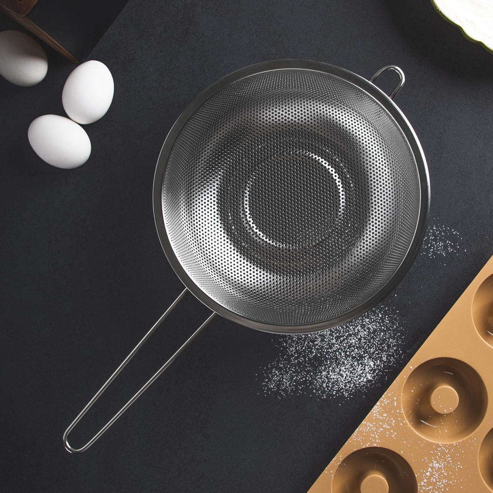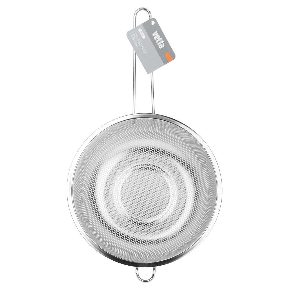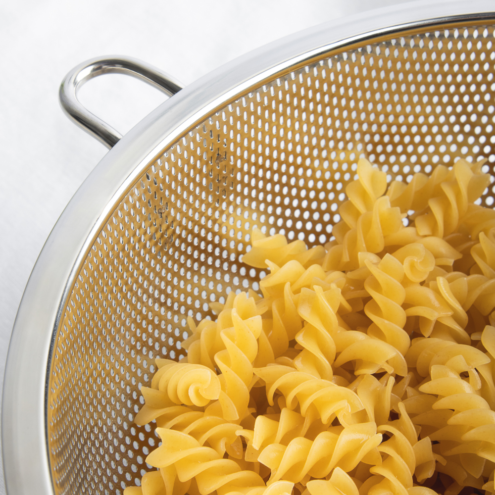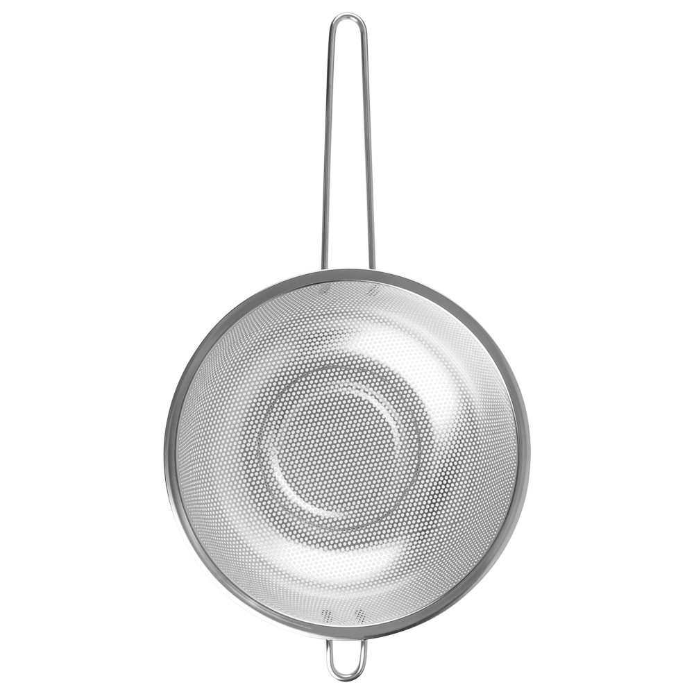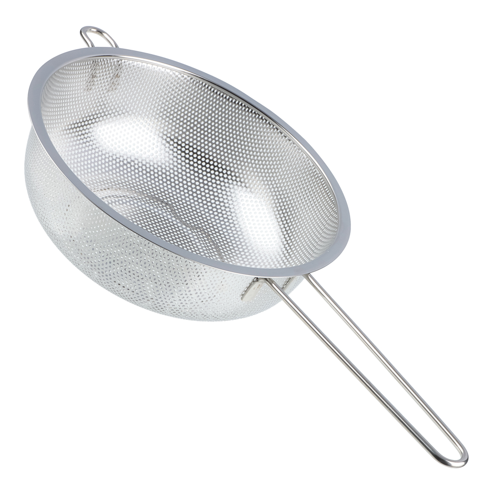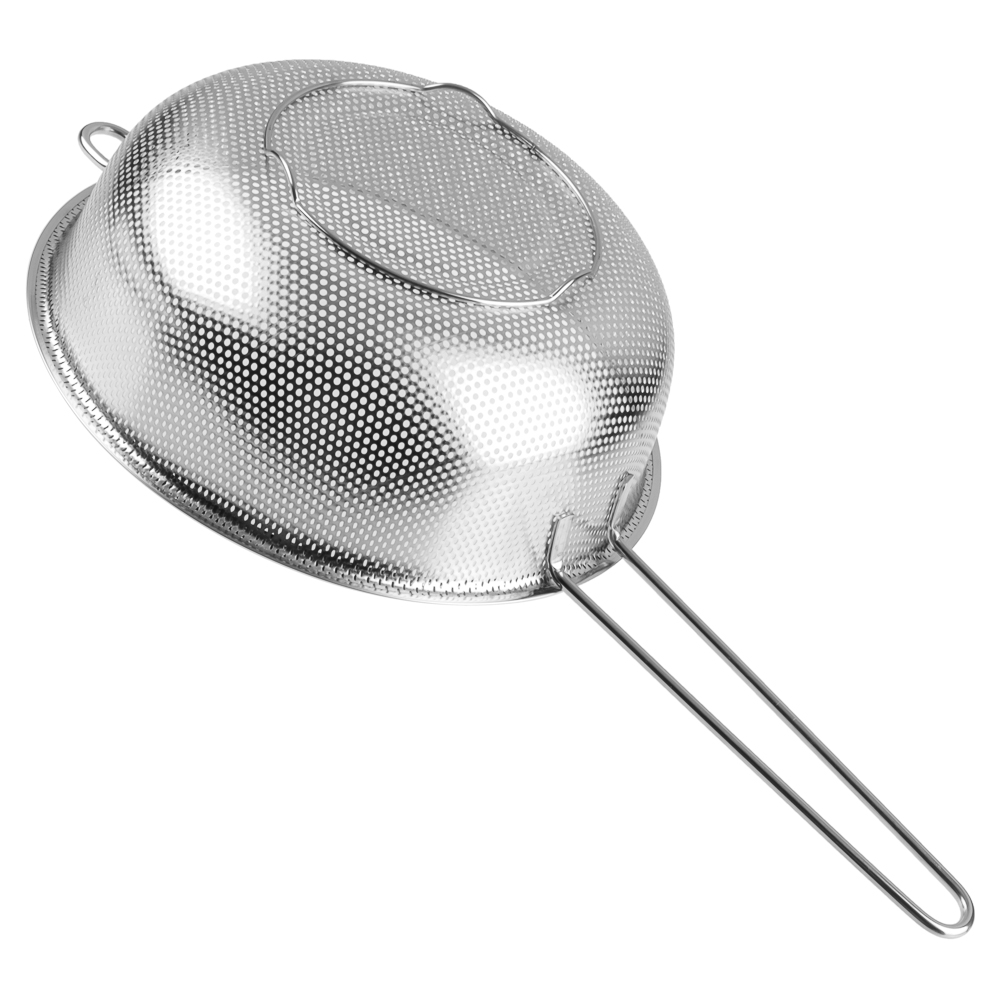 Дуршлаг из нержавеющей стали с ручкой диаметром 22 см станет незаменимым аксессуаром на любой кухне. Ручка обеспечивает удобство при использовании, а ножка предотвращает опрокидывание дуршлага. Благодаря ножке изделие можно поставить прямо в раковину. Теперь вы можете легко и быстро промыть овощи, фрукты или крупы, а затем обсушить их перед использованием.