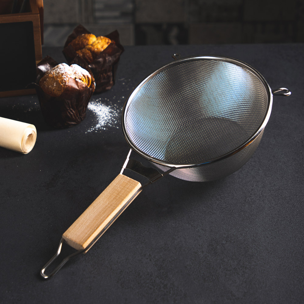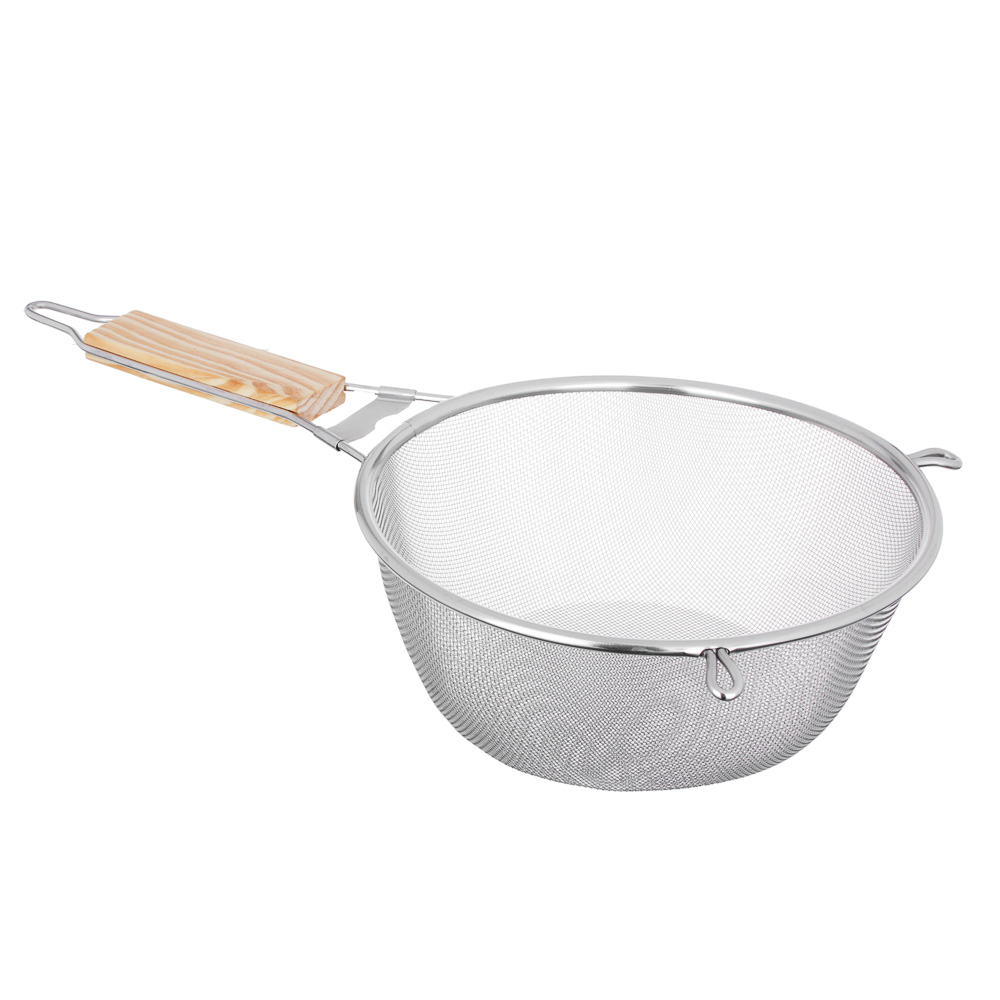 Сито из нержавеющей стали диаметром 21 см с ободом и ручкой - незаменимый помощник на кухне. Оно идеально подходит для просеивания муки, какао, сахарной пудры и других мелких продуктов. Прочный материал обеспечивает долговечность, а удобные ручка и обод делают использование сита максимально комфортным.