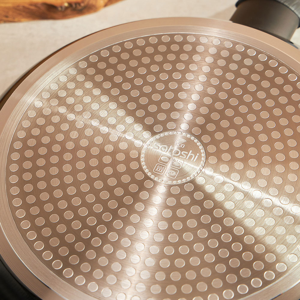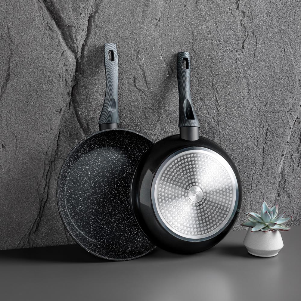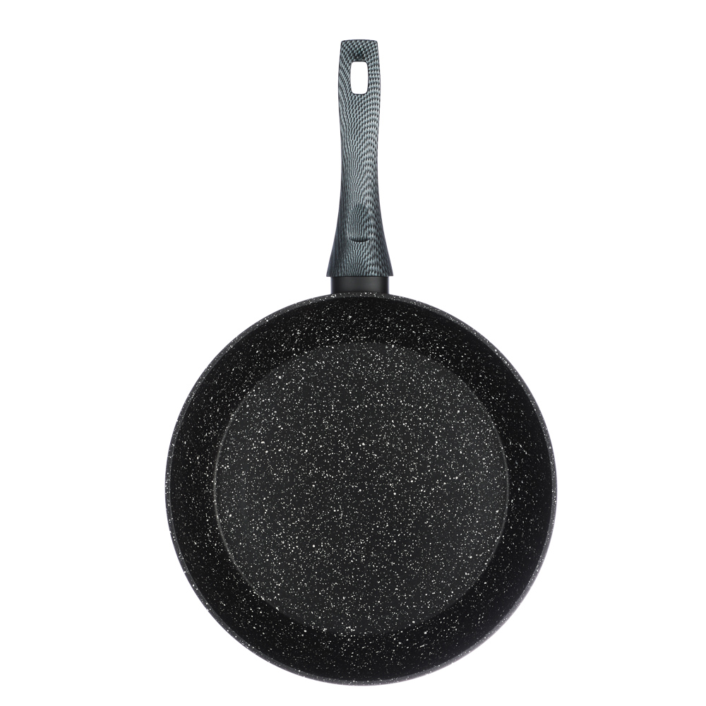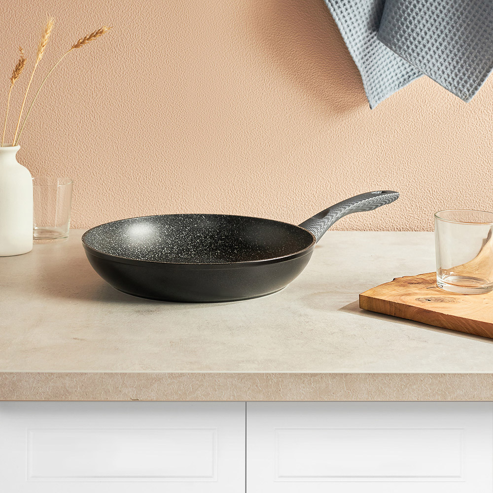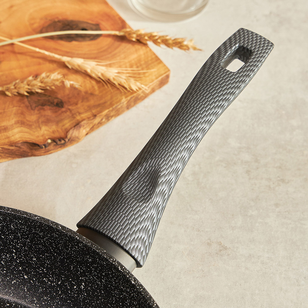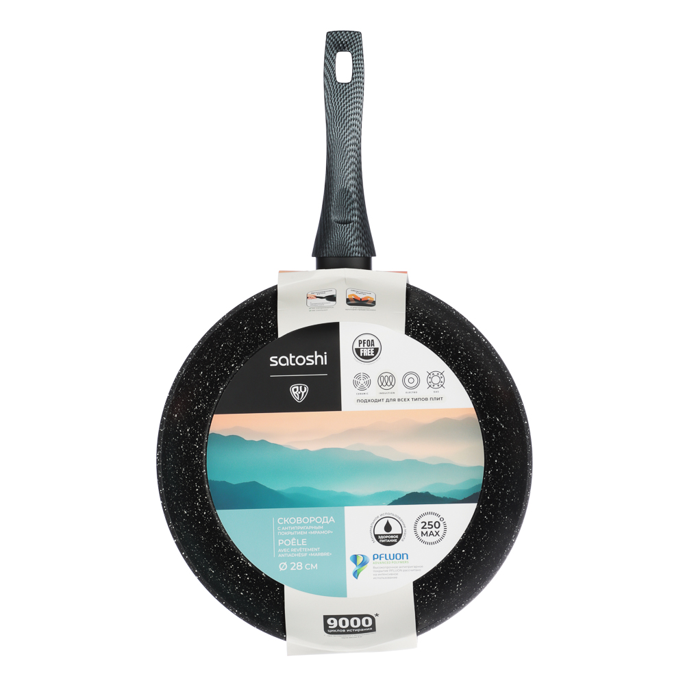 Сковорода SATOSHI "Карбон" диаметром 28 см выполнена из литого алюминия, что обеспечивает качественную равномерную прожарку продуктов. Рабочая поверхность сковороды защищена прочным антипригарным покрытием под мрамор, а снаружи нанесено термостойкое покрытие черного цвета. Отличительная особенность серии "Карбон" - это оригинальный графичный дизайн ручки черно-серого цвета. Сама ручка изготовлена из бакелита с силиконовым напылением, не нагревается и не скользит. Сковорода подходит для использования на всех видах плит, в том числе и индукционной плиты, а также для мытья в посудомоечной машине.
