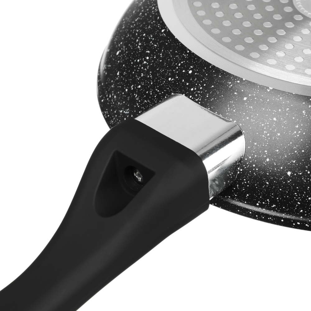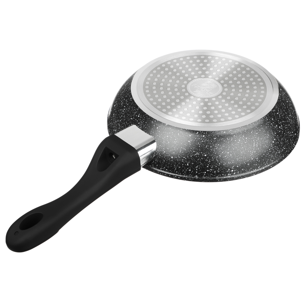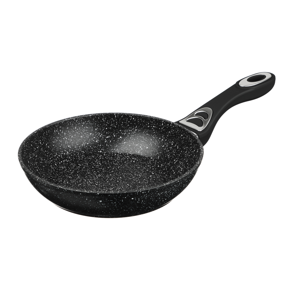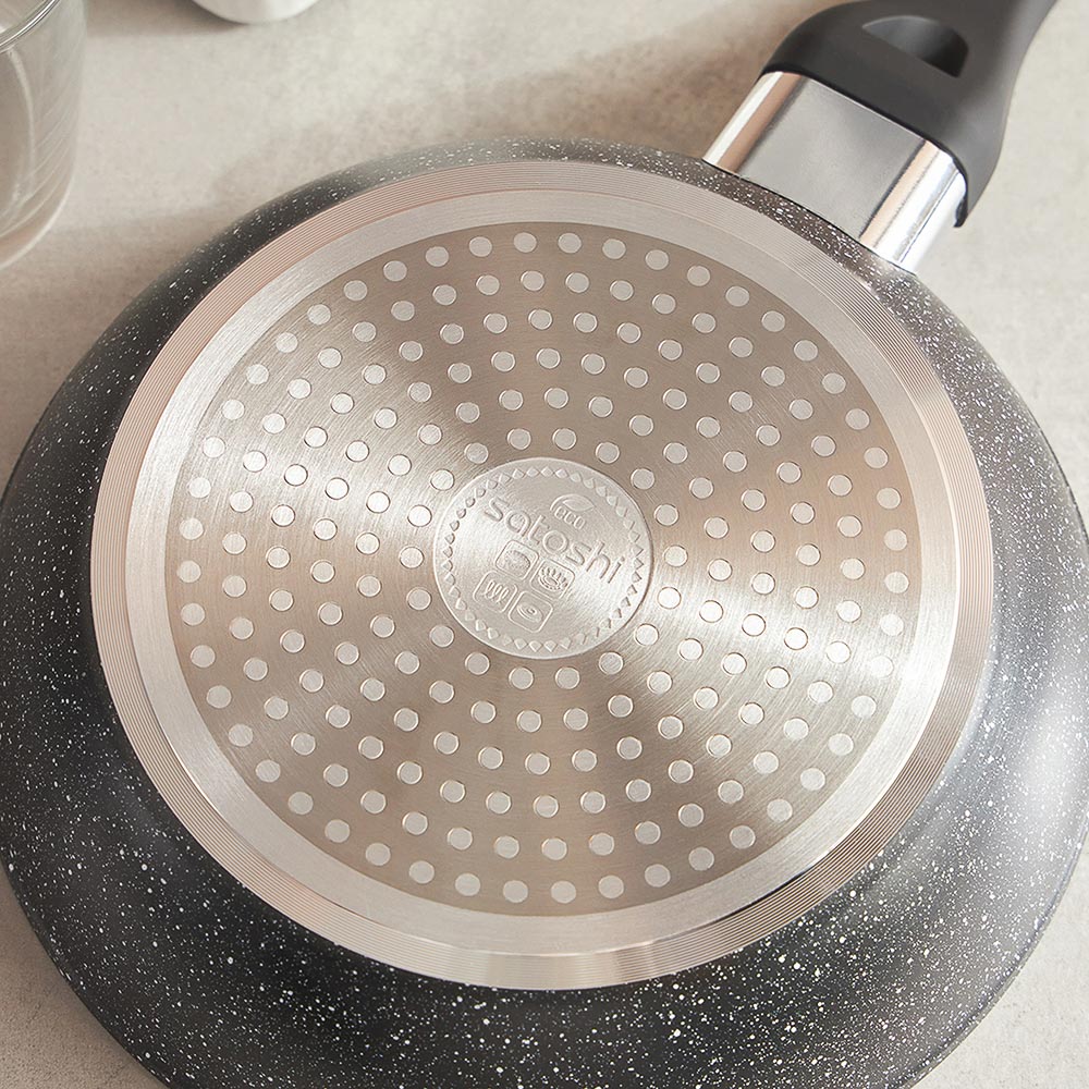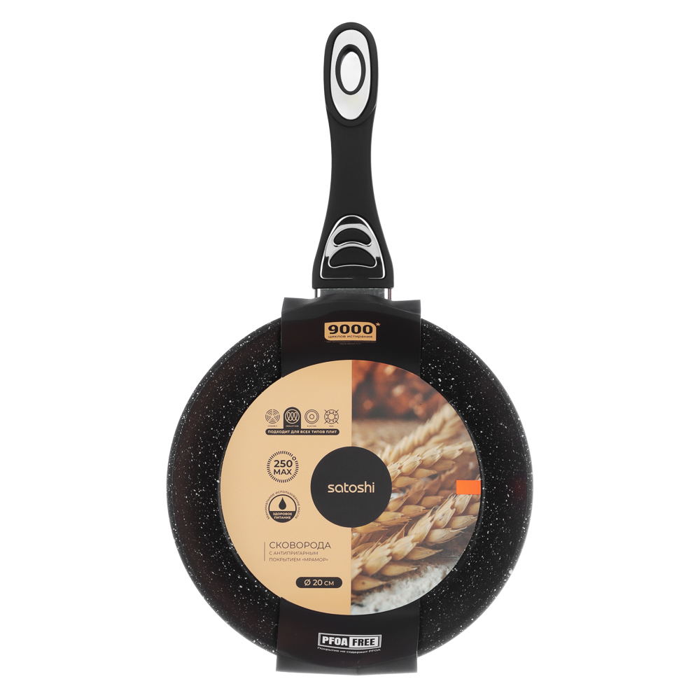 Увидев сковороду SATOSHI Танто диаметром 20 см сразу хочется отправиться к плите готовить! Привлекают внимание хромированные вставки на ручке посуды сковороды и дизайн покрытия под мрамор.Благодаря качественному антипригарному покрытию, готовить на такой сковороде можно практически без масла. А бакелитовая ручка с силиконовым напылением, не нагревается , что позволит вам больше не использовать прихватки! Для укомплектования кухни выбирайте любую плиту, потому что эта сковорода подходит для всех видов плит, в том числе и для индукционной.Готовить с удовольствием легко, если вы выбираете сковороду серии Танто!