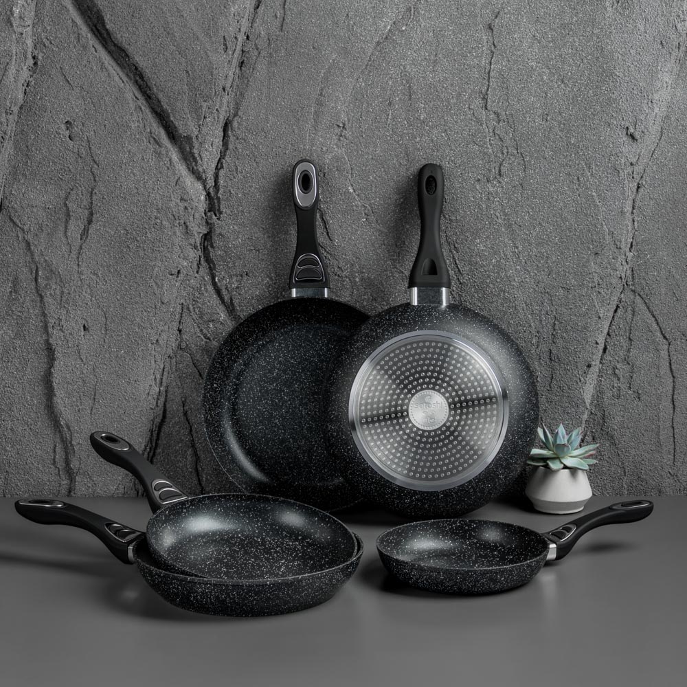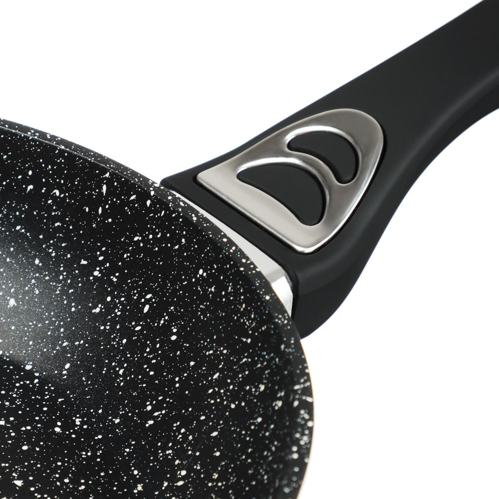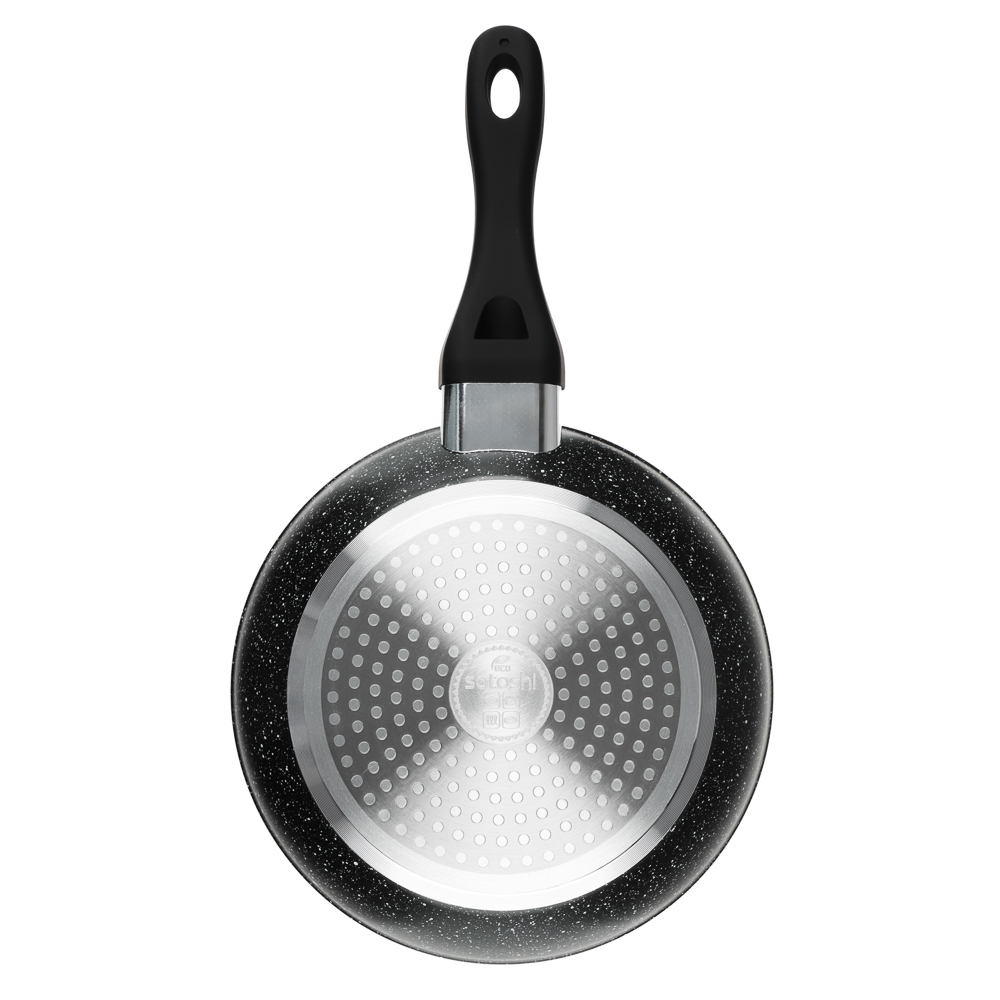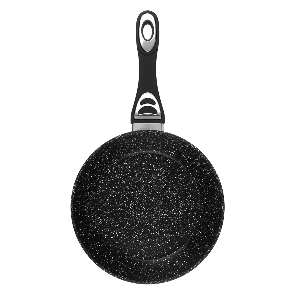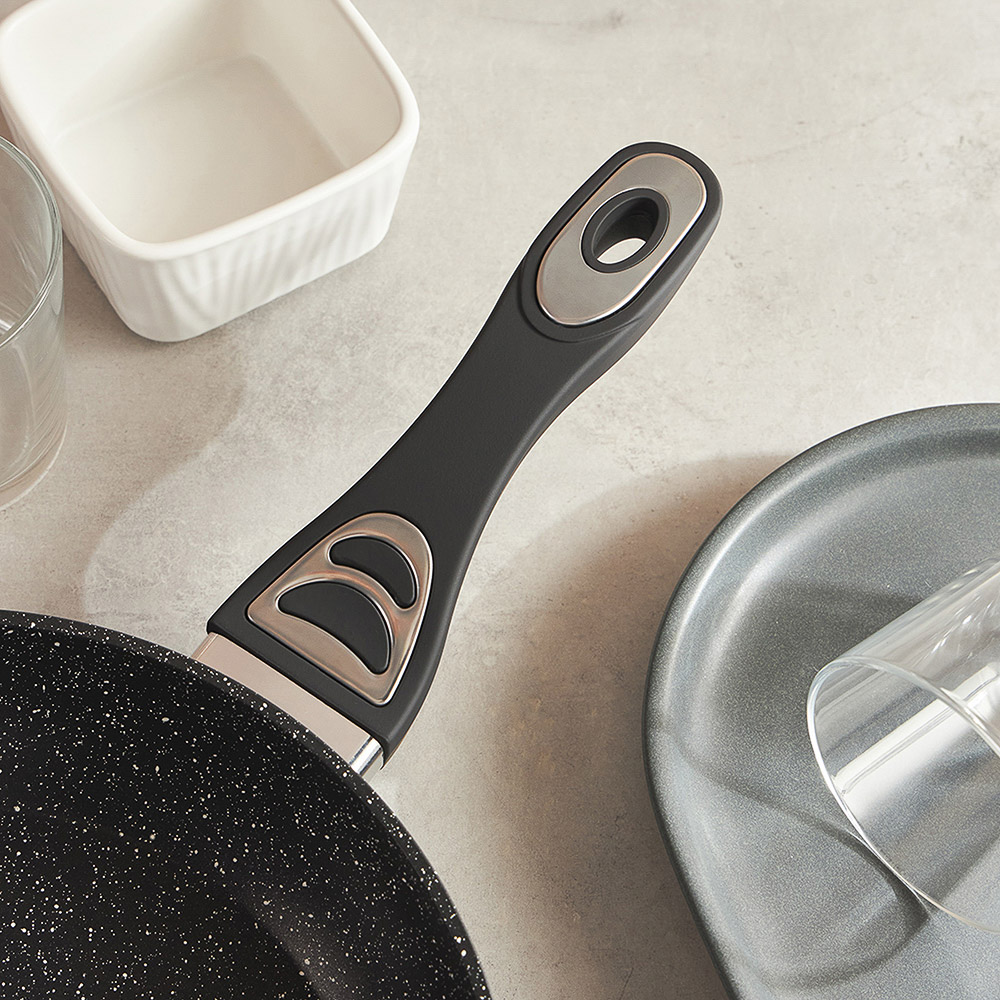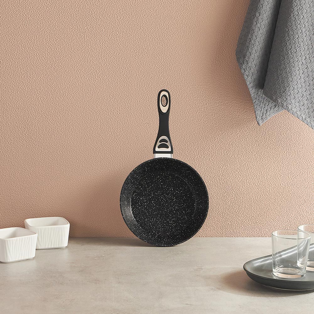 Увидев сковороду SATOSHI Танто диаметром 20 см сразу хочется отправиться к плите готовить! Привлекают внимание хромированные вставки на ручке посуды сковороды и дизайн покрытия под мрамор.Благодаря качественному антипригарному покрытию, готовить на такой сковороде можно практически без масла. А бакелитовая ручка с силиконовым напылением, не нагревается , что позволит вам больше не использовать прихватки! Для укомплектования кухни выбирайте любую плиту, потому что эта сковорода подходит для всех видов плит, в том числе и для индукционной.Готовить с удовольствием легко, если вы выбираете сковороду серии Танто!
