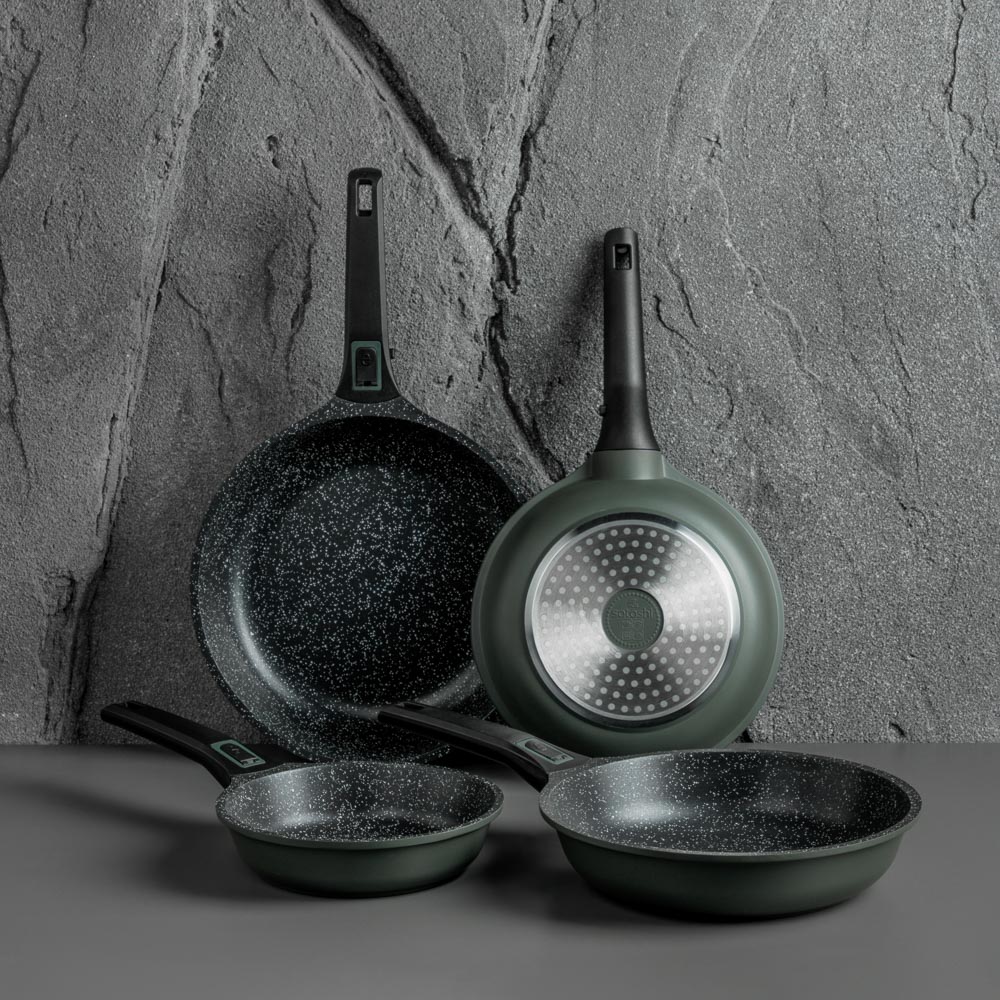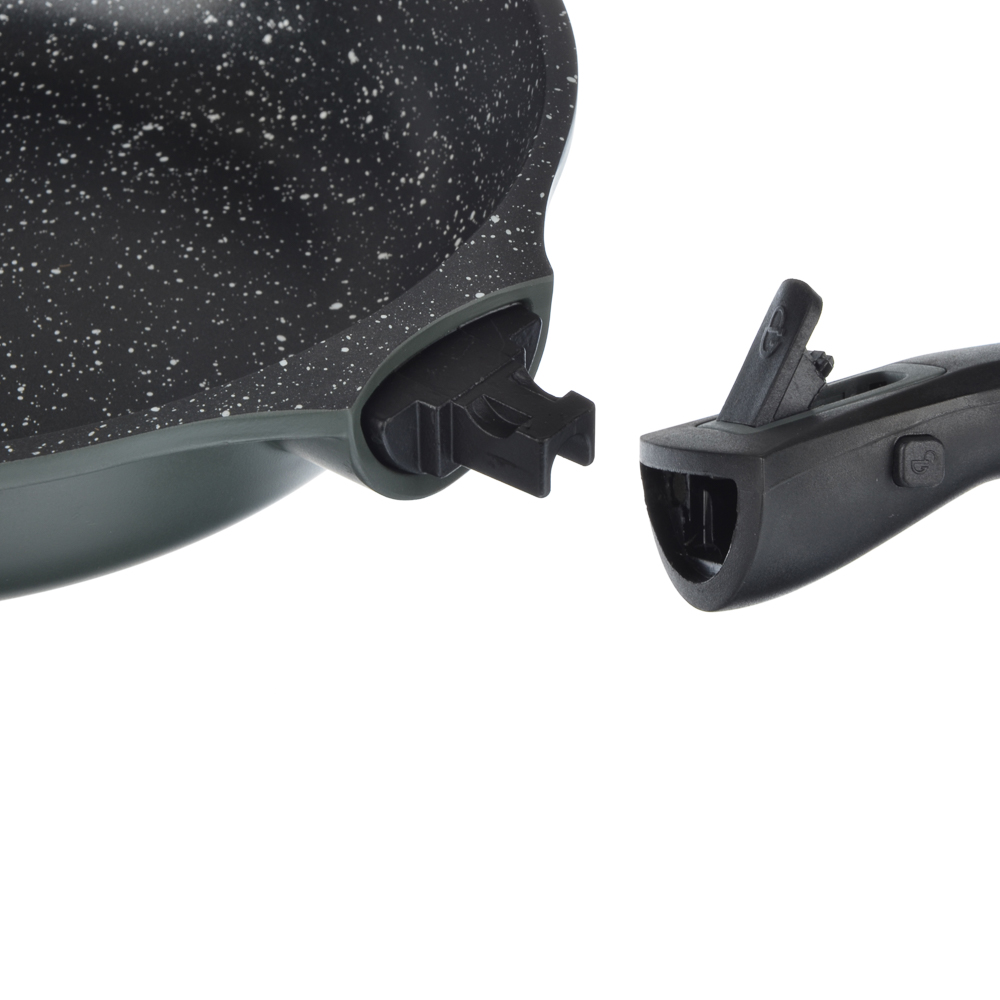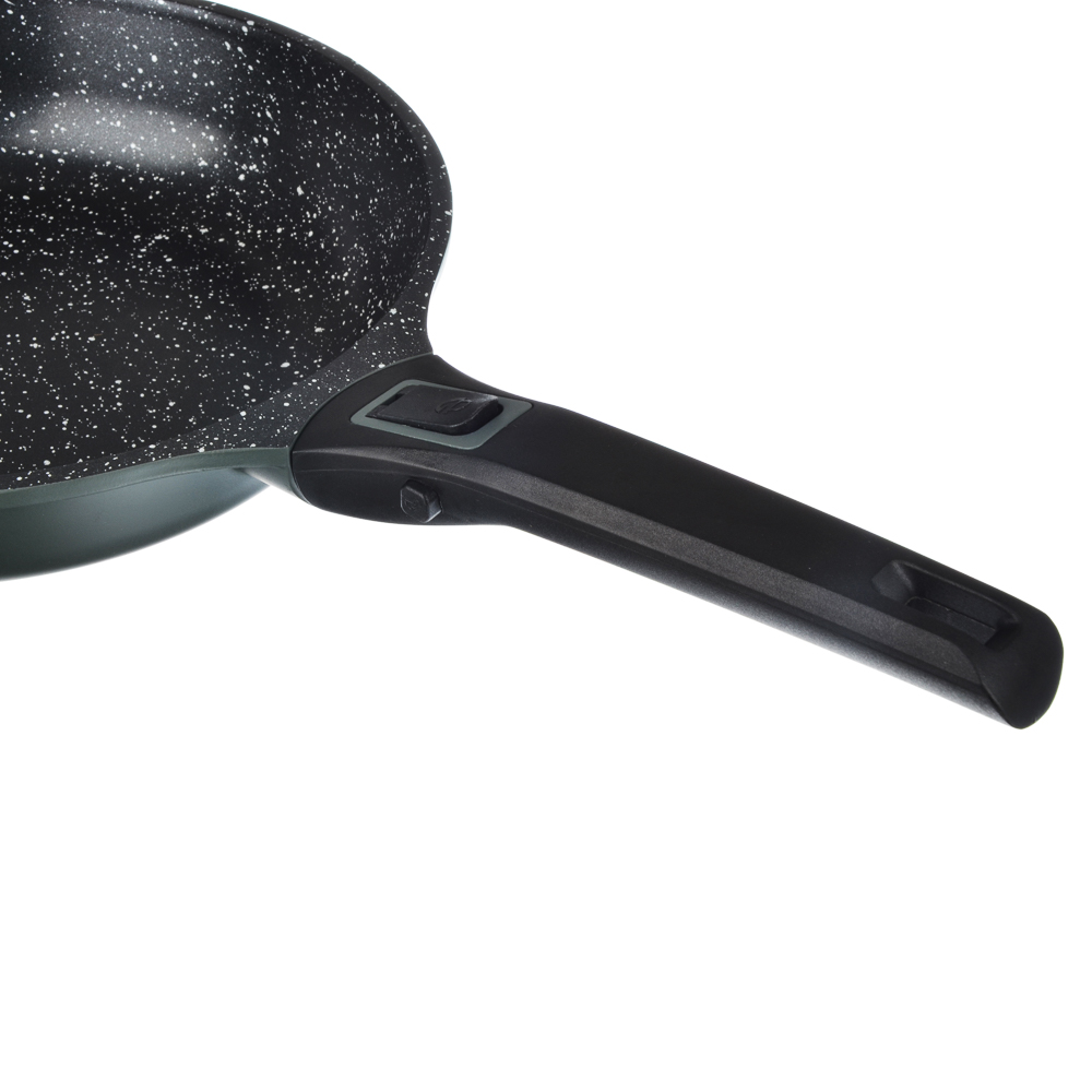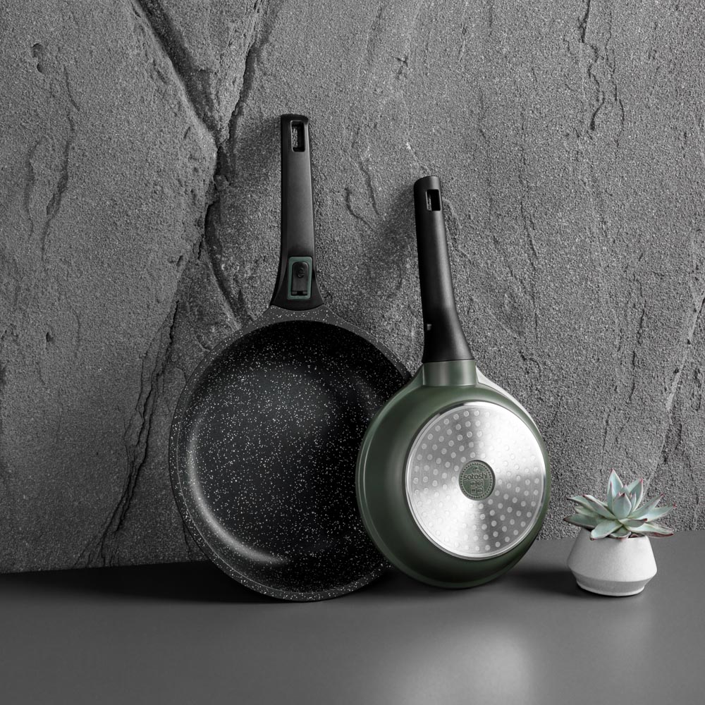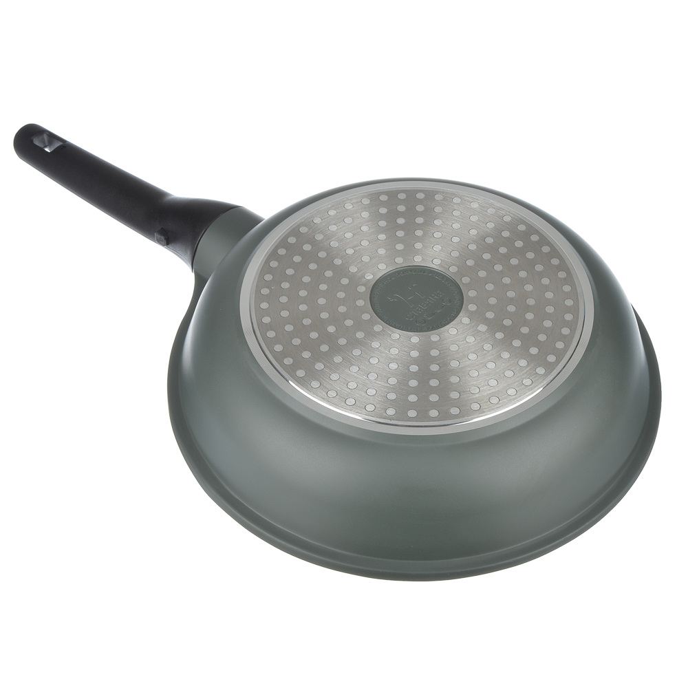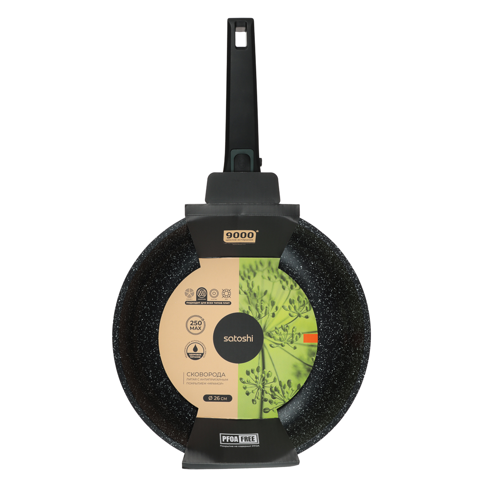 Серия антипригарной посуды «Уран» от бренда SATOSHI отличается уникальным антипригарным покрытием с оригинальным рисунком. Высокопрочное покрытие посуды не позволяет пище пригорать и прилипать к поверхности. Сковорода оснащена удобной бакелитовой ручкой со съемным механизмом, благодаря чему можно использовать ее в духовке, для запекания. Основа сковороды – литой алюминий, который обеспечивает равномерный нагрев на любых типах плит, включая индукционные. Диаметр 26 см.