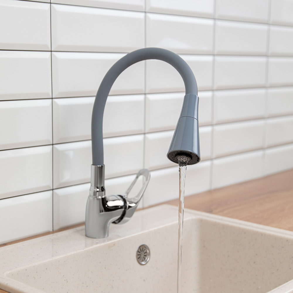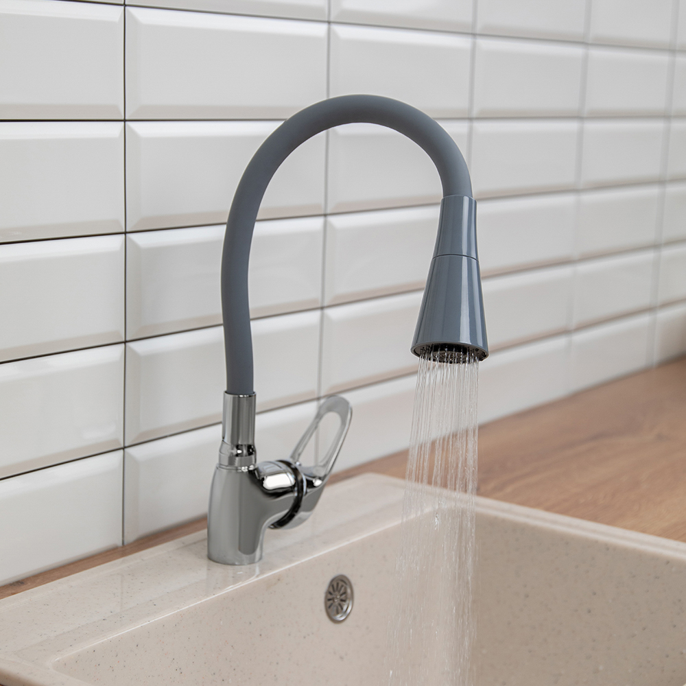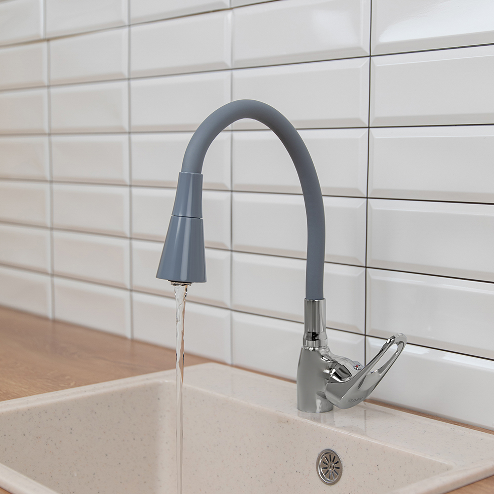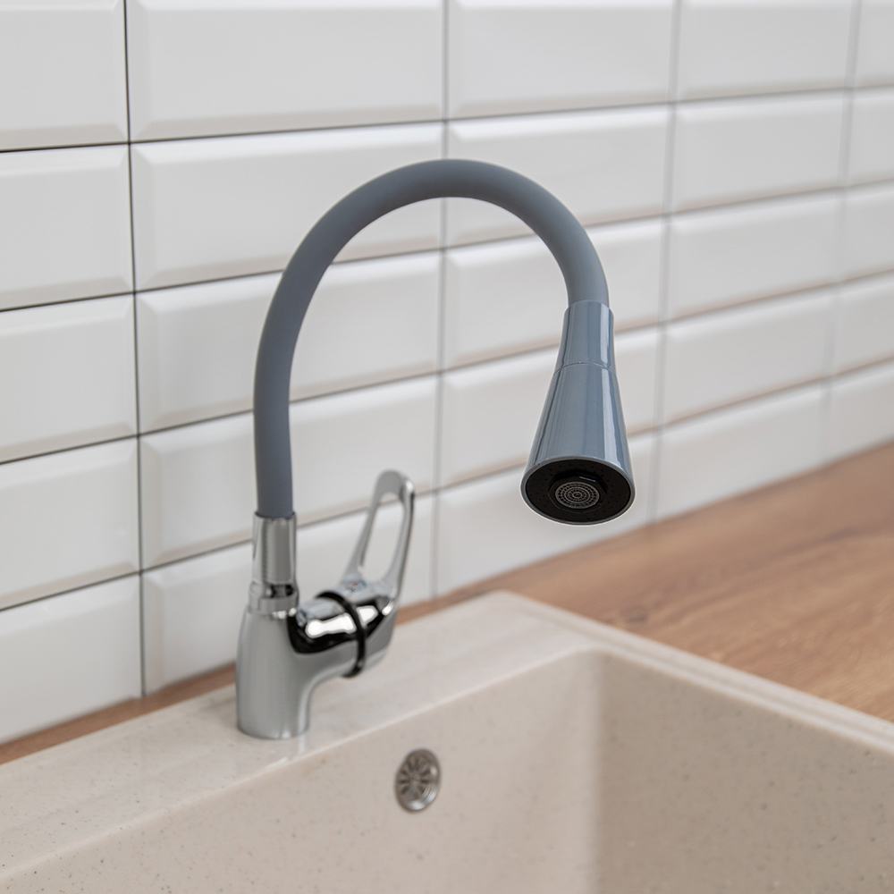 Смеситель для кухни Веста от RAIN серого цвета оснащен надежным керамическим картриджем 35 мм, который рассчитан на длительный срок эксплуатации. Имеет силиконовый излив, который добавляет комфорта во время использования: гибкий кран можно регулировать во все стороны, а также по высоте. Корпус из латуни отличается износостойкостью и не подвержен образованию ржавчины. Современный рычажный механизм удобен для регулировки температуры воды и величины потока. Стильный и лаконичный дизайн впишется в интерьер любой кухни.