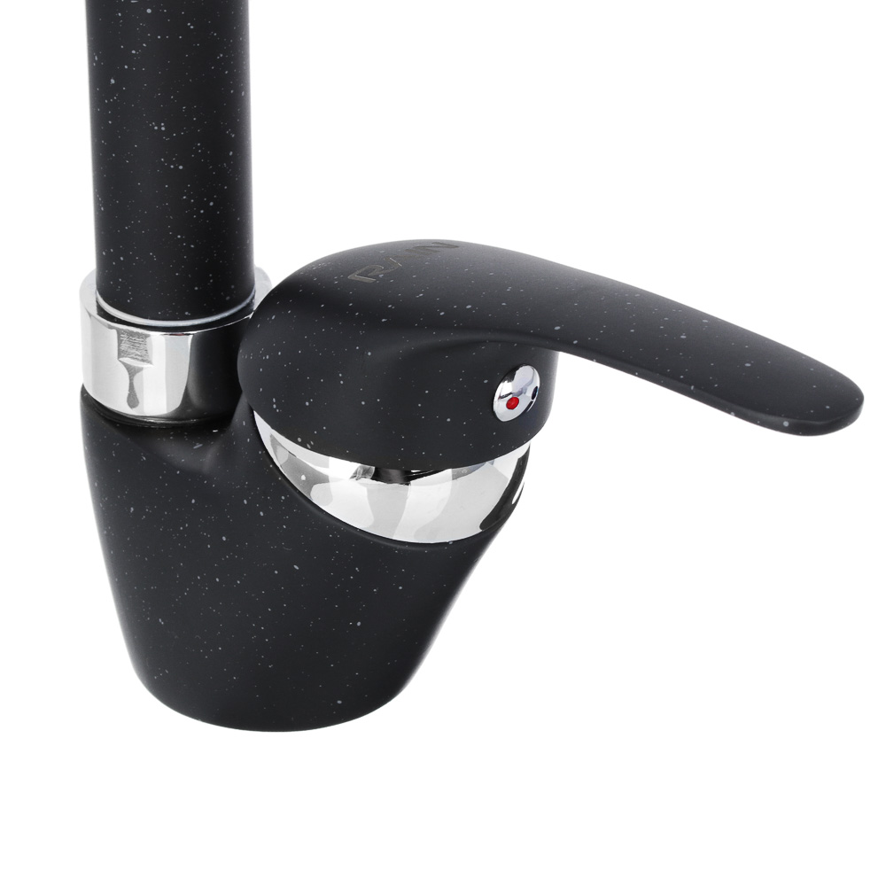 Смеситель для кухни RAIN «Веста» с высоким изливом – идеальное решение для современной кухни. Высокий излив позволяет комфортно мыть посуду и продукты, а также набирать воду. Черный цвет с фактурой «под гранит» смотрится оригинально и гармонично вписывается в любой интерьерный стиль. Корпус из латуни не боится коррозии, устойчив к протечкам. Надежное покрытие не царапается и легко очищается от налета и брызг. Однорычажное управление позволяет быстро настраивать напор и температуру воды буквально одним плавным движением. Керамический картридж 35 мм работает безотказно. Комплект включает крепеж и гибкую подводку 50 см. Гарантия – 7 лет.