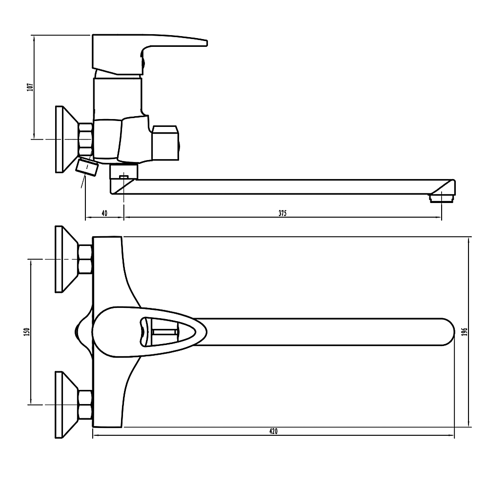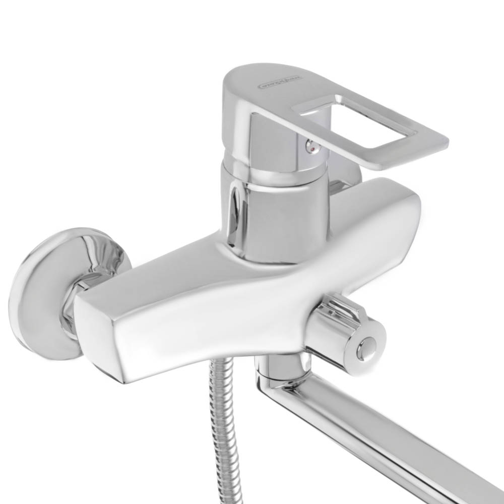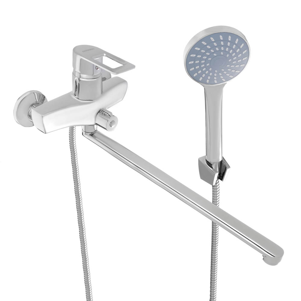 Смеситель для ванны с душем СоюзКран. Прямой излив длиной 40 см - подходит для широких и угловых ванн, удобно набирать воду в тазы. Однорычажный: воду регулируют одной рукой. Керамический картридж 40 мм: большой напор воды - удобно, чтобы быстро наполнить ванну; работает бесшумно; регулирует воду при легком повороте рычага. Хромированный. Сделан из цинка: служит короткий срок - подходит, как временный смеситель для ванны; портится от резких перепадов температуры воды - меняйте температуру плавно.